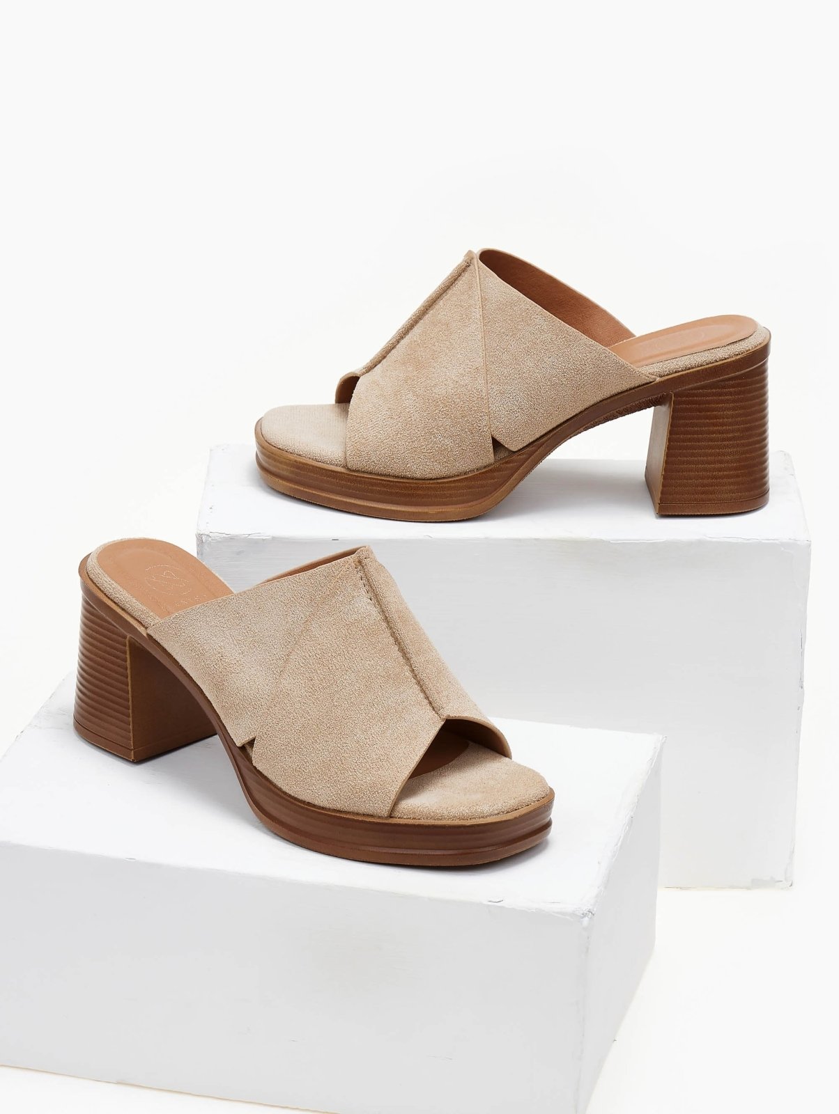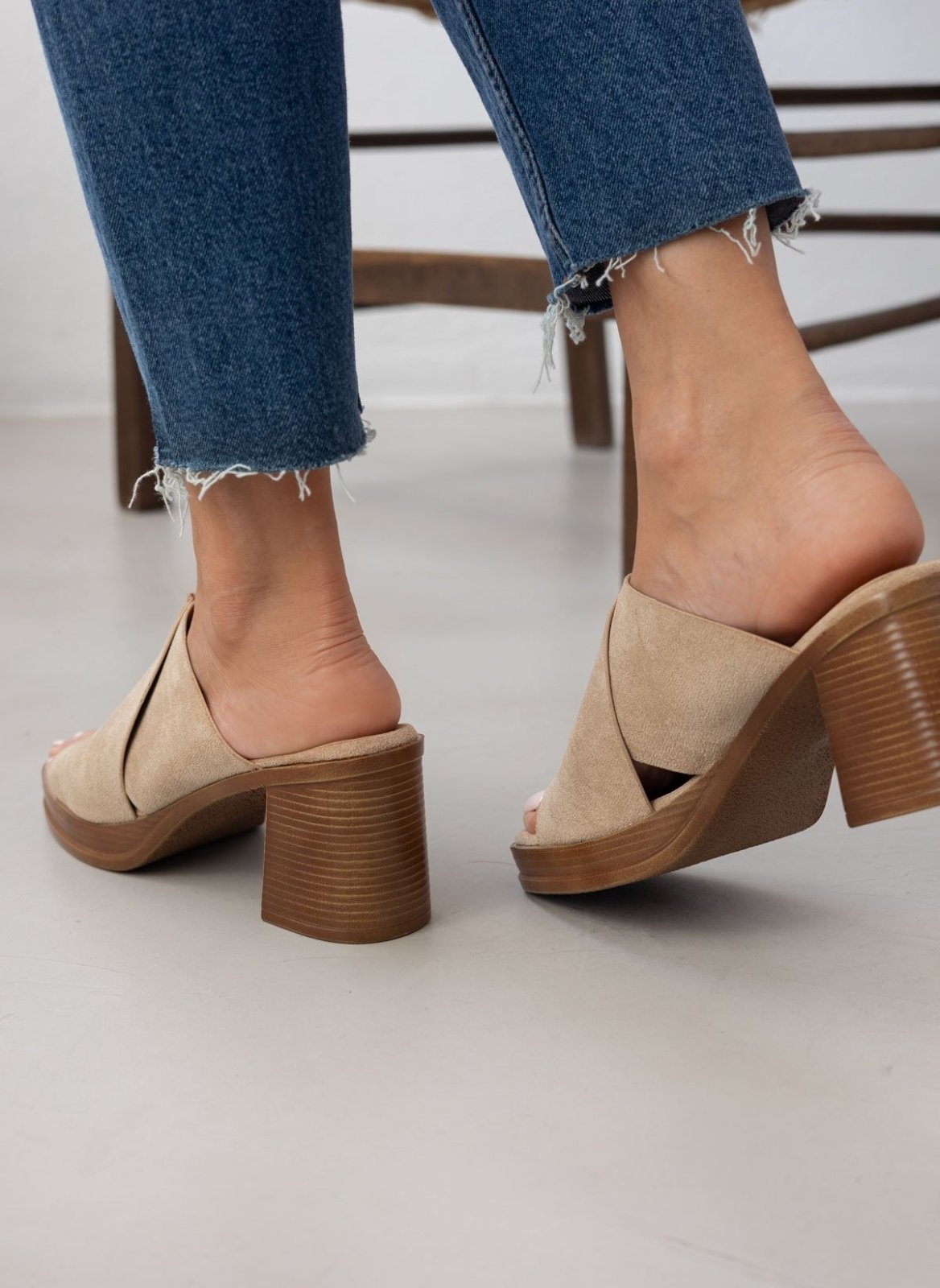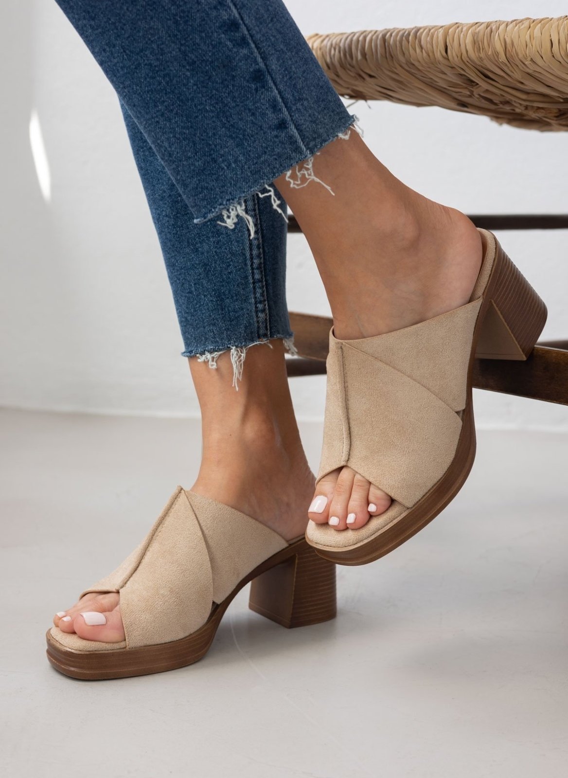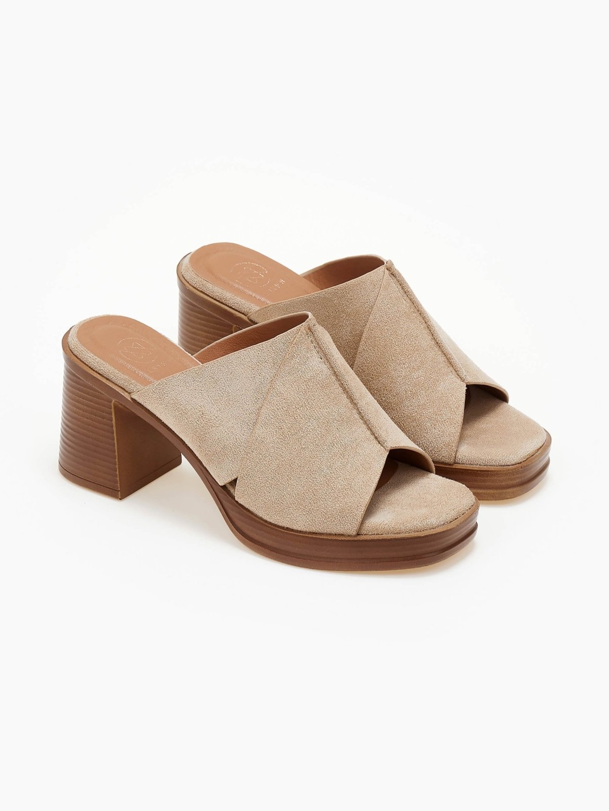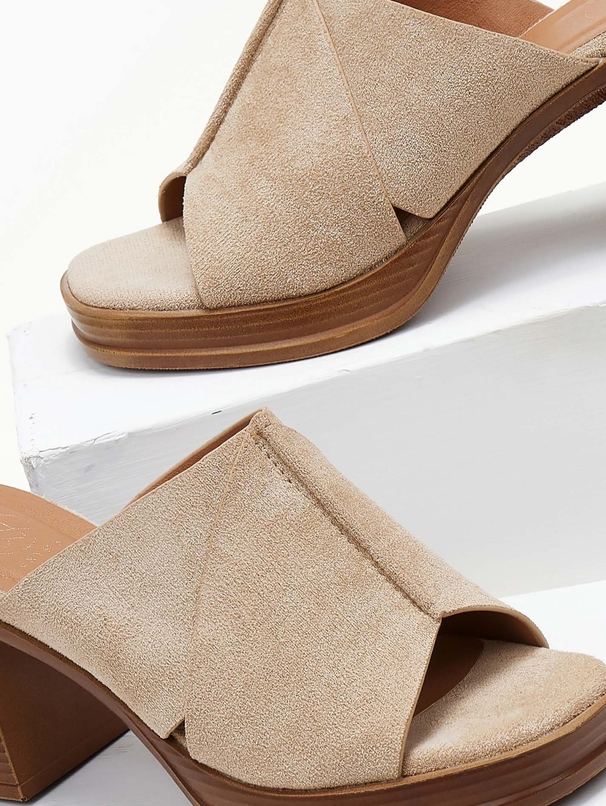 Mules με φαρδιά suede φάσα ERYNN. Έχουν μικρά ανοίγματα στο πλάι. Ψηλό χοντρό τακούνι με φιάπα.Ελαφριά σόλα.