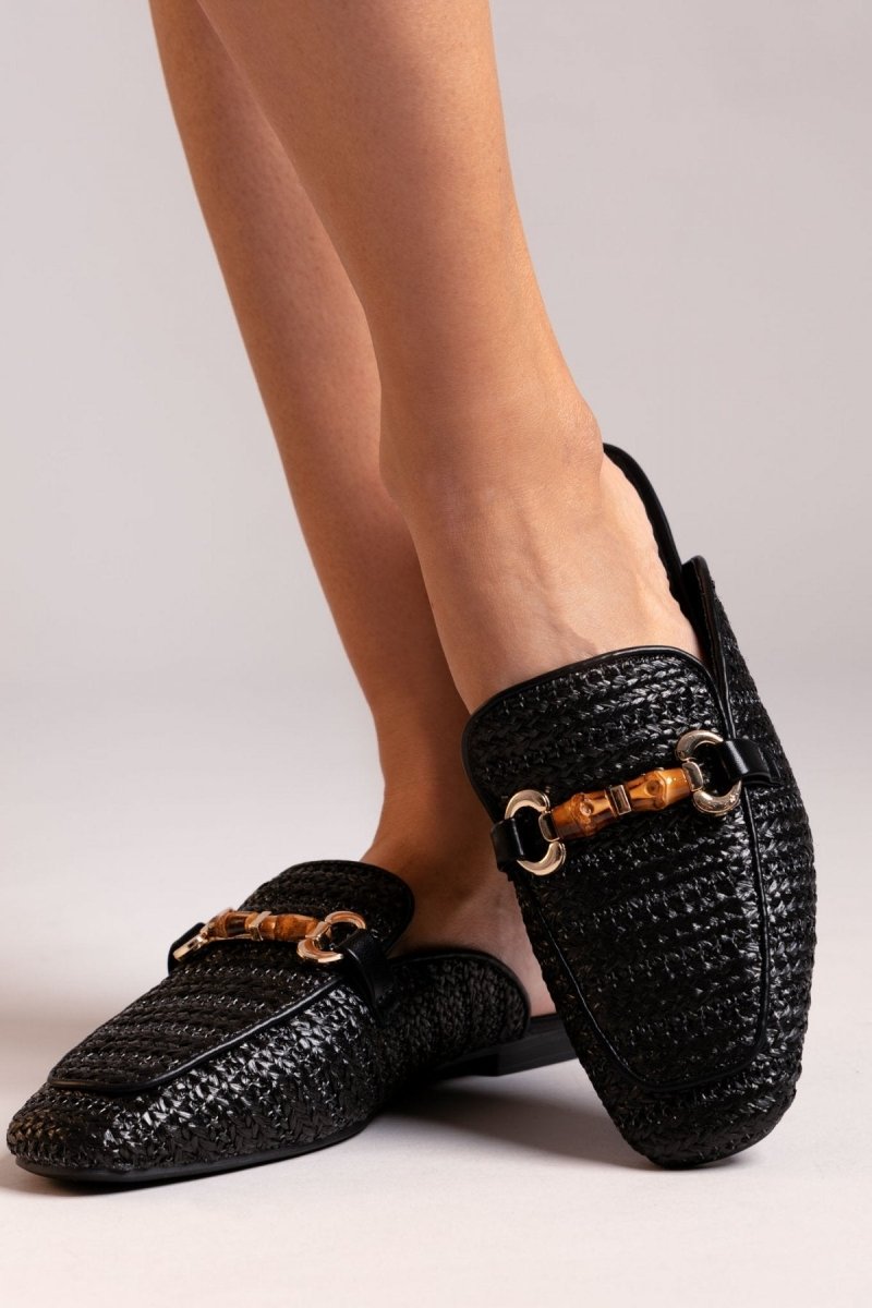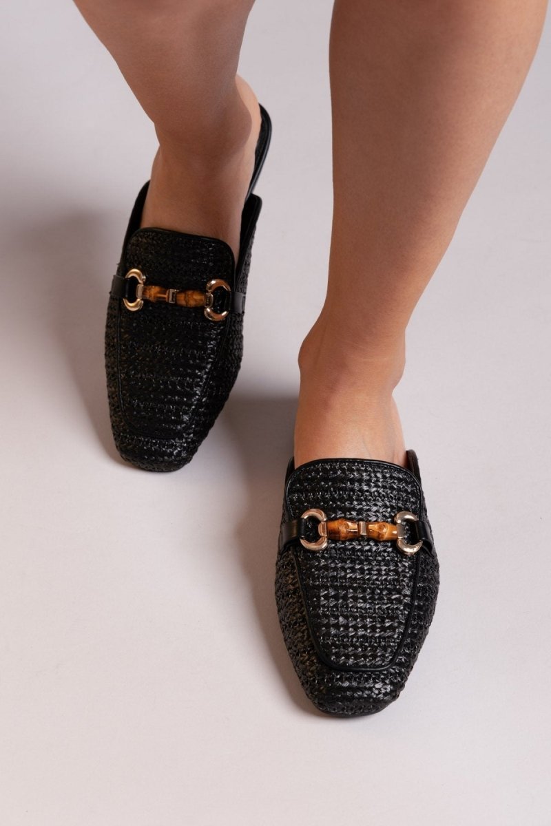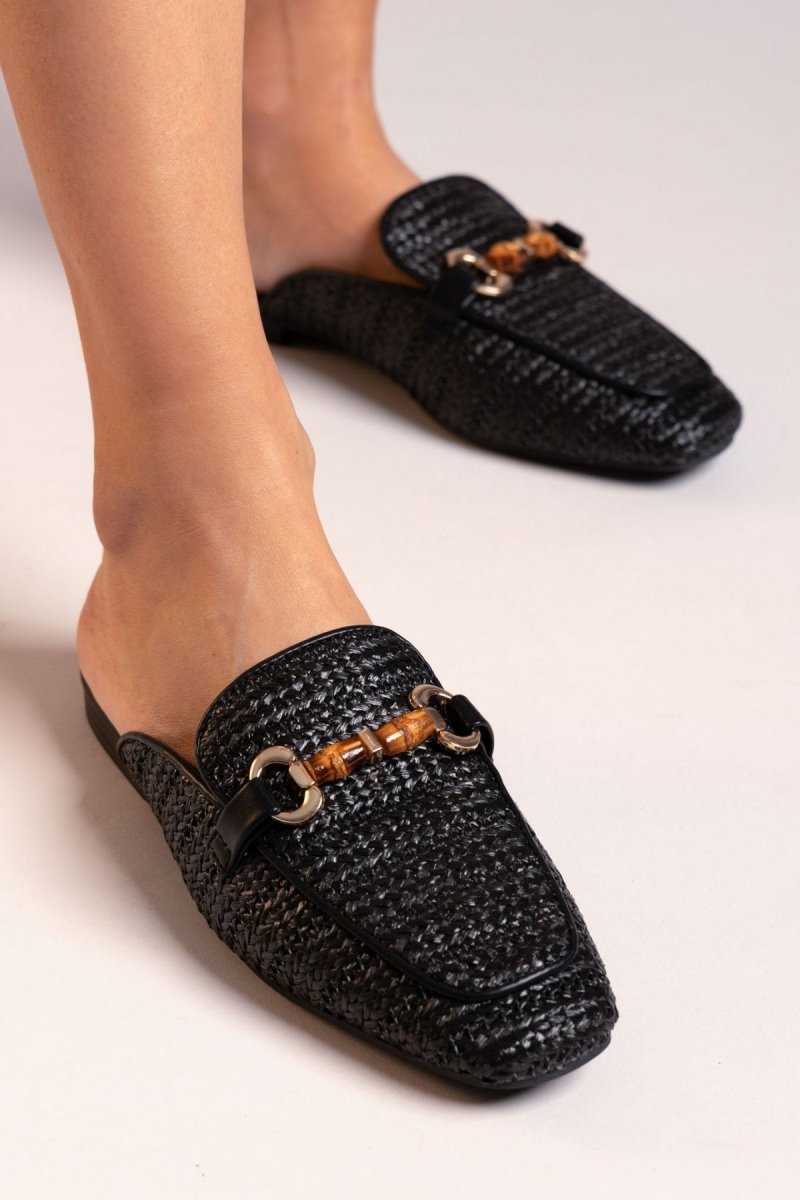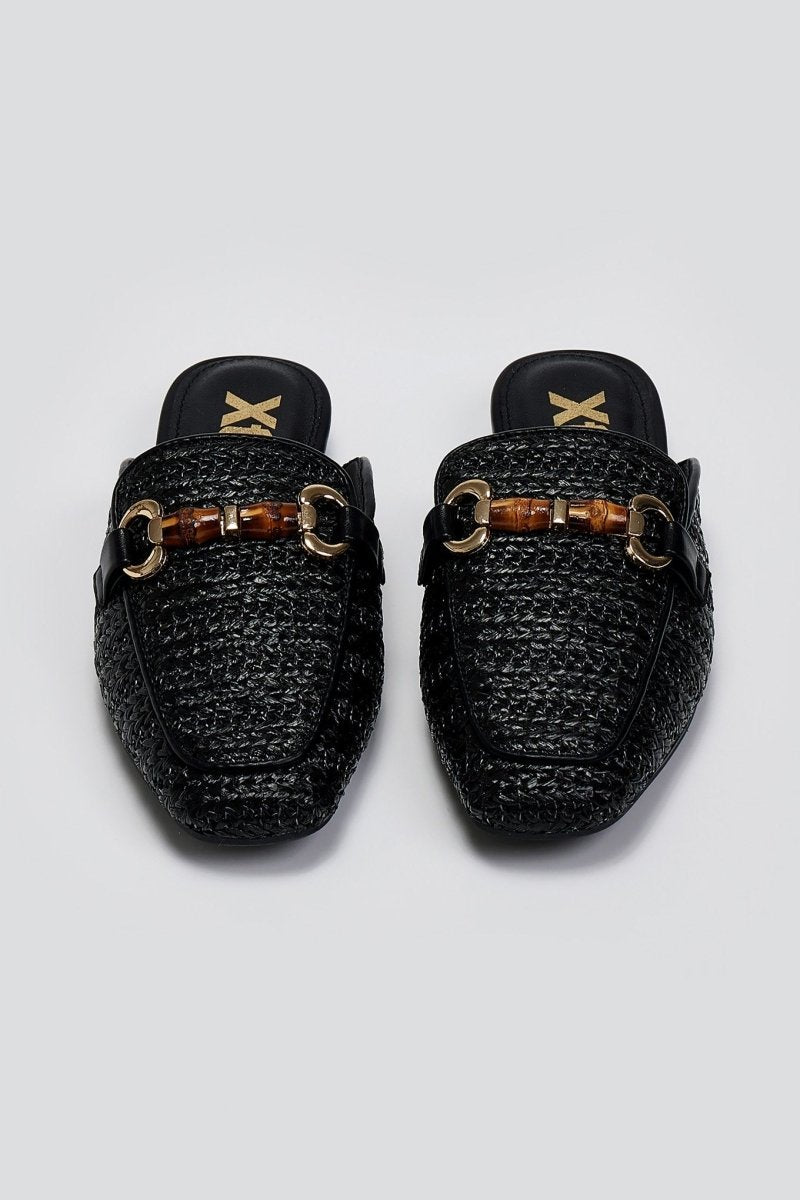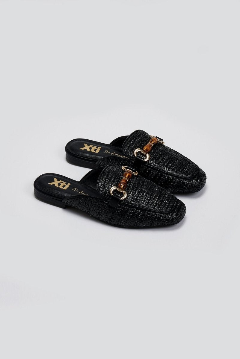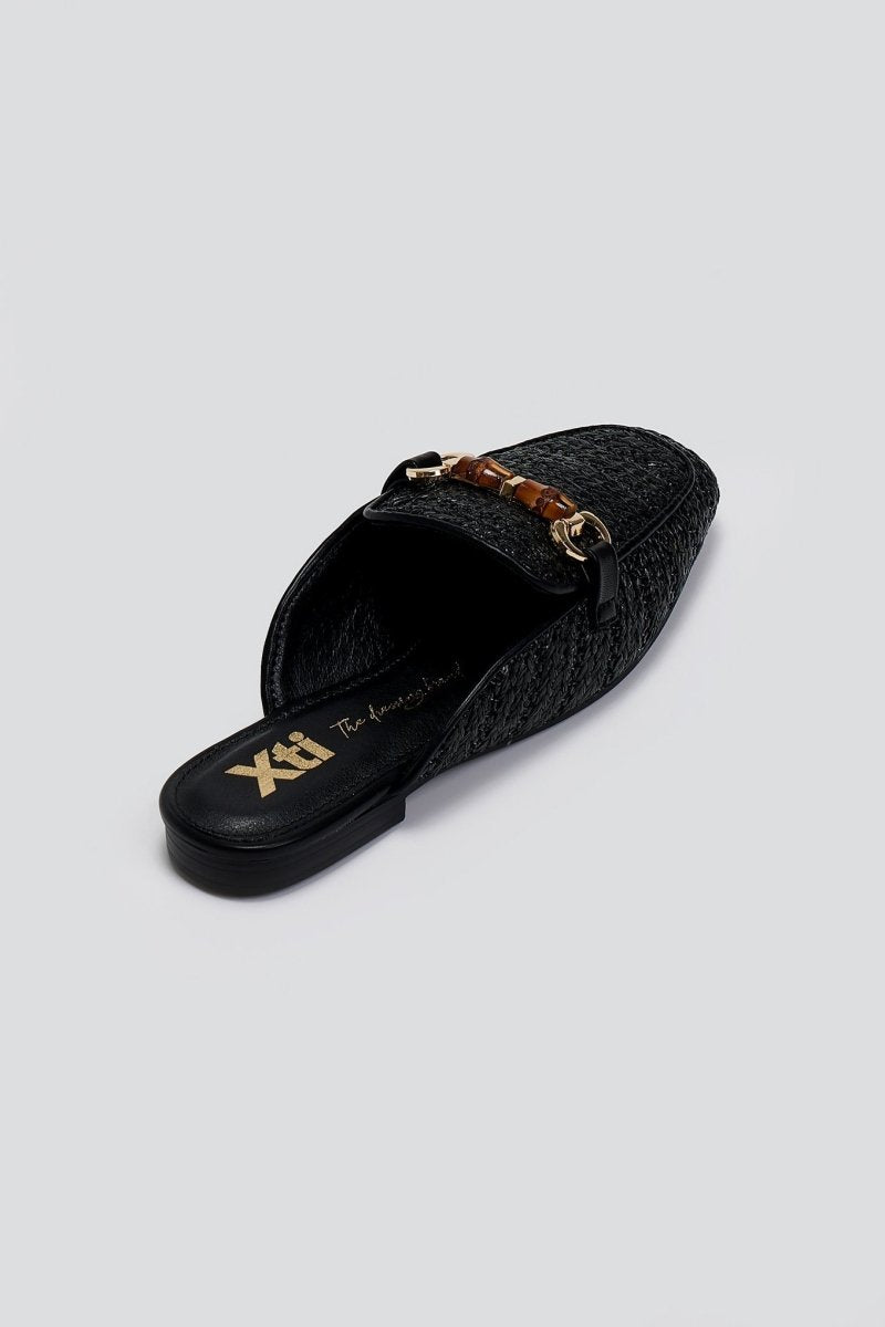 Mules κλειστά από ψάθα με πλεκτό σχέδιο Xti. Ζωνάκι στο επάνω μέρος με κοκάλινο διακοσμητικό και μεταλλική λεπτομέρεια. Comfort biotech μαλακός πάτος με memory foam. Peta Vegan approved.