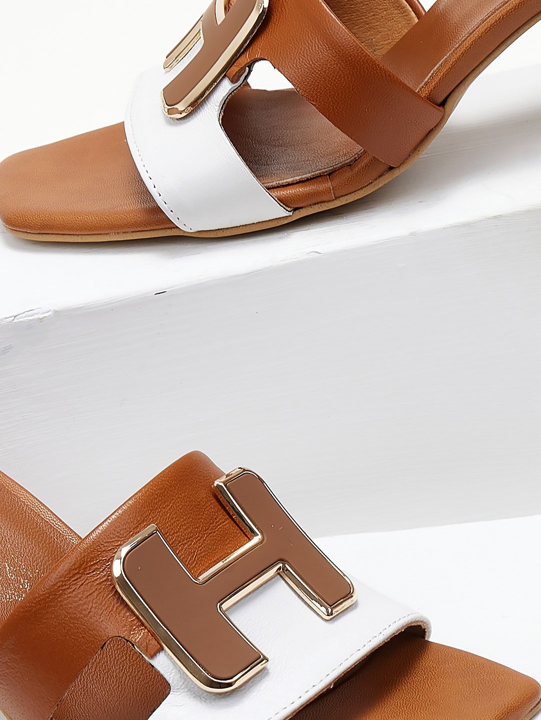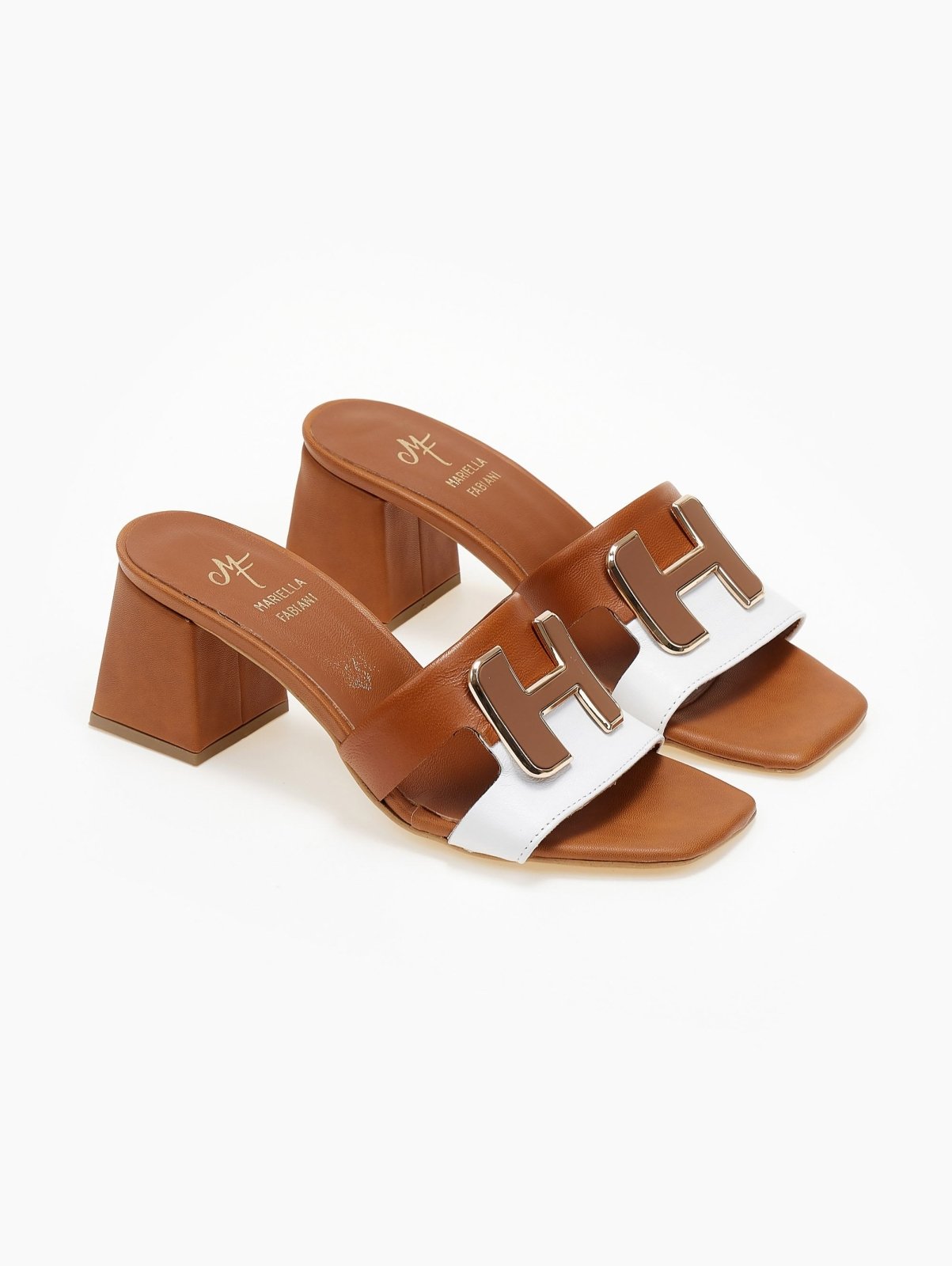 Mules από γνήσιο δέρμα Mariella Fabiani. Φάσα με cut outs στα πλαϊνά και διχρωμία. Μεταλλικό διακοσμητικό. Δερμάτινος πάτος. Χαμηλό τετράγωνο τακούνι.