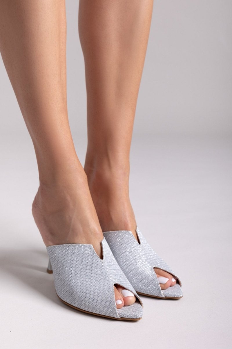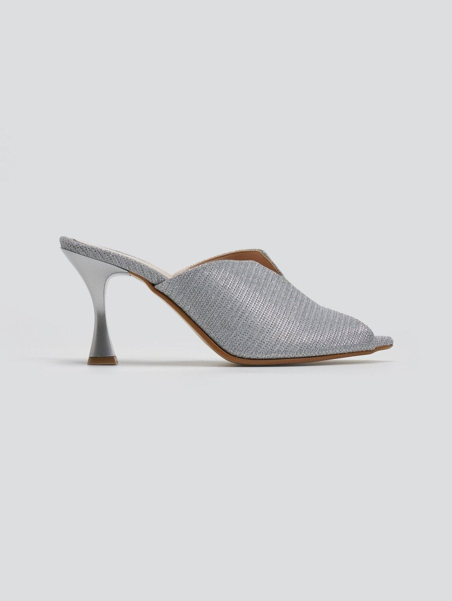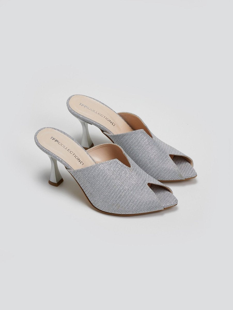 Mules ανοιχτά από γκλίτερ ύφασμα Tfp. Σχέδιο με v cut άνοιγμα στο επάνω μέρος. Λεπτό τακούνι. Δερμάτινος πάτος. Ελληνικής κατασκευής.
