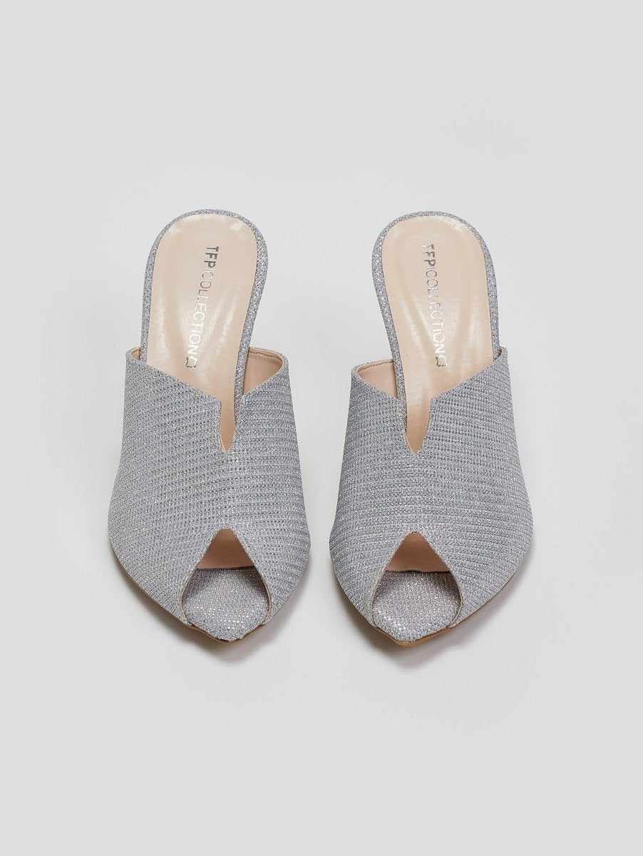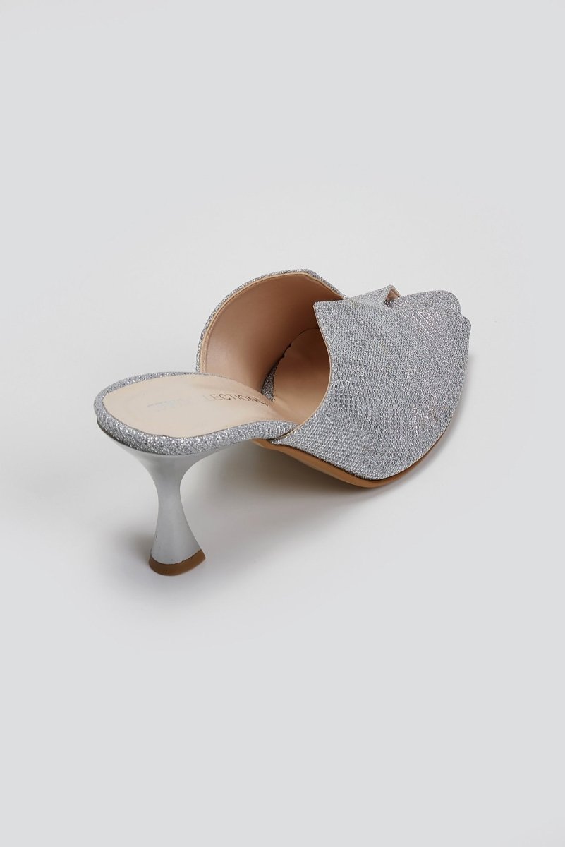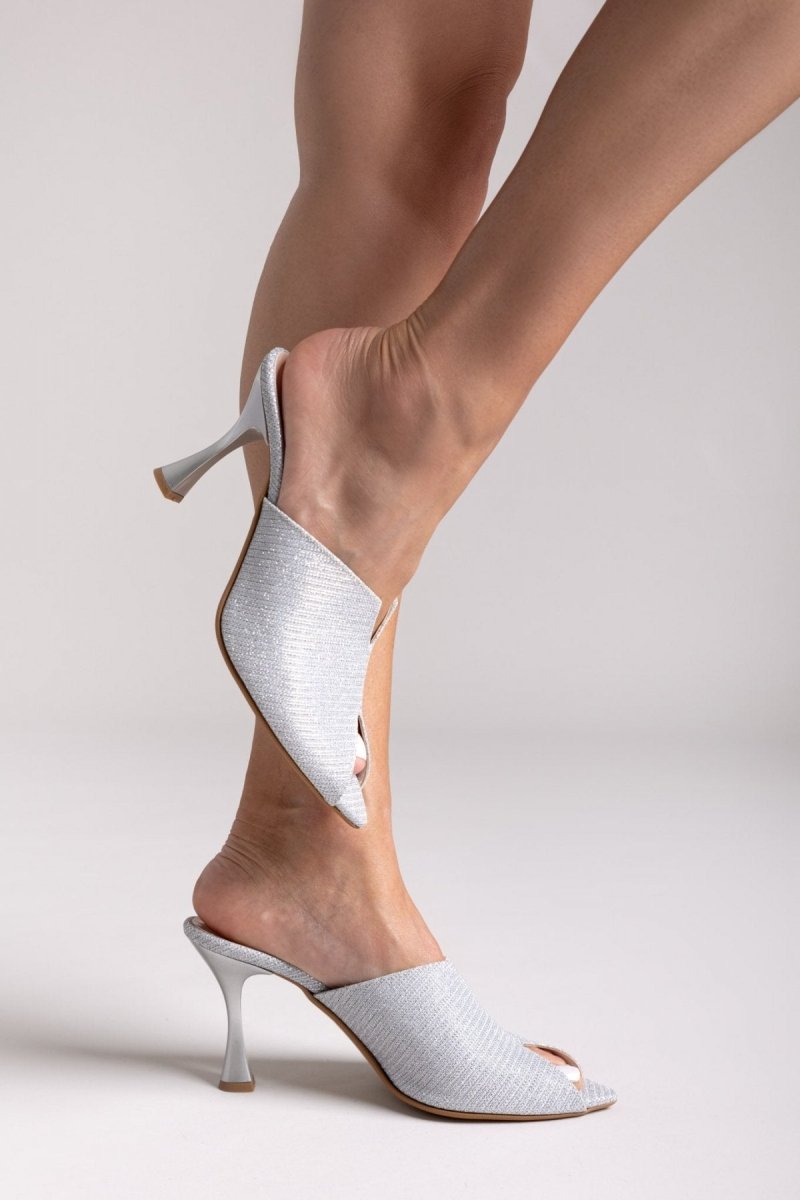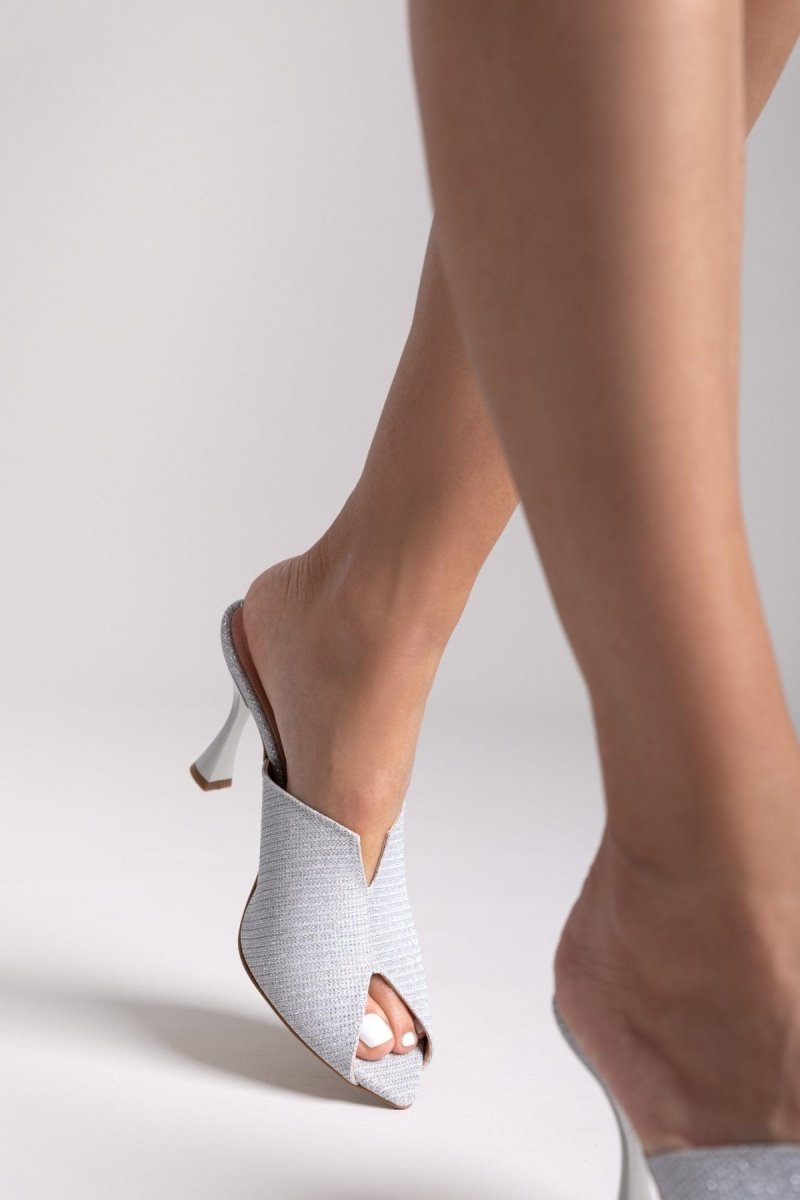 Mules ανοιχτά από γκλίτερ ύφασμα Tfp. Σχέδιο με v cut άνοιγμα στο επάνω μέρος. Λεπτό τακούνι. Δερμάτινος πάτος. Ελληνικής κατασκευής.