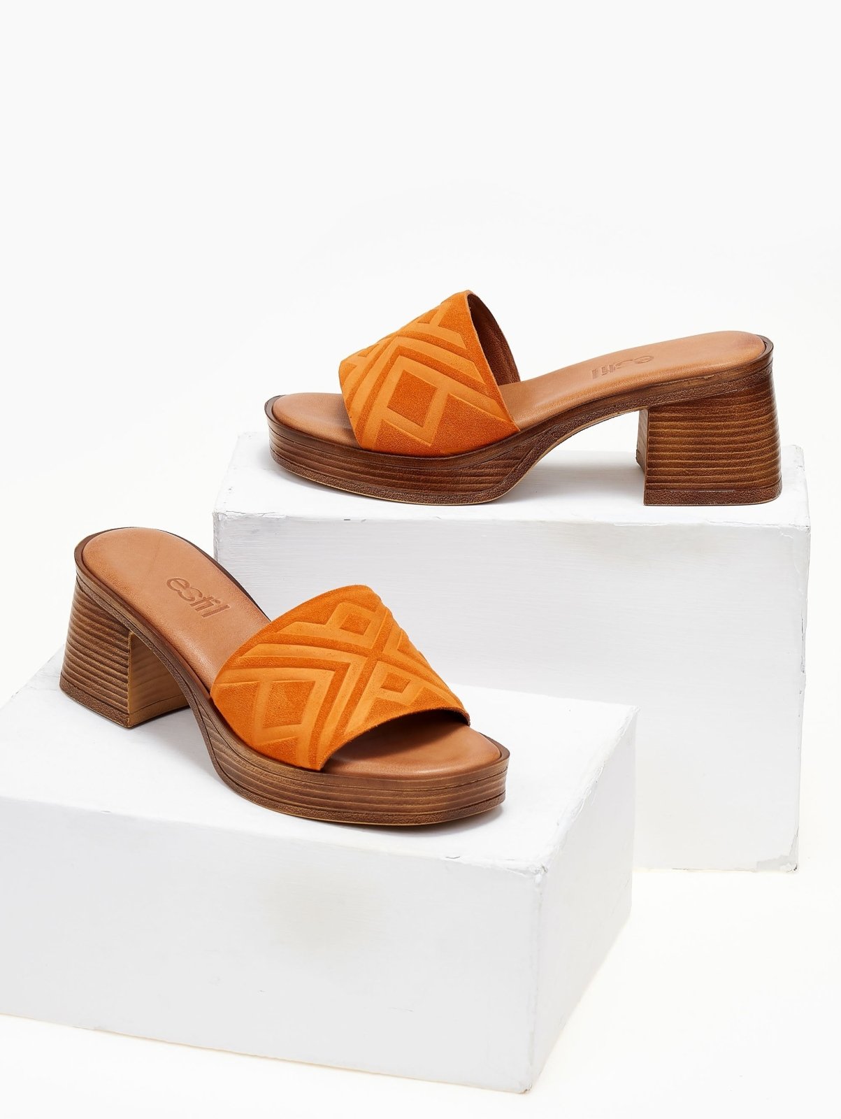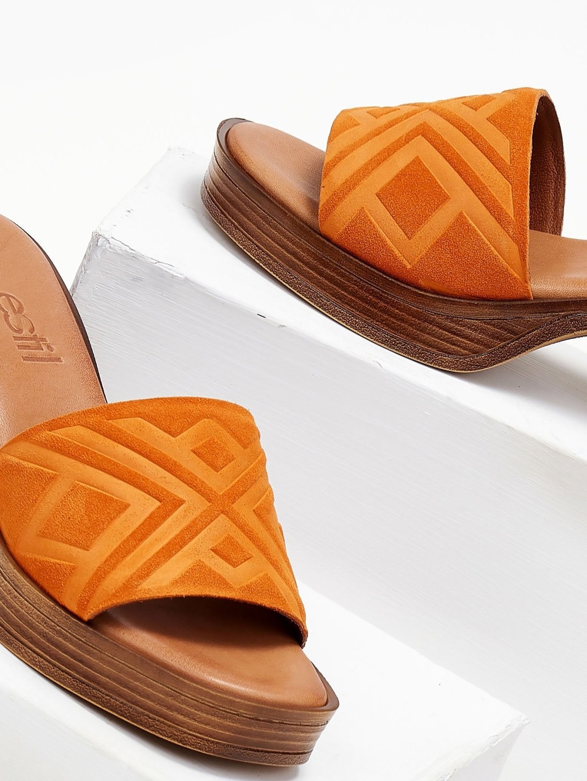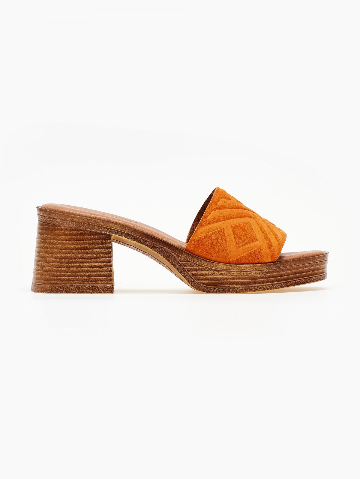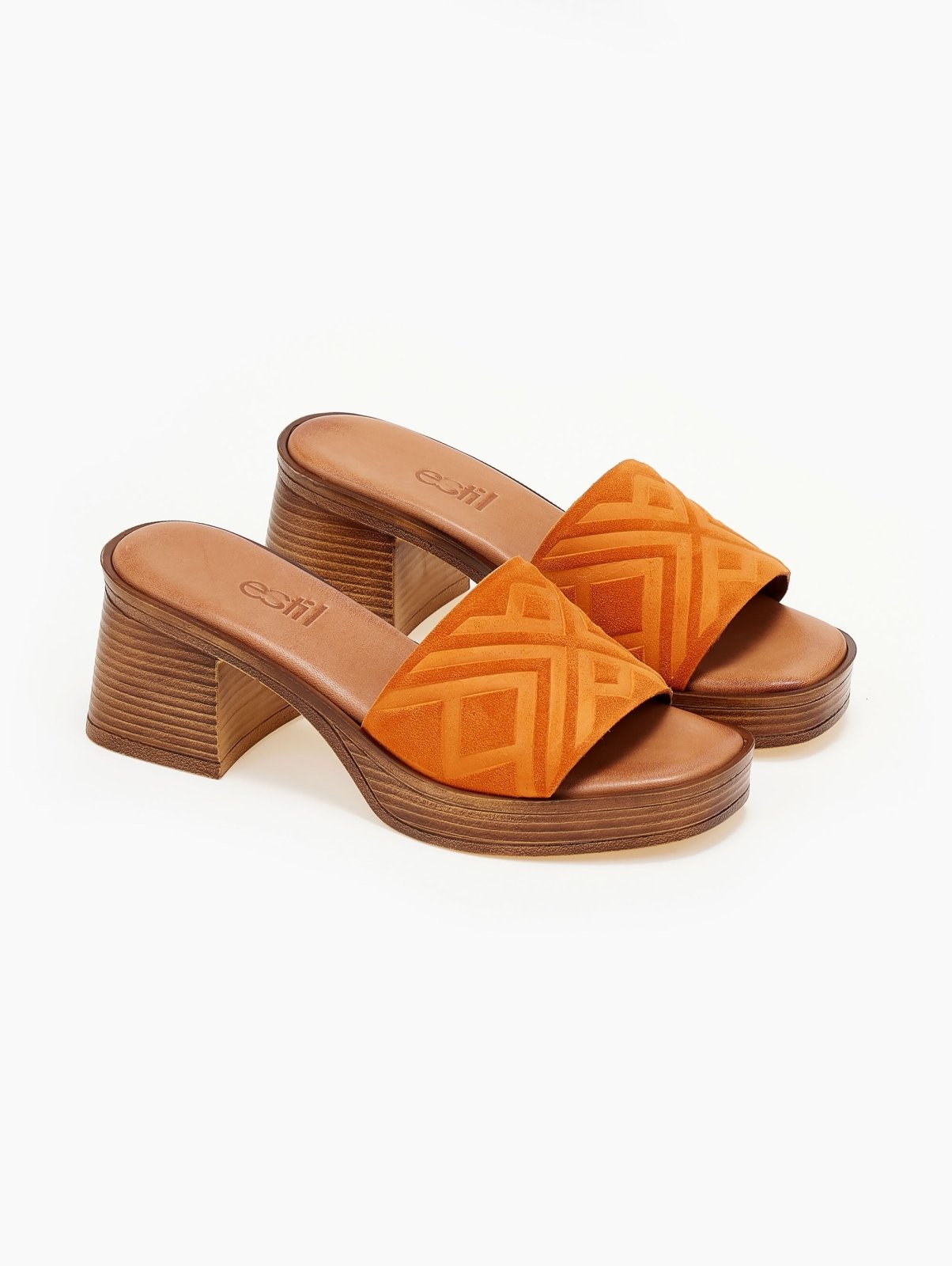 Mules ανοιχτά καστόρινα estil. Χοντρό τετράγωνο τακούνι με εφε ξύλου. Μαλακός δερμάτινος πάτος. Καρε γραμμή. Ελληνικής κατασκευής.