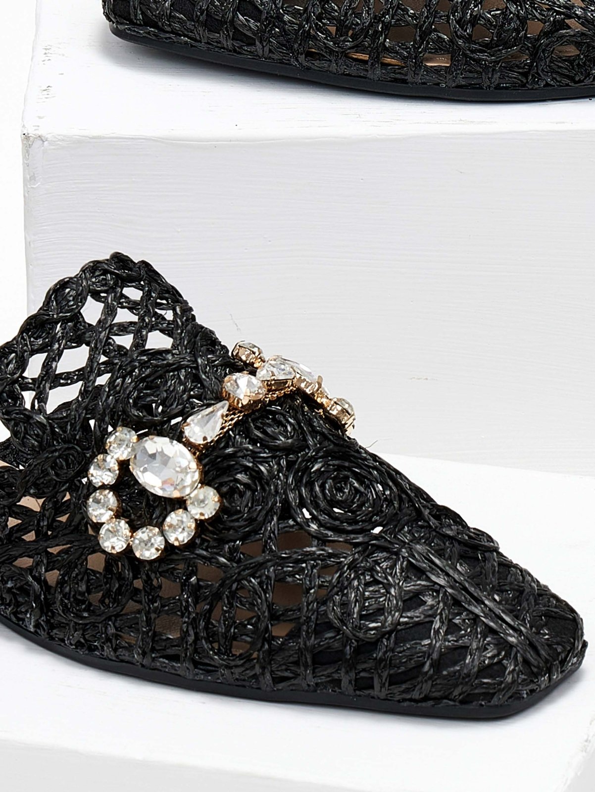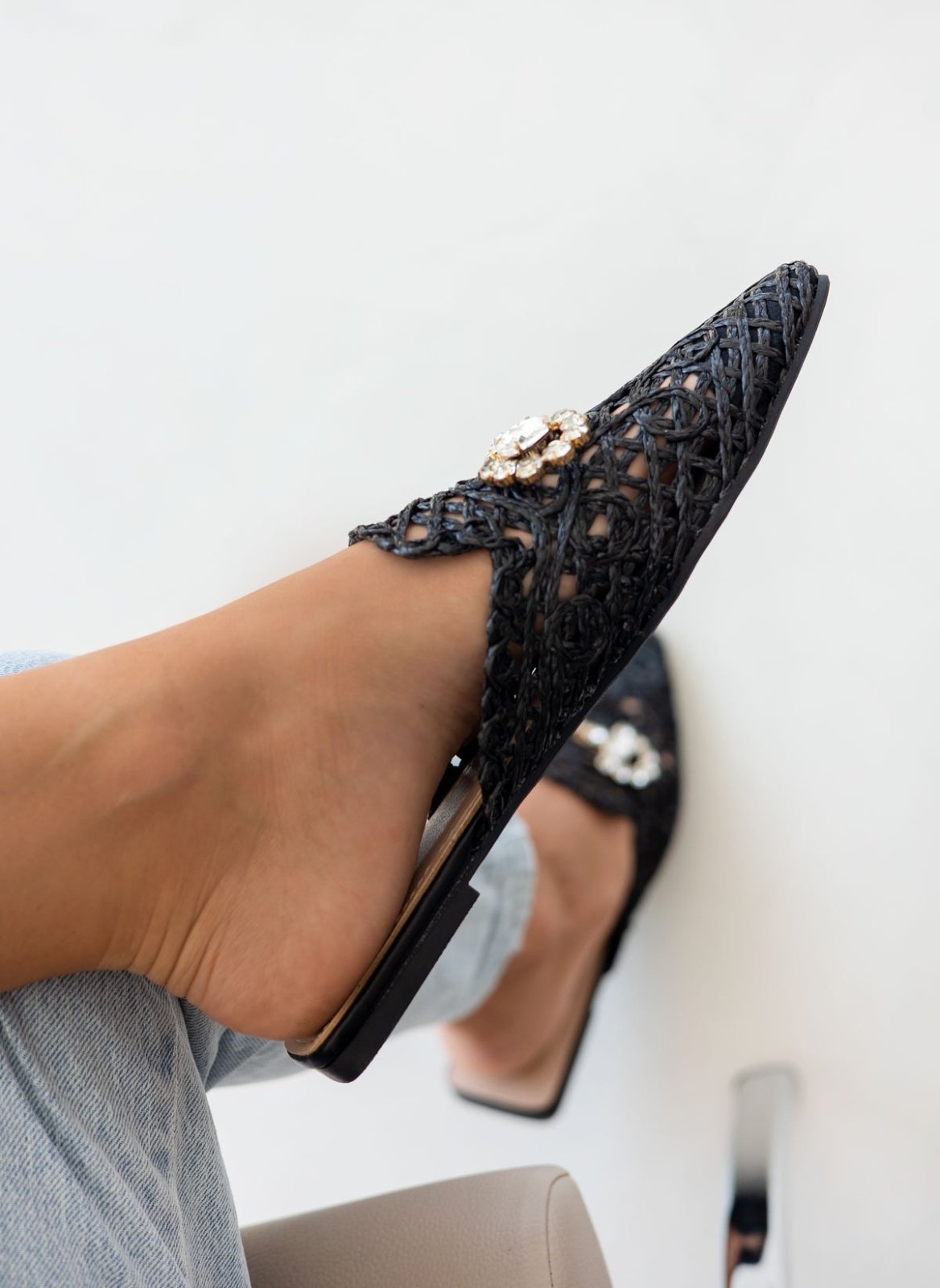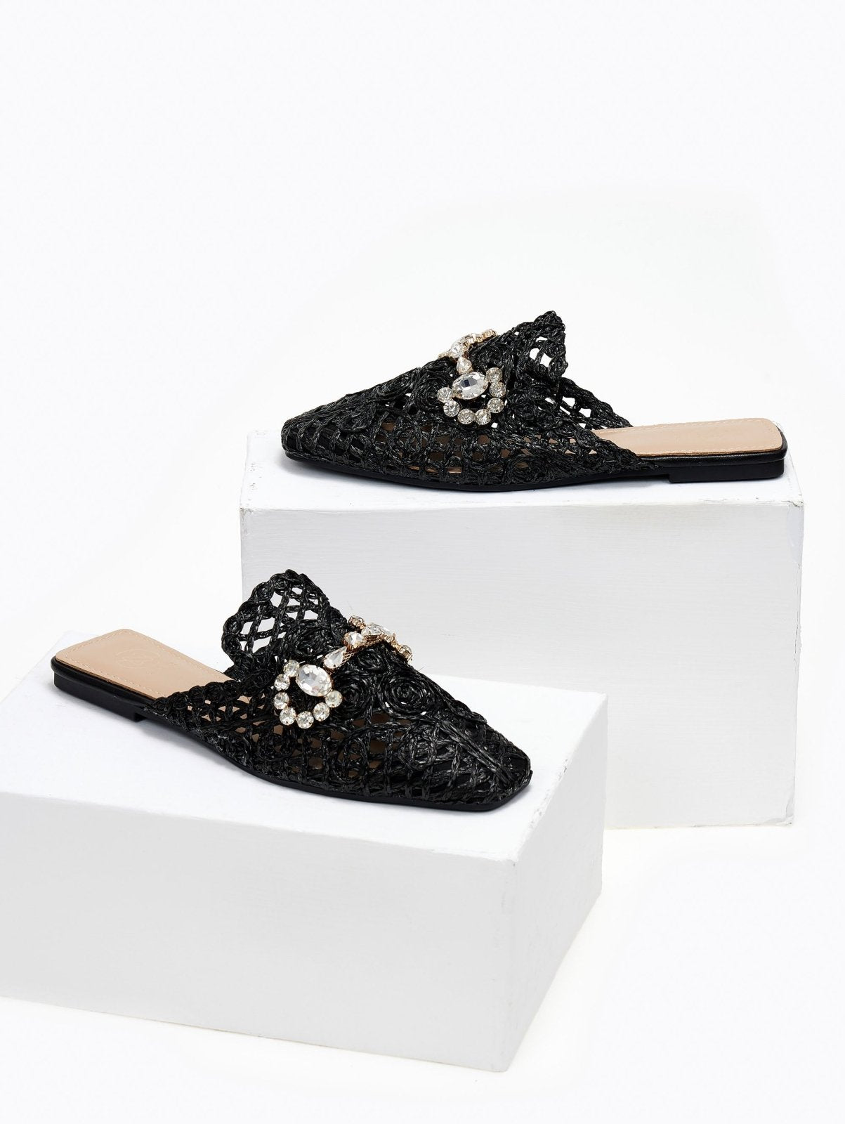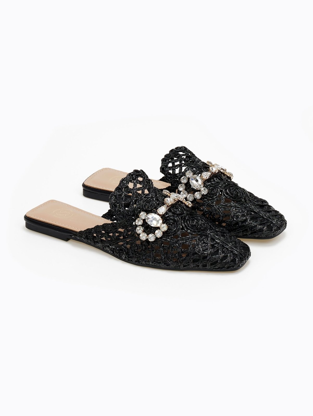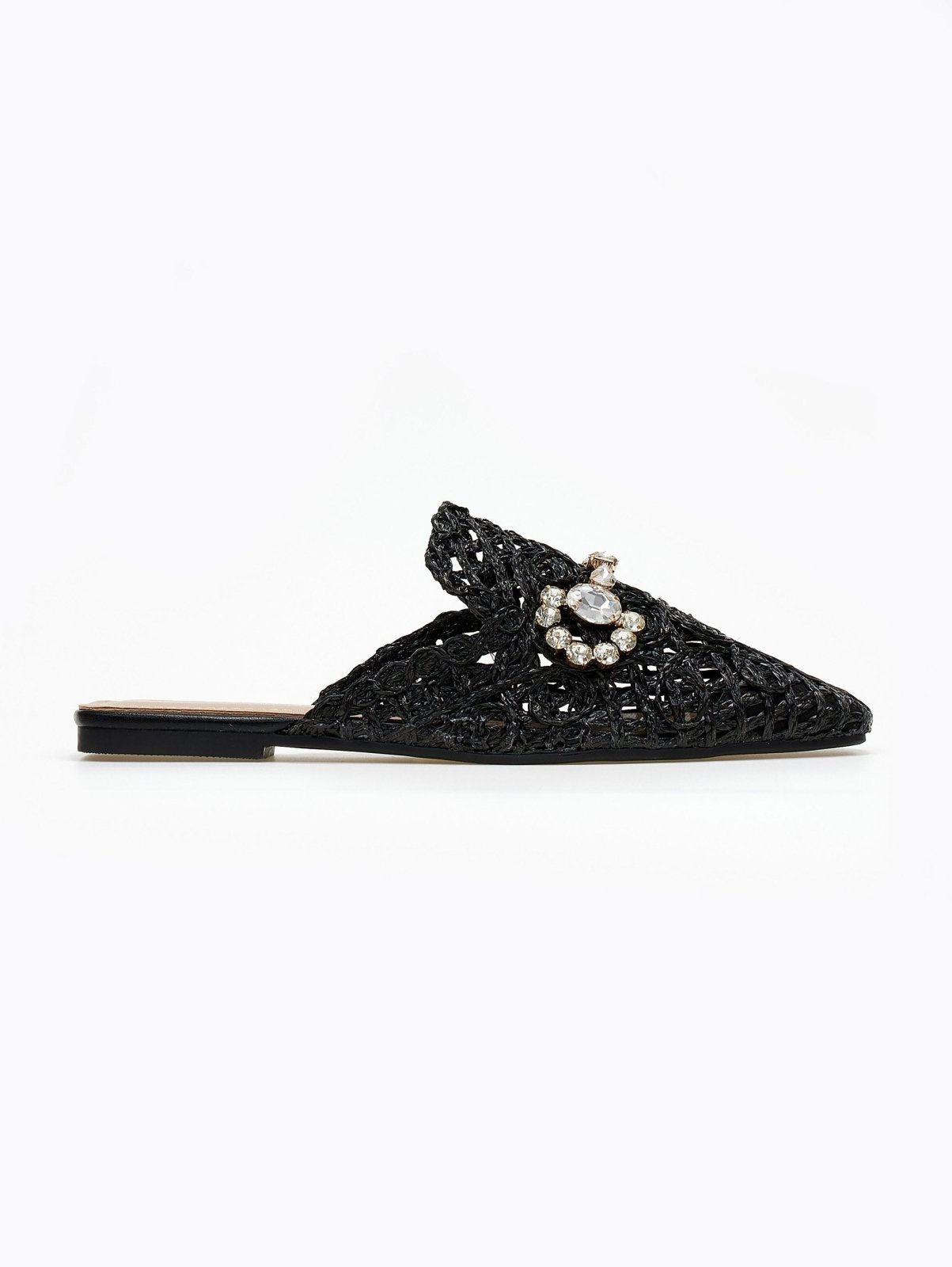 Mules χαμηλά με πλεκτό διάτρητο σχέδιο από ψάθα. Έχουν διακοσμητικό στοιχείο με πέτρες. Καρέ γραμμή. Λάστιχο στη σόλα.