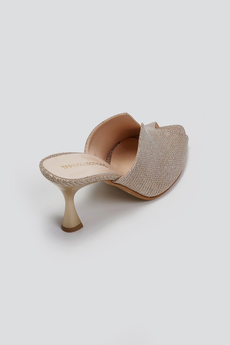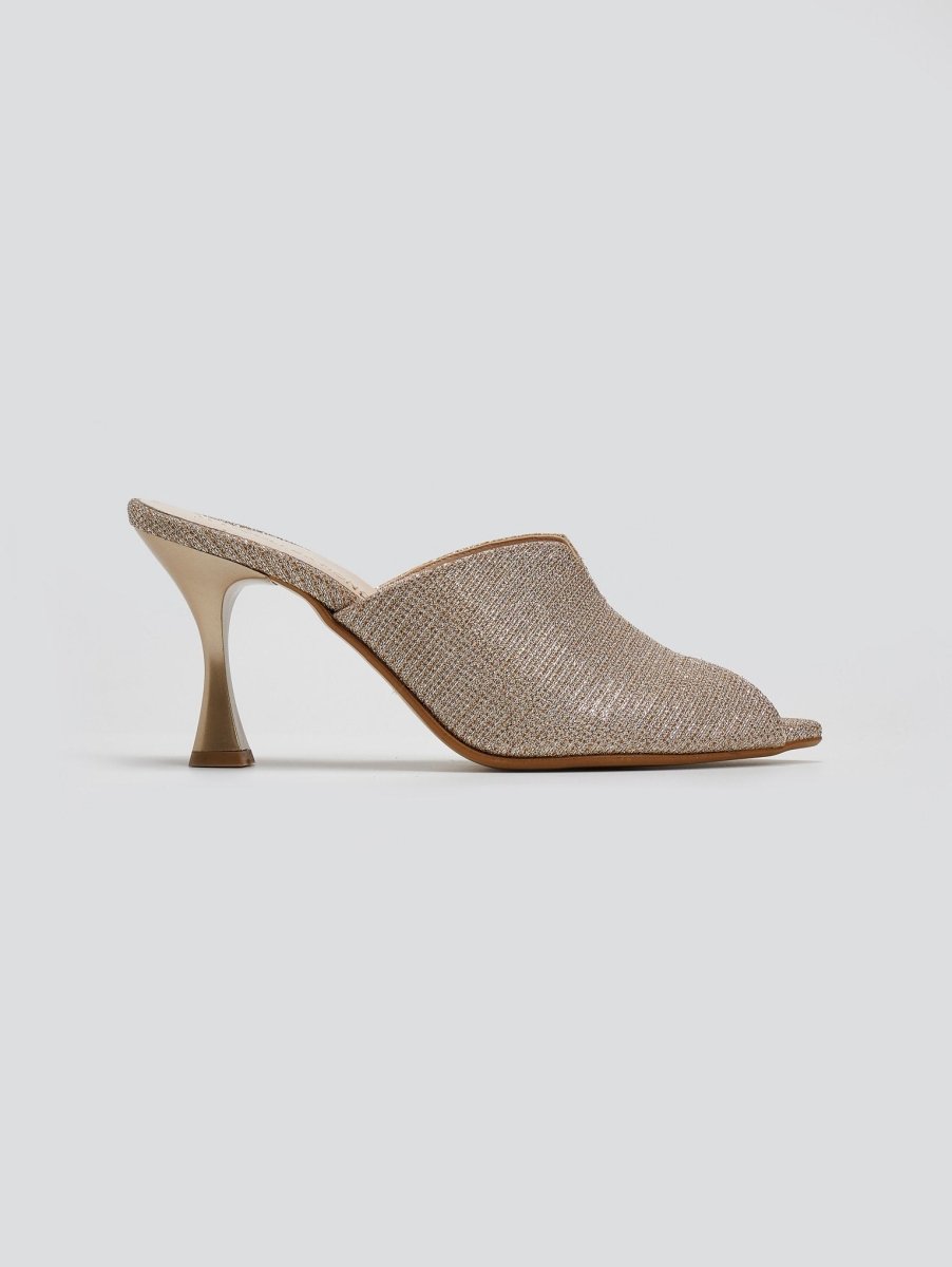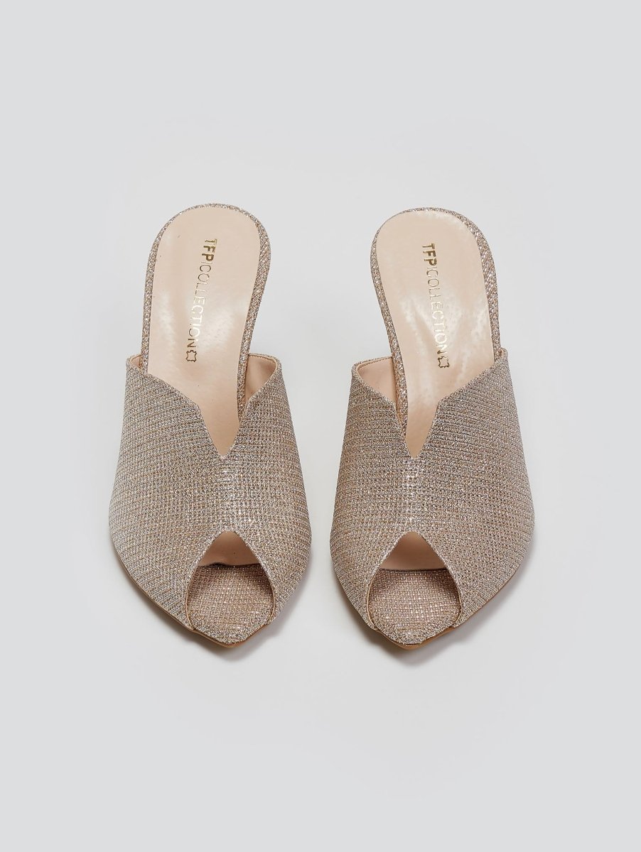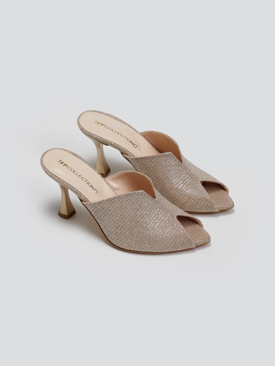 Mules ανοιχτά από γκλίτερ ύφασμα Tfp. Σχέδιο με v cut άνοιγμα στο επάνω μέρος. Λεπτό τακούνι. Δερμάτινος πάτος. Ελληνικής κατασκευής.