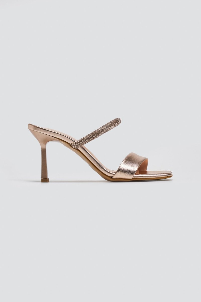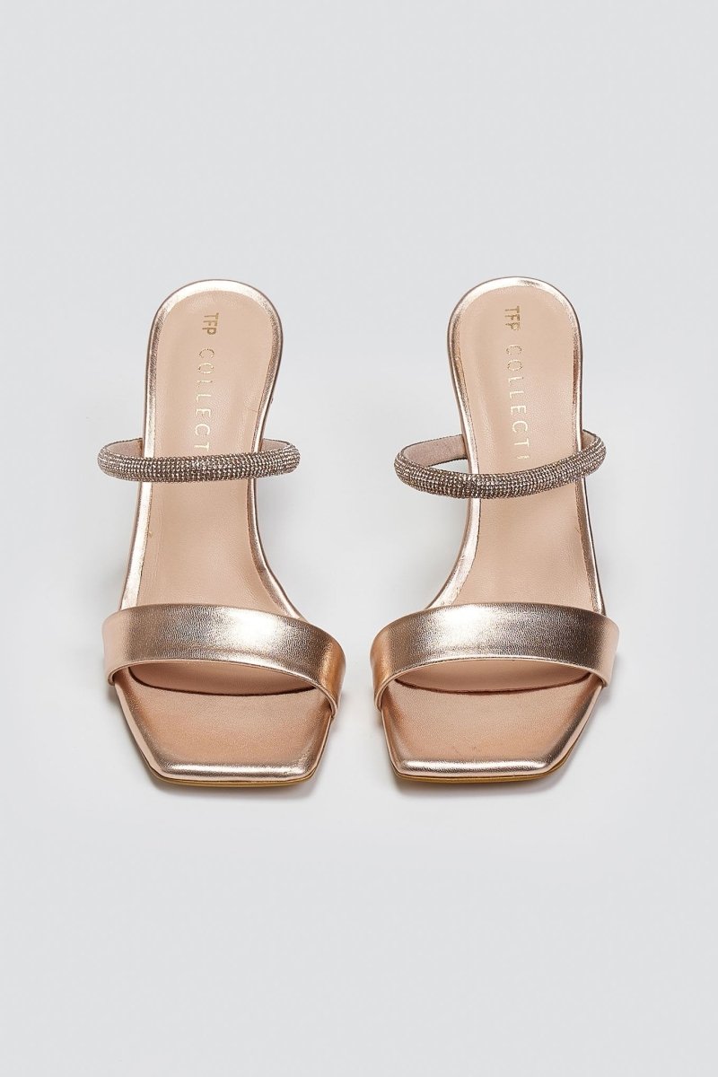 Mules TFP με λεπτή φάσα στα δάκτυλα. Λουράκι με στρας στο ύψος του κουτεπιέ. Μαλακός πάτος με ενίσχυση. Ψηλό λεπτό τακούνι. Ελληνικής κατασκευής.