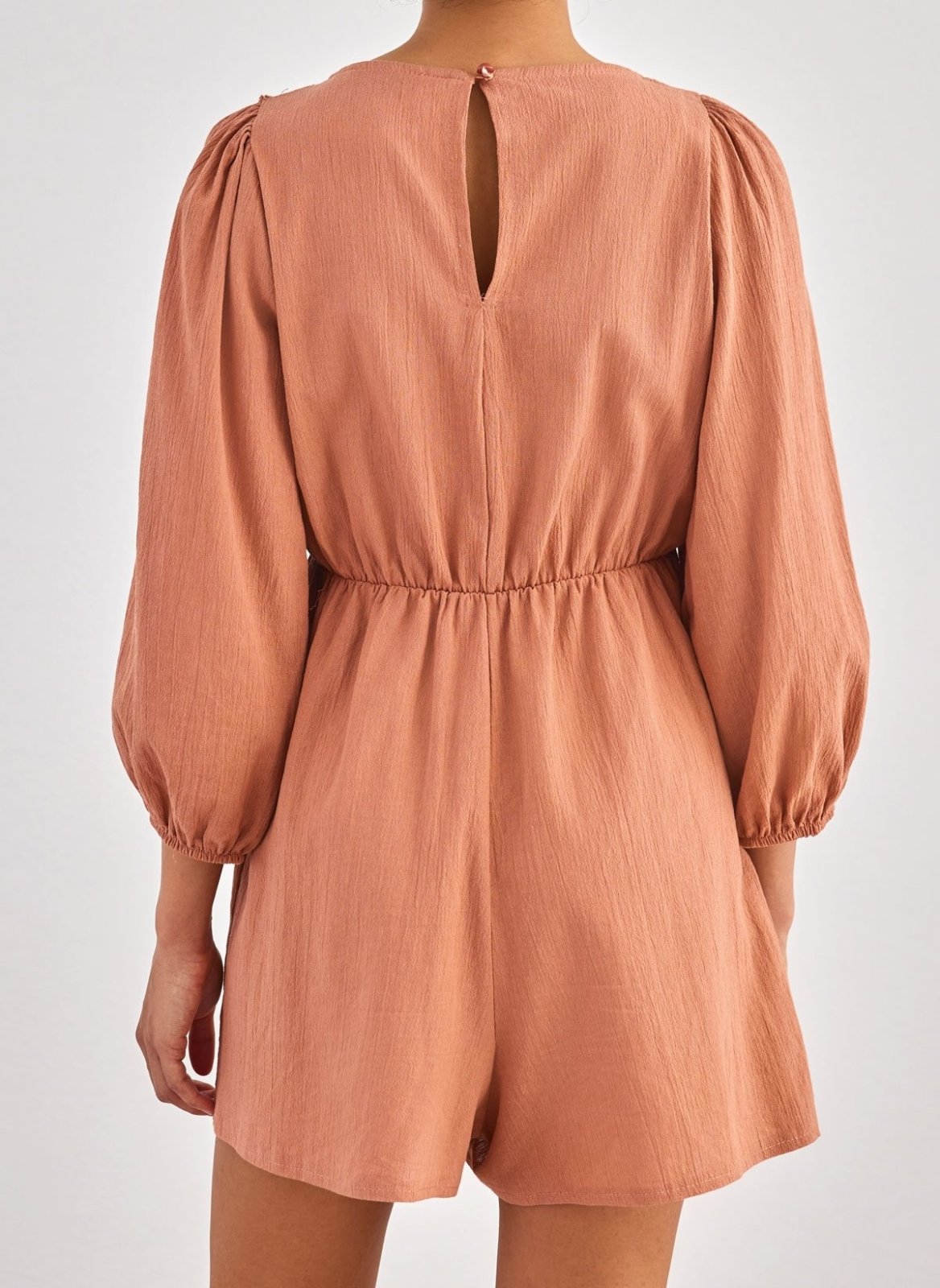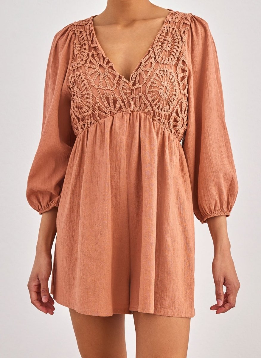 Ολόσωμη κοντή φόρμα με λάστιχο στη μέση. Έχει v cut άνοιγμα στο μπούστο με crochet σχέδιο. Μακριά μανίκια με λάστιχο στο τελείωμα. Άνοιγμα με κουμπί στην πλάτη. Διπλό ύφασμα στο εσωτερικό του.