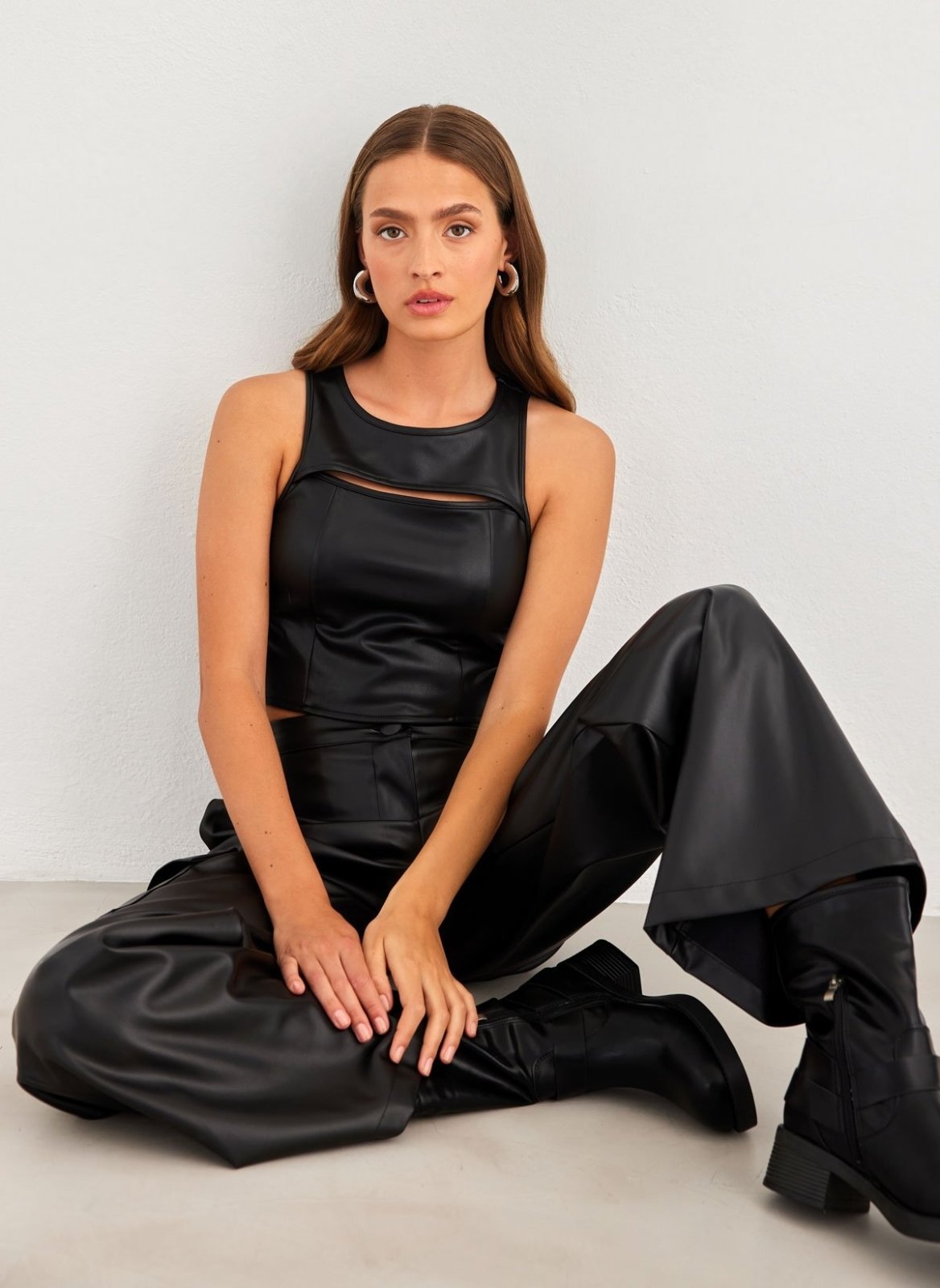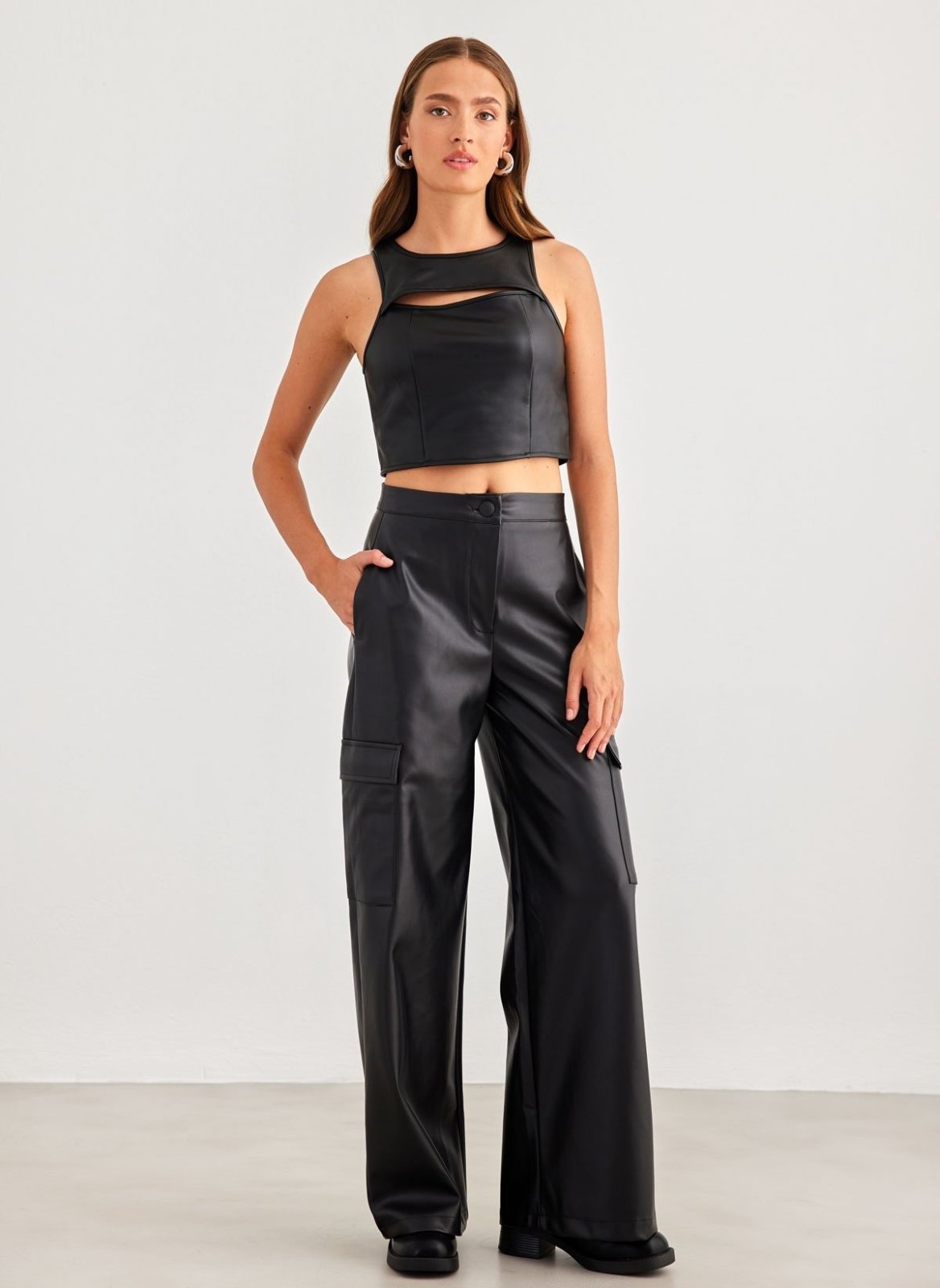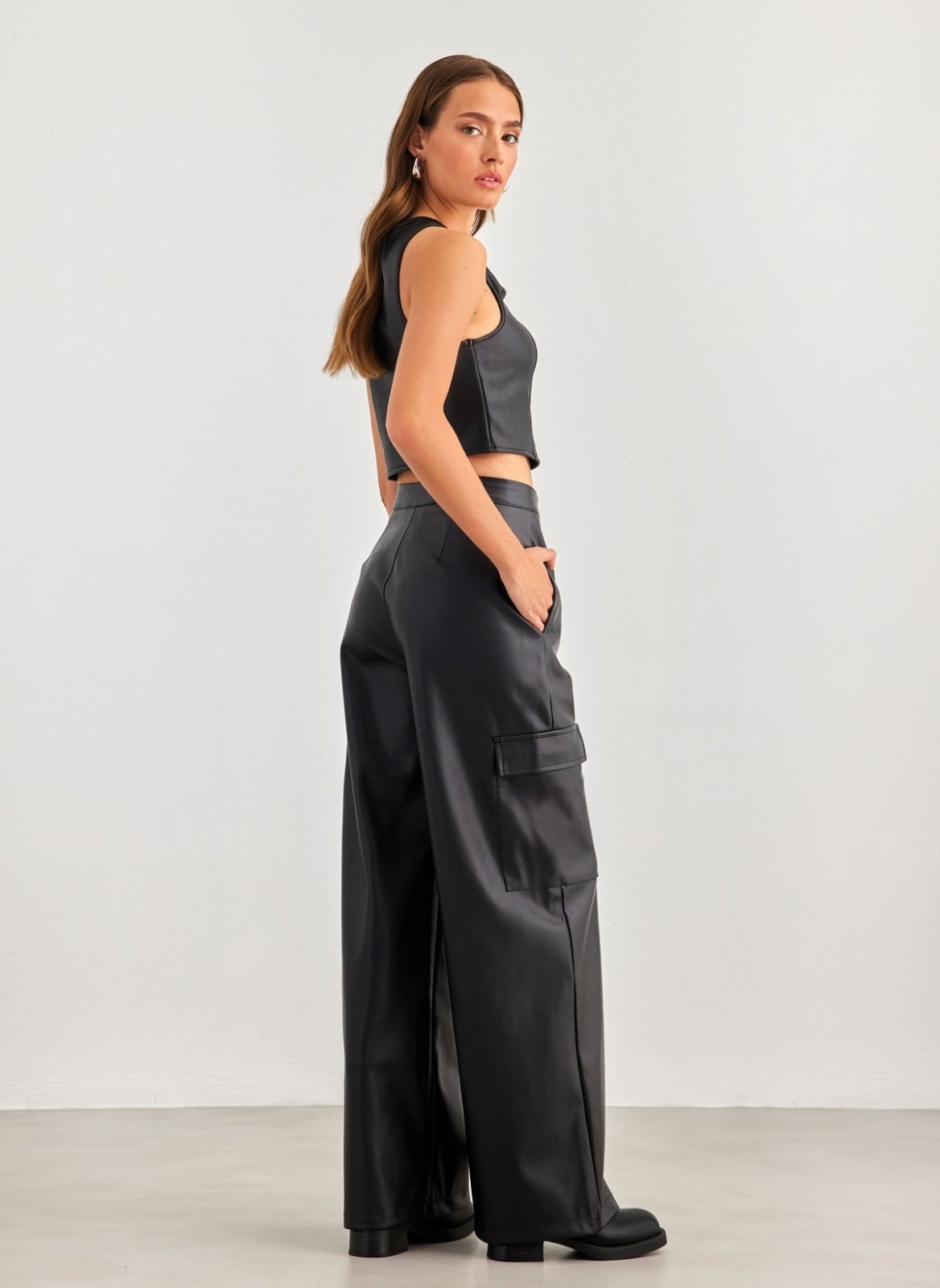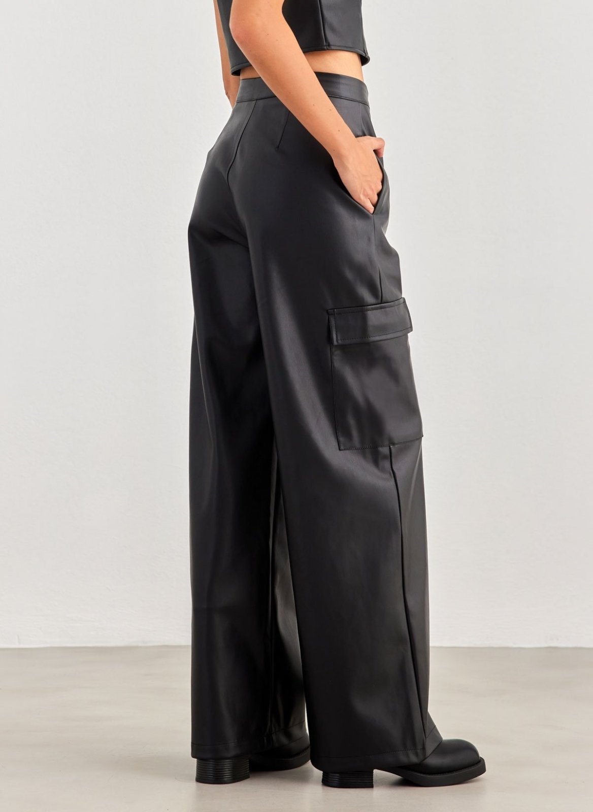 Παντελόνι cargo δεματίνη με φαρδιά μπατζάκια. Έχει κάθετες τσέπες στο πλάι. Κλείνει με φερμουάρ και κουμπί.