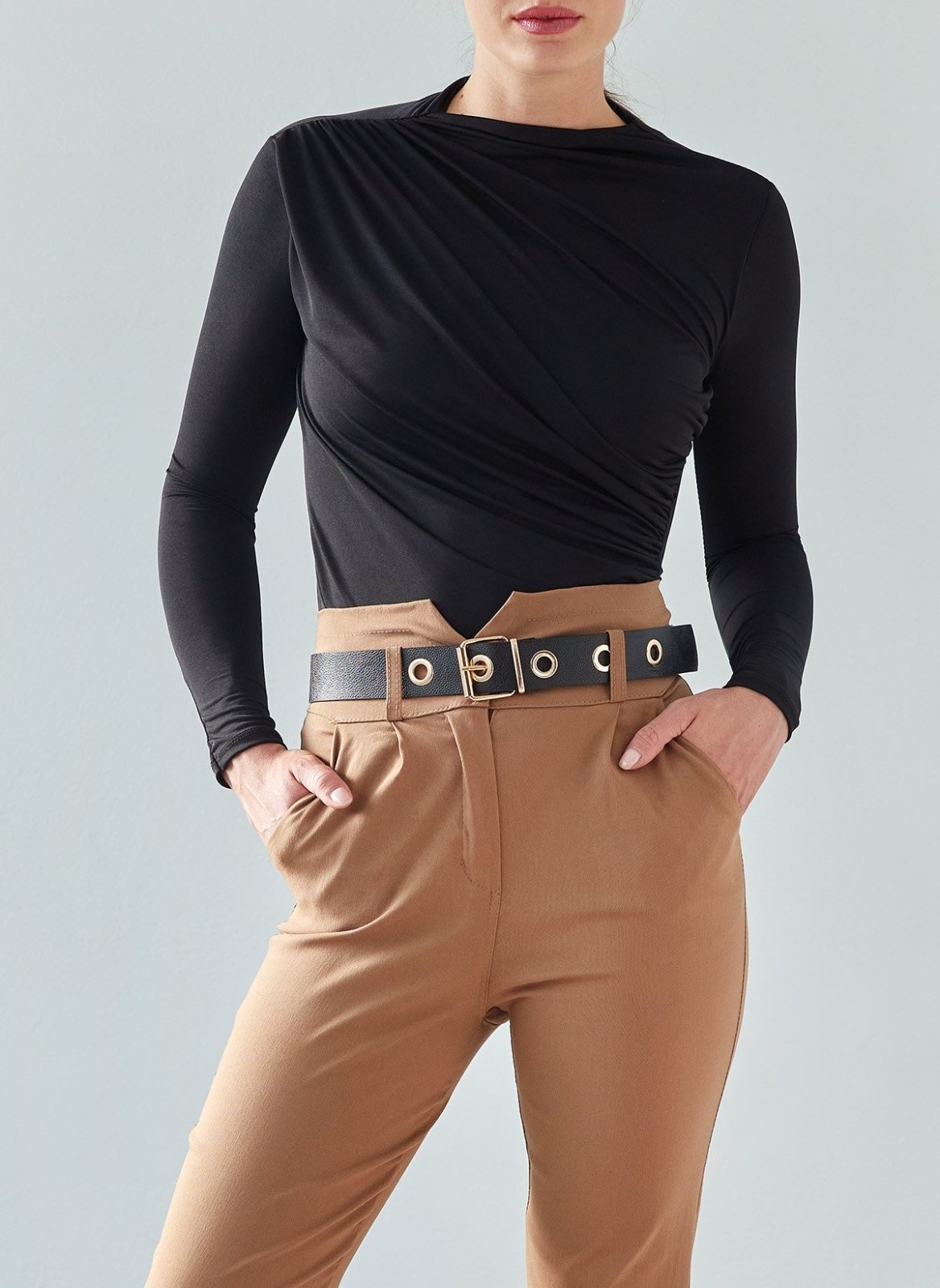 Παντελόνι ψηλόμεσο chino με μικρό άνοιγμα στη μπροστινή πλευρά. Περλαμβάνεται ζώνη δερματίνη με μεταλλική αγκράφα. Made in Italy.