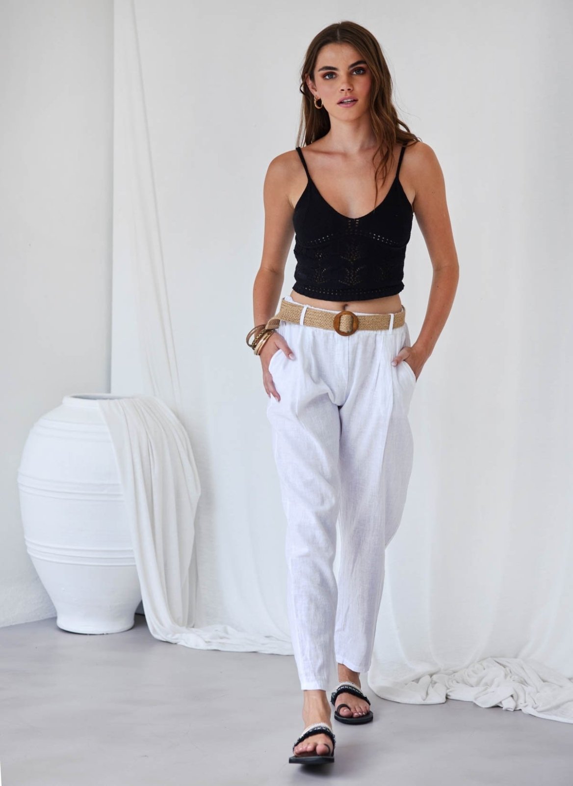 Παντελόνι με λινό. Έχει τσέπες στο πλάι και πιέτες στη μπροστινή πλευρά. Λάστιχο στη μέση. Περιλαμβάνεται πλεκτή σχοίνινη ζώνη με ξύλινη αγκράφα.