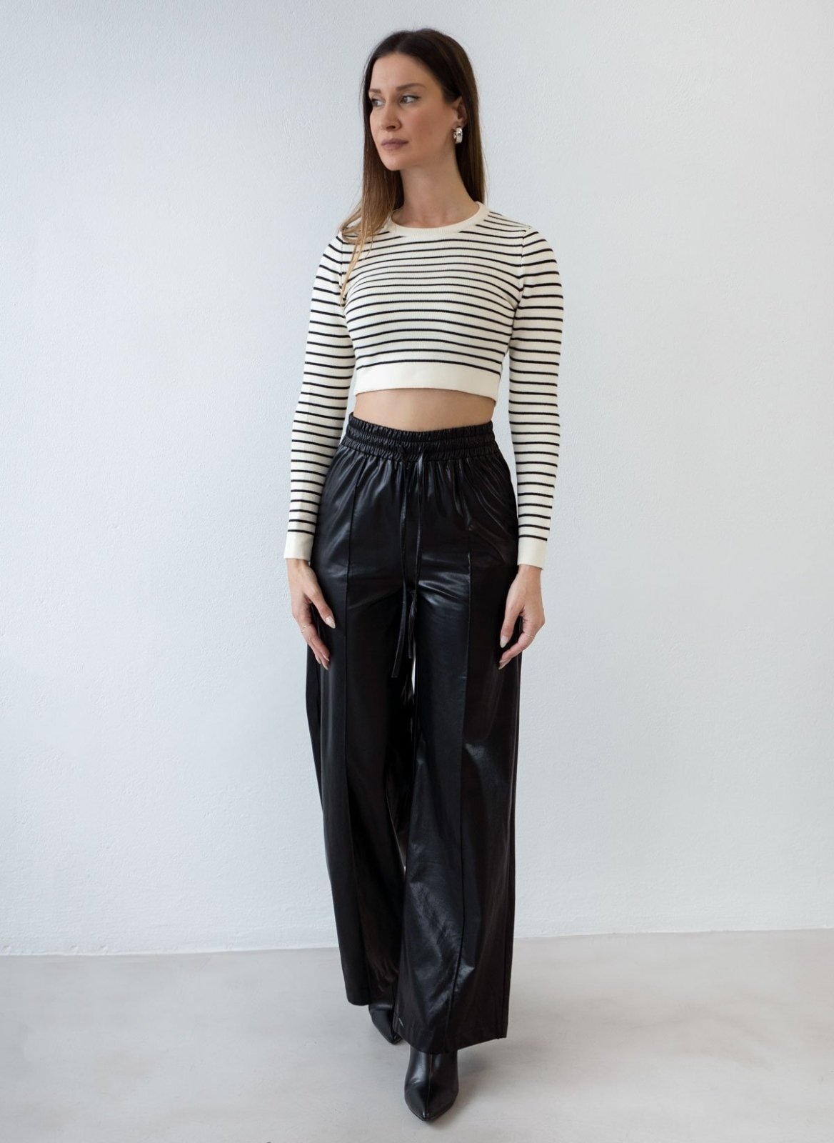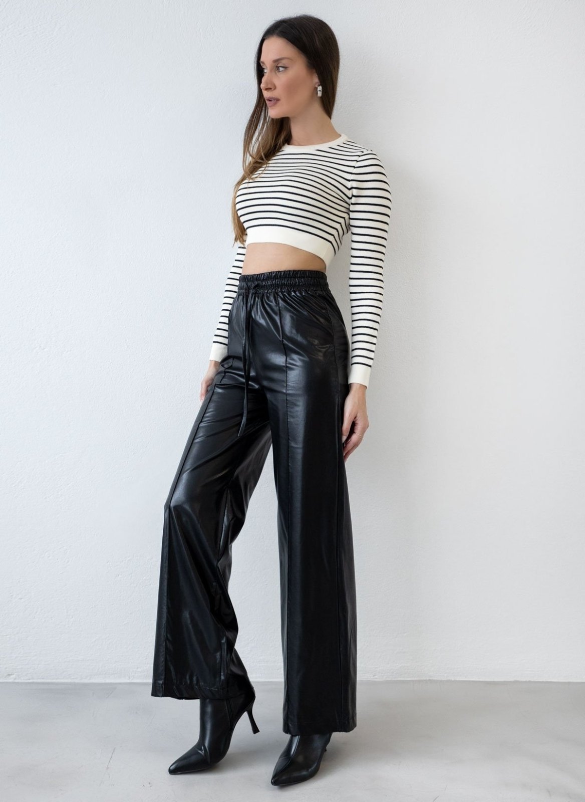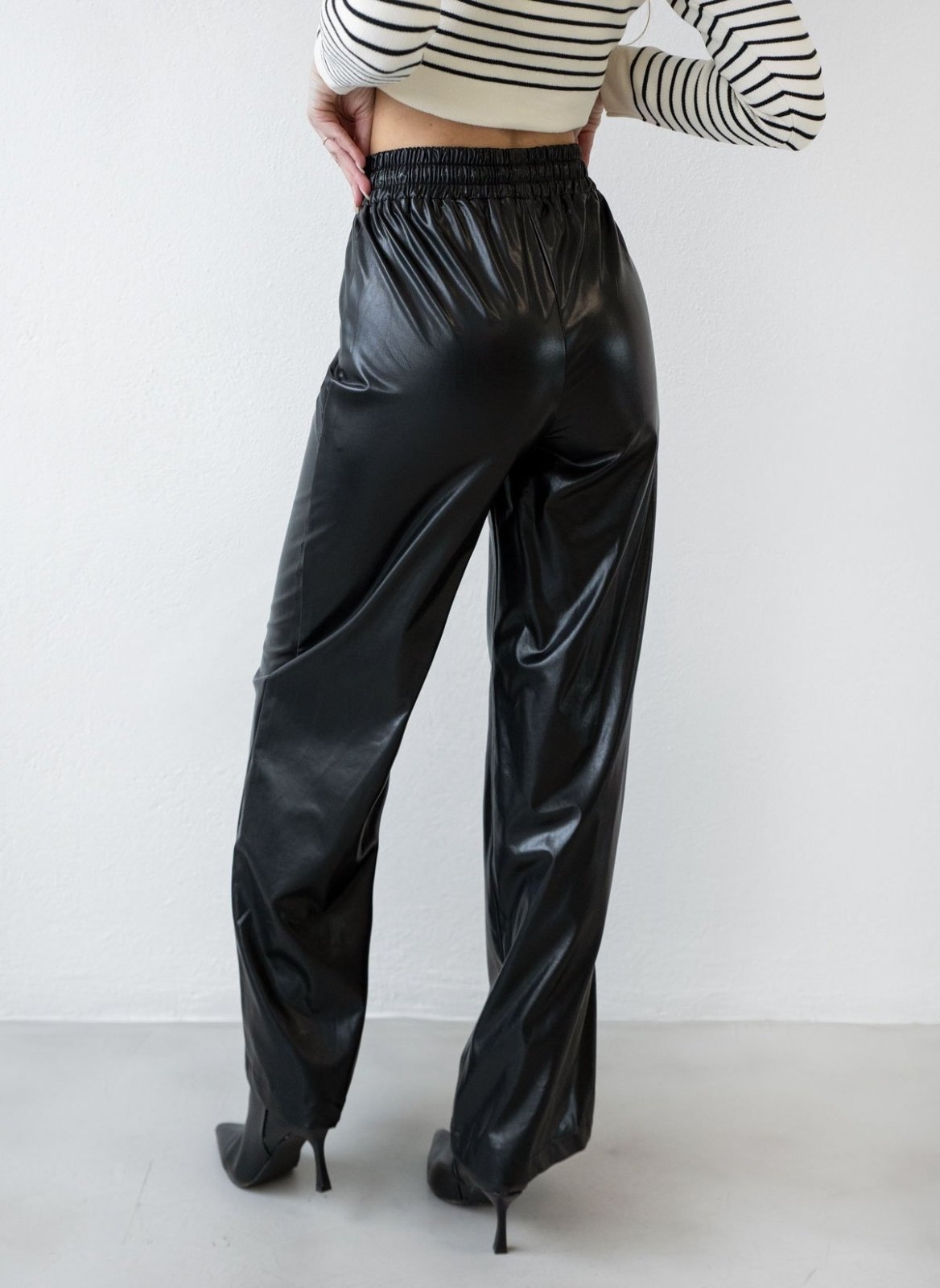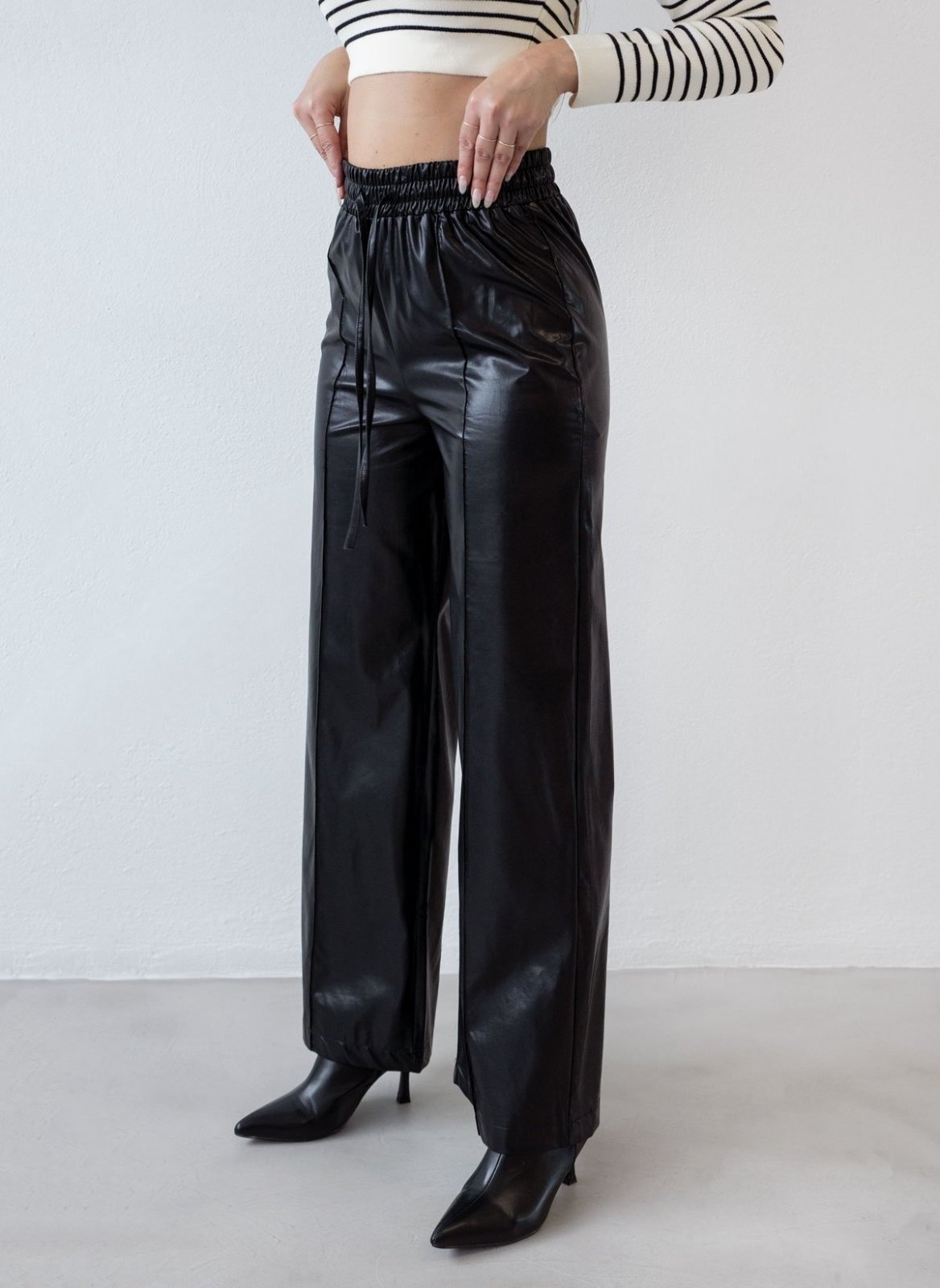 Παντελόνι ψηλόμεσο δερματίνη BISOU. Έχει λάστιχο στη μέση και σφίγγει με κορδόνια. Άνετη γραμμή. Κάθετη ραφή μπροστά.