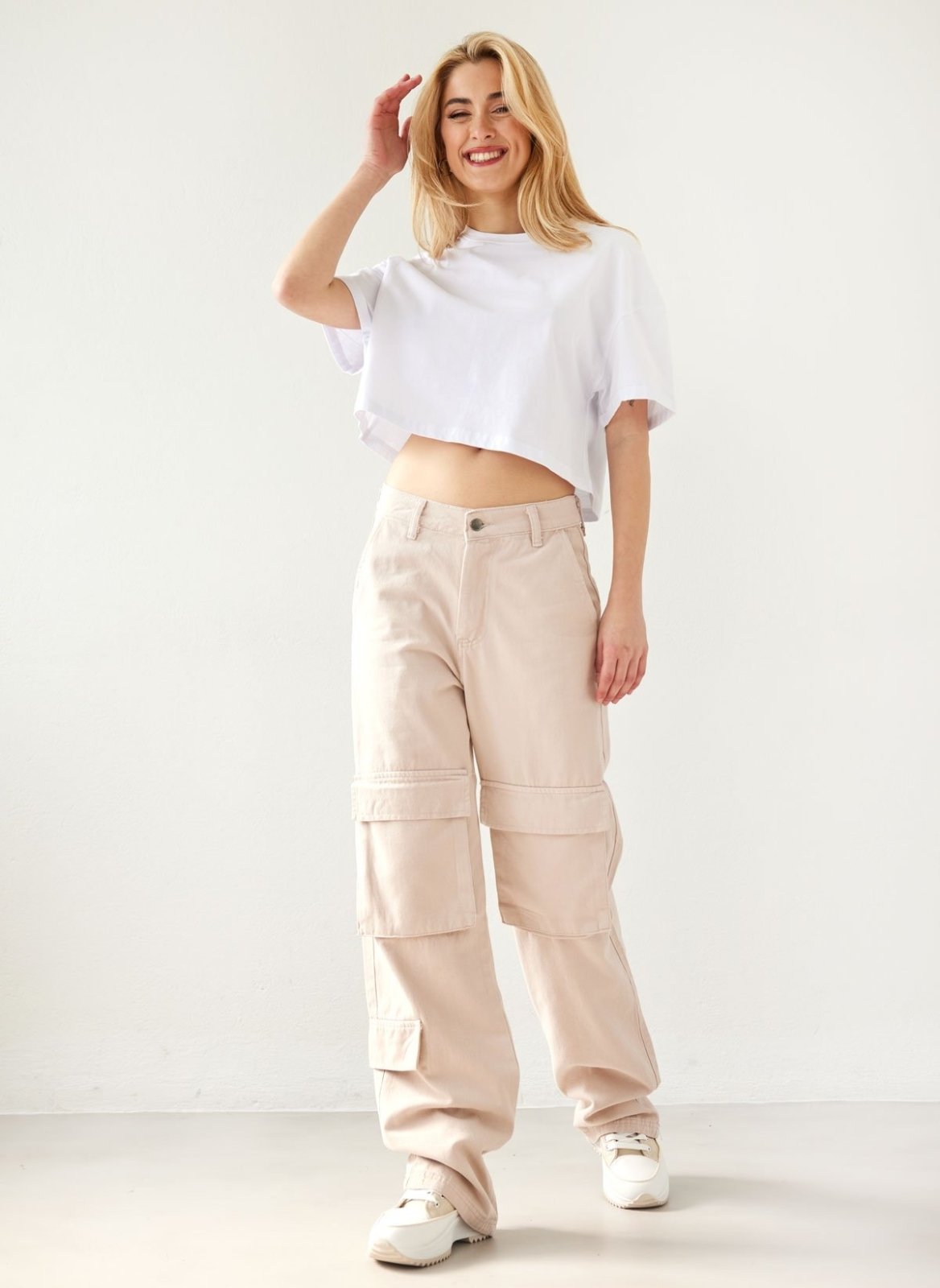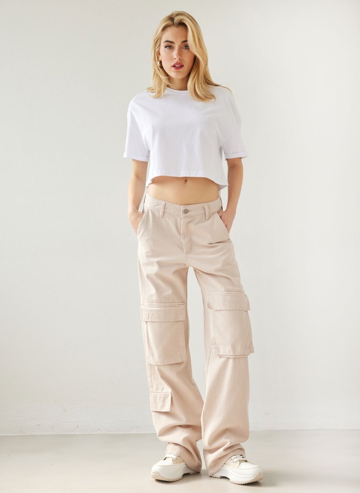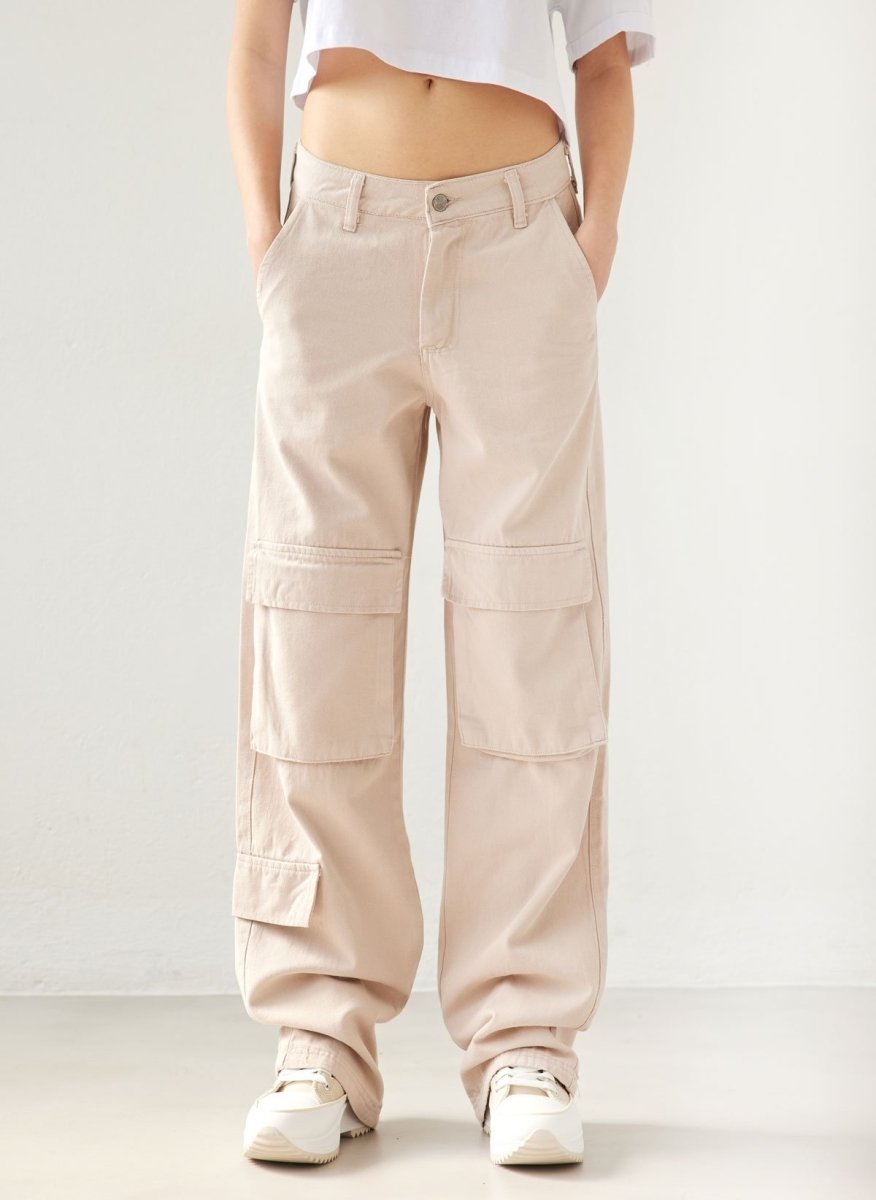Παντελόνι τζιν ψηλόμεσο cargo. Έχει τσέπες εξωτερικές στη μπροστινή πλευρά. Φαρδιά πατζάκια.