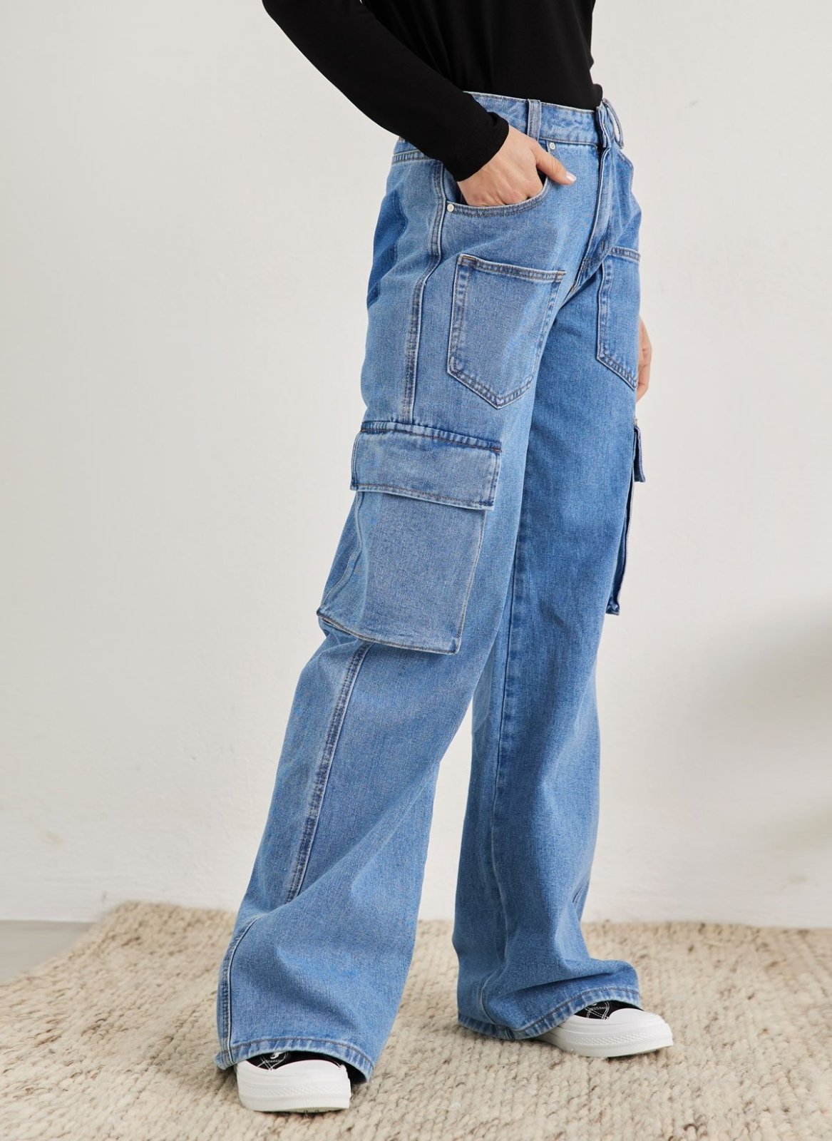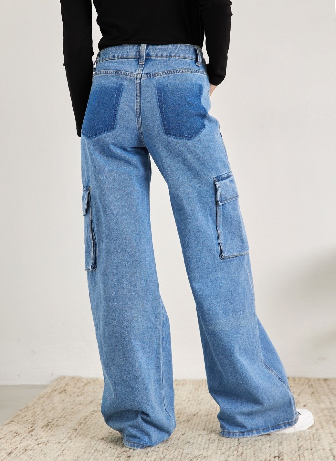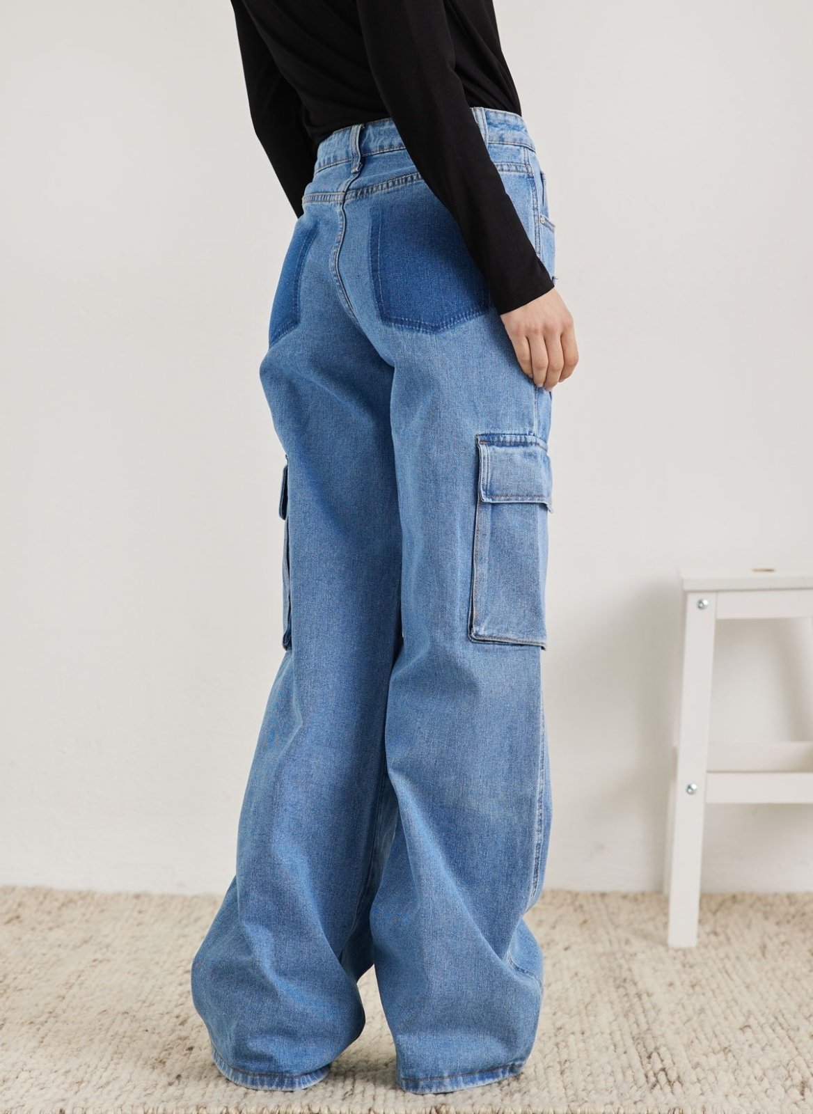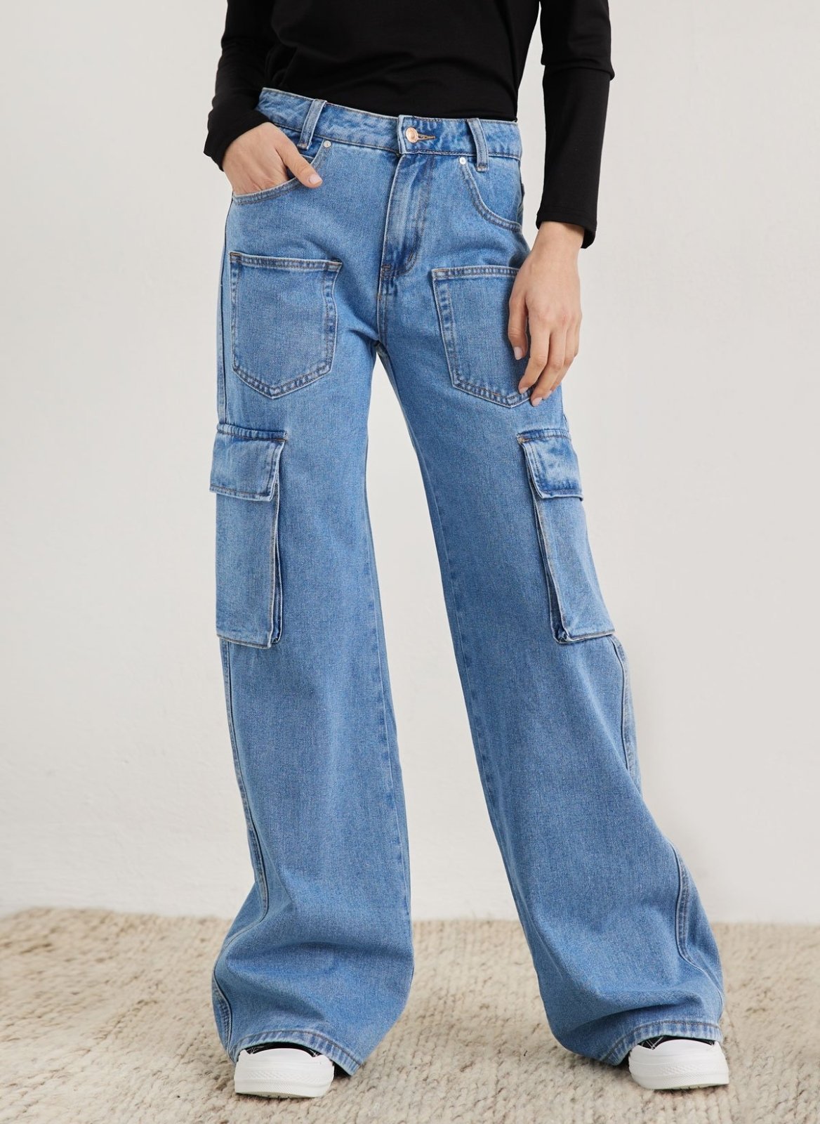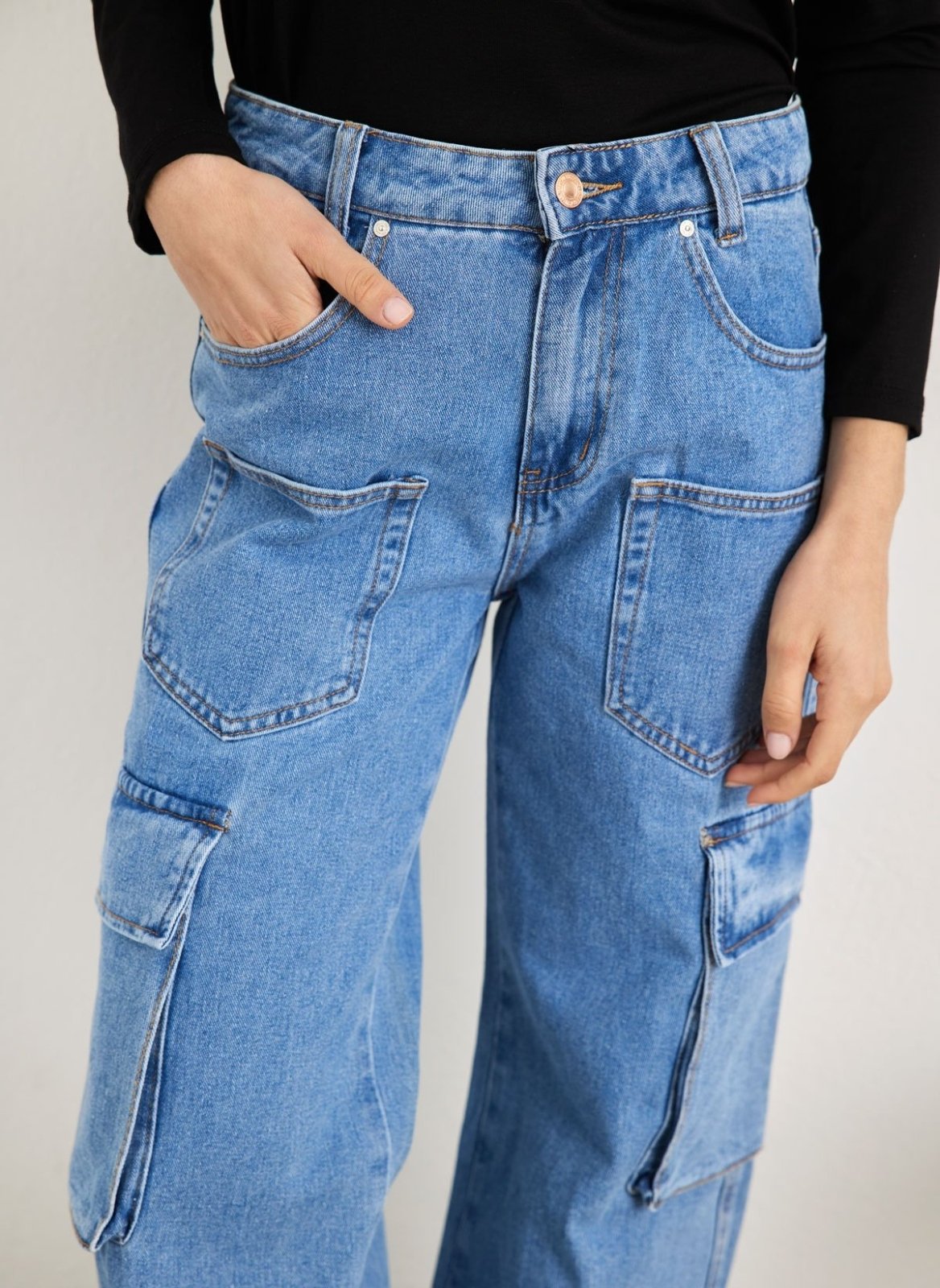 Παντελόνι τζιν cargo με φαρδιά πατζάκια. Έχει εξωτερικές τσέπες στη μπροστινή πλευρά. Χωρίς τσέπες στο πίσω μέρος.