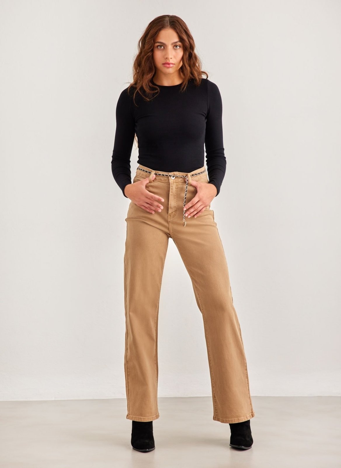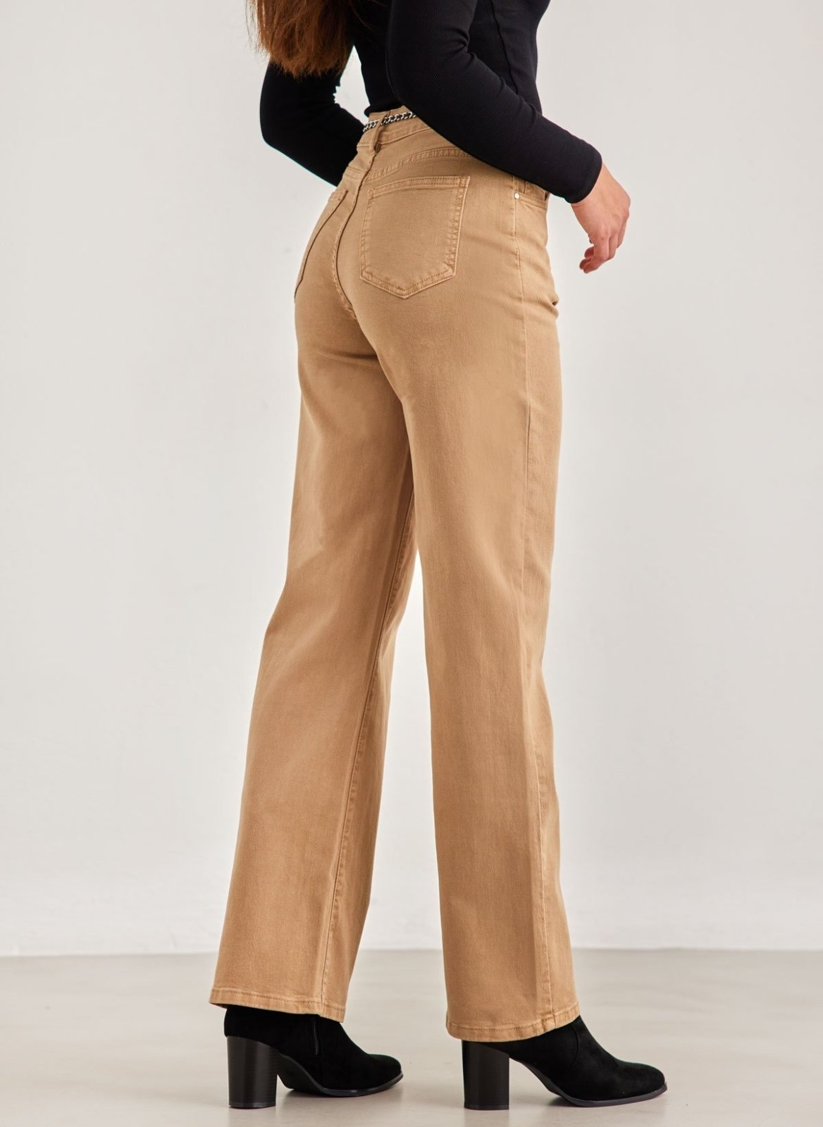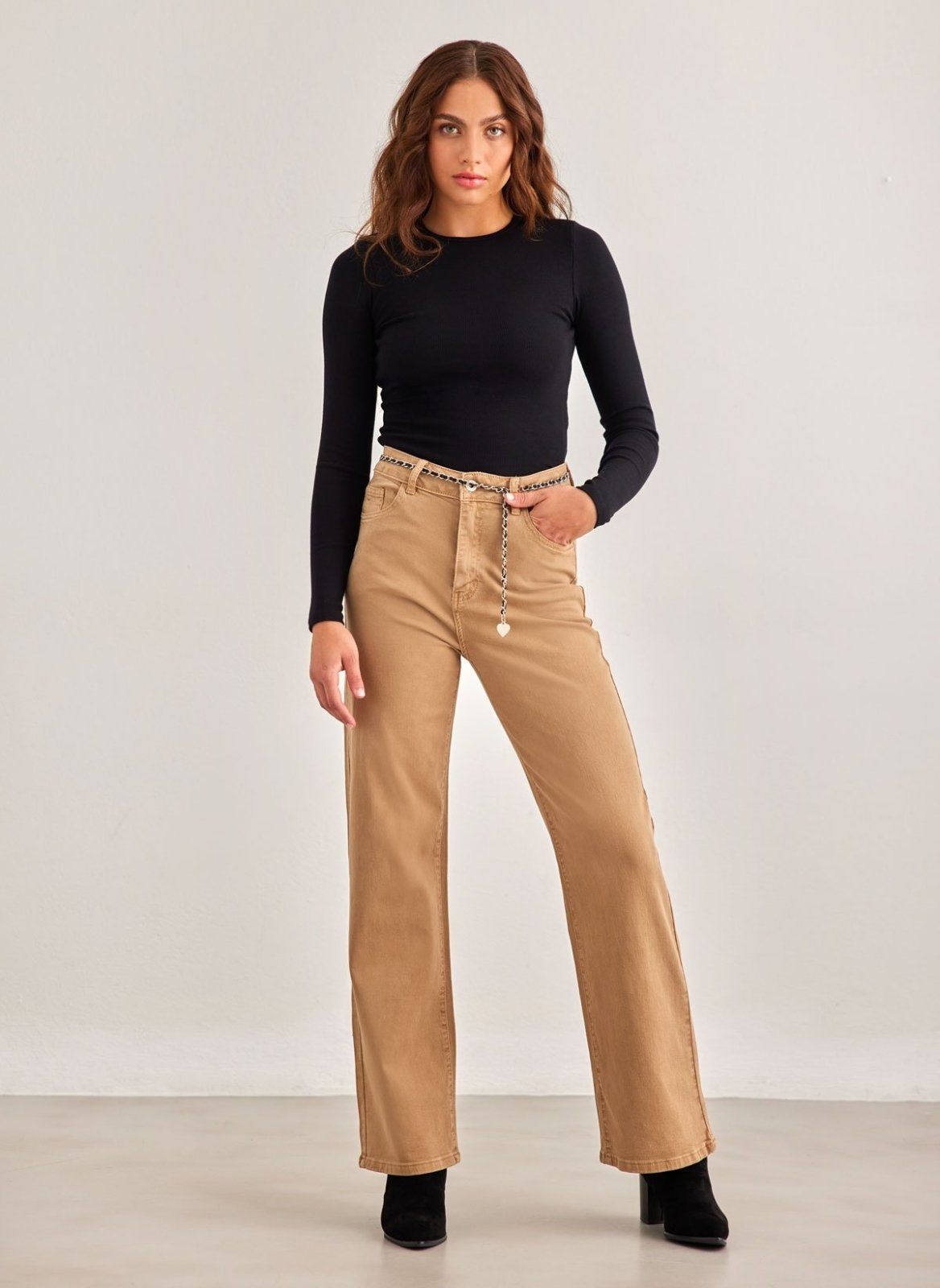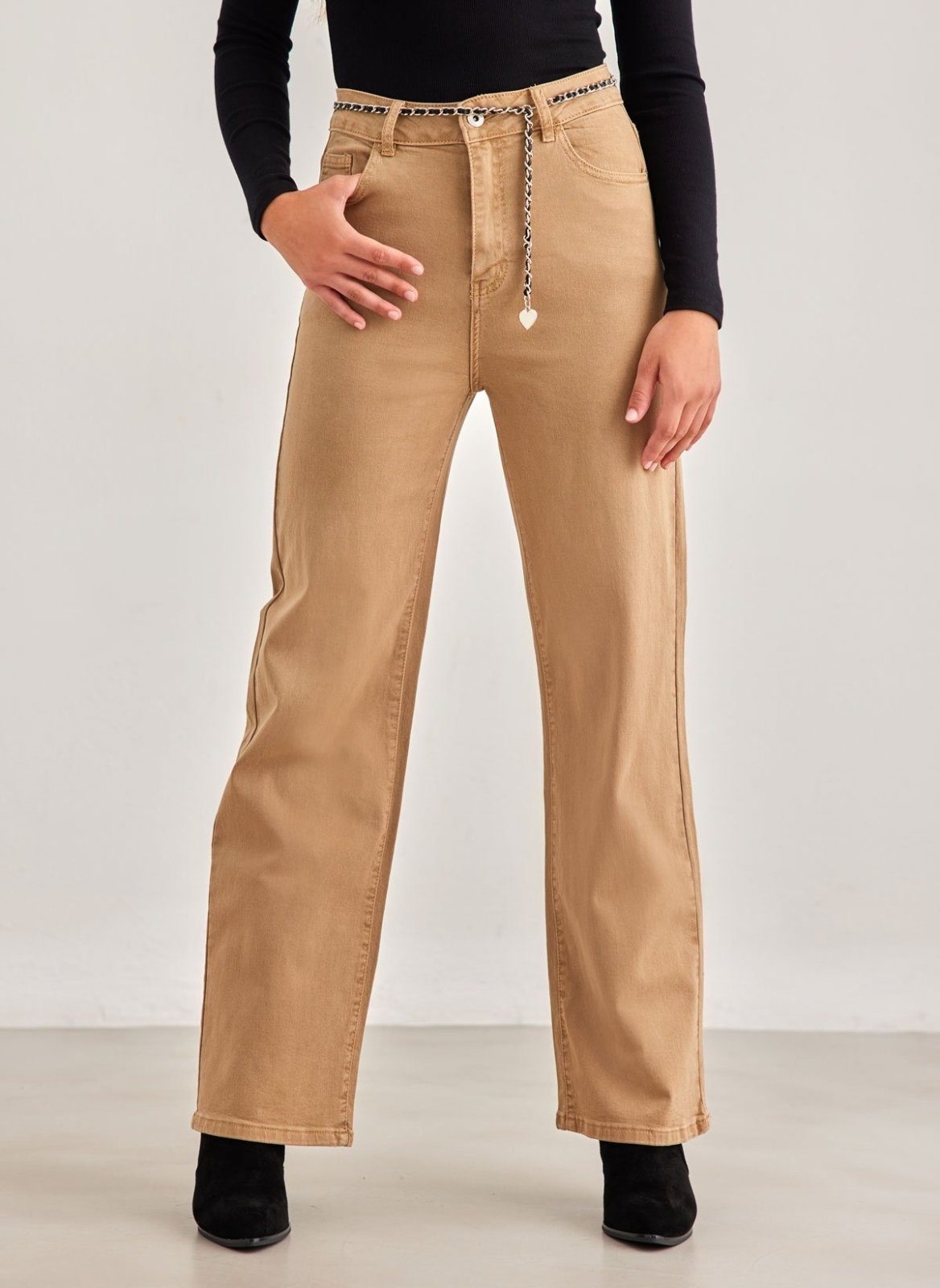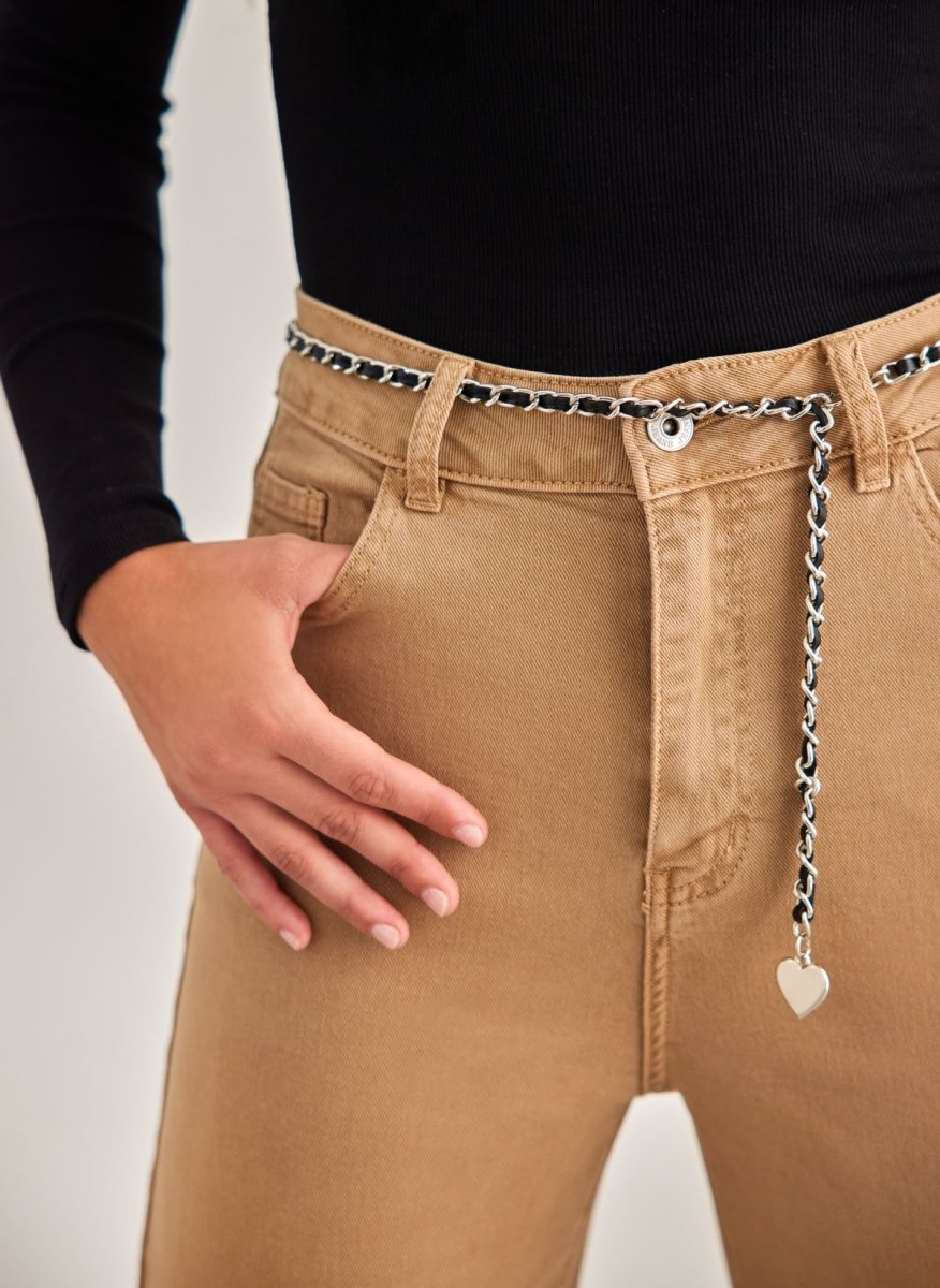 Παντελόνι τζιν ψηλόμεσο με φαρδιά μπατζάκια. Έχει τσέπες στο πλάι και το πίσω μέρος. Περιλαμβάνεται ζωνάκι αλυσίδα με δερματίνη. Κλείνει με φερμουάρ και κουμπί.