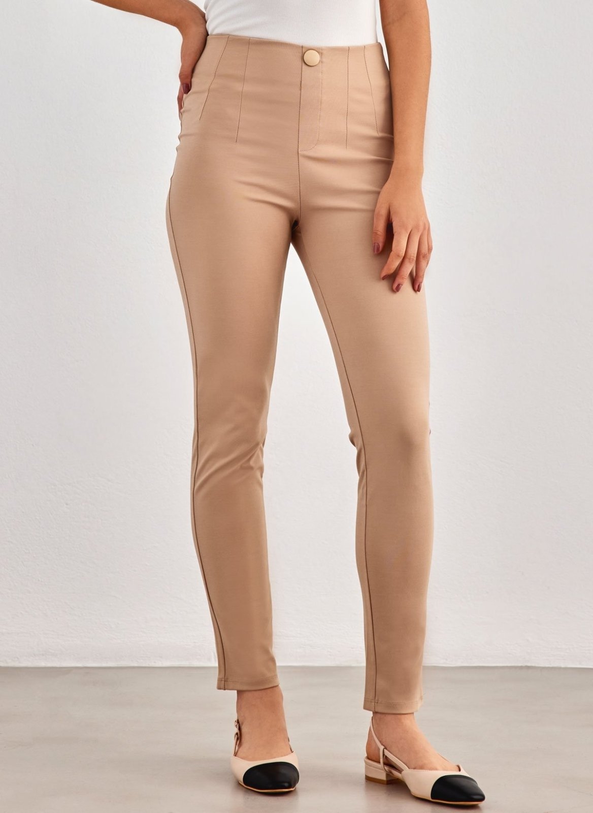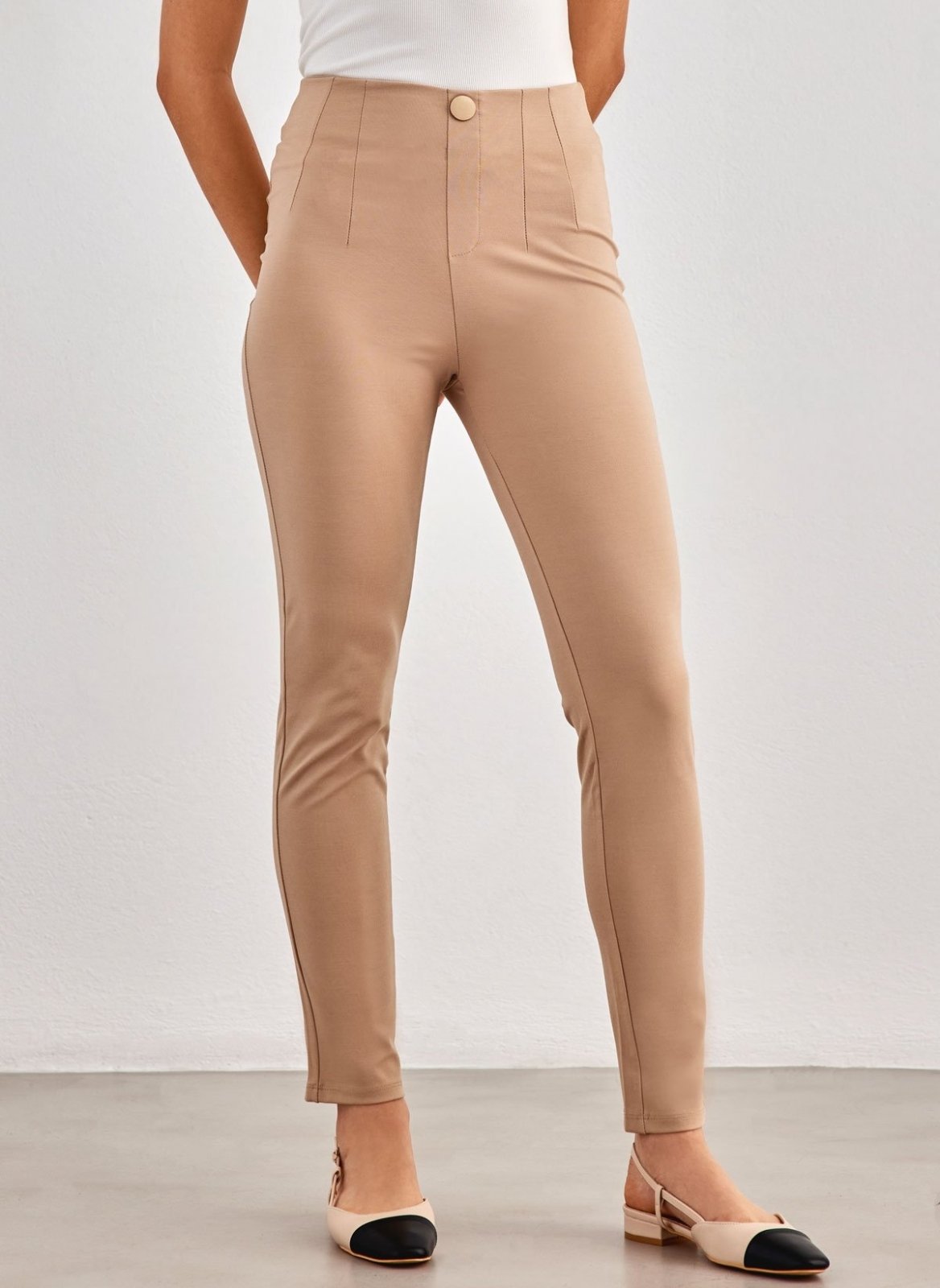 Παντελόνι με ελαστική ύφανση. Εφέ κουμπί στη μπεοστινή πλευρά. Τσέπες στο πίσω μέρος. Εφαρμοστή γραμμή.