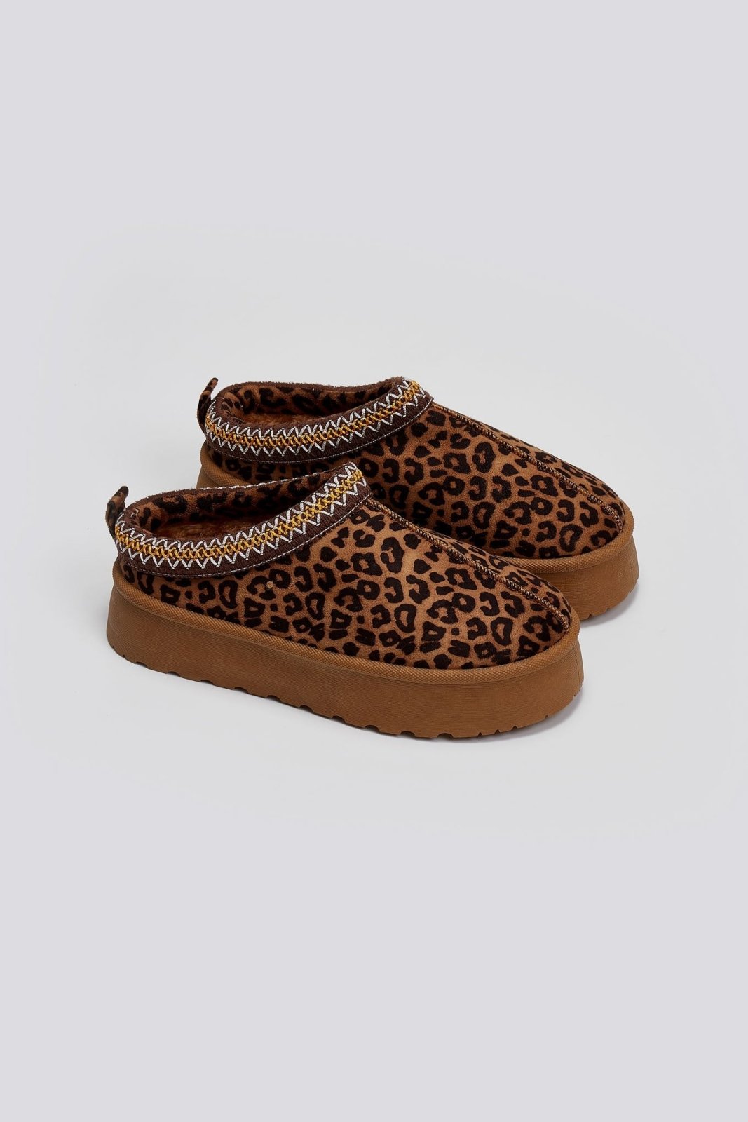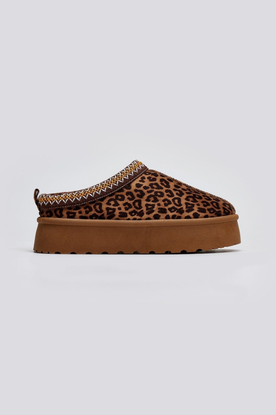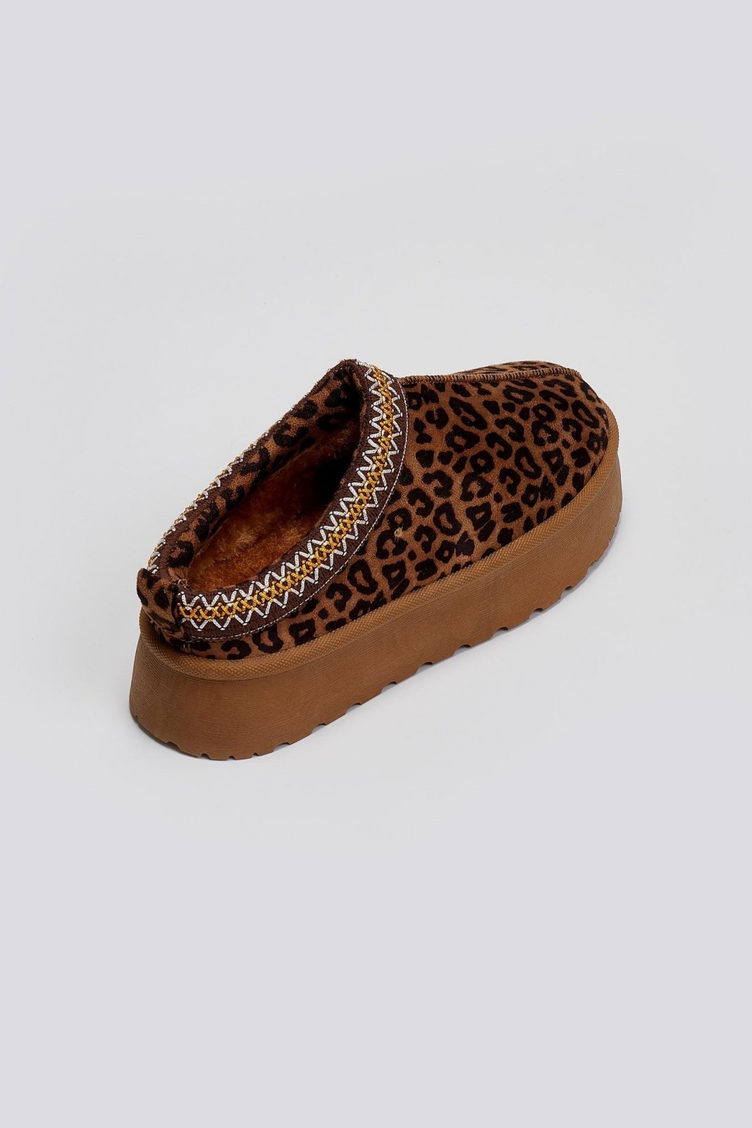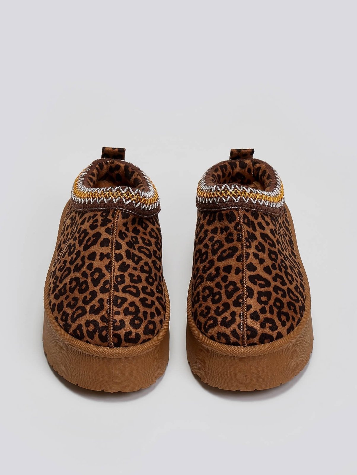 Παντόφλες suede με animal print ERYNN. Έχουν επένδυση από συνθετική γούνα. Platform ελαφριά σόλα. Τρέσα με boho σχέδιο στο περίγραμμα.