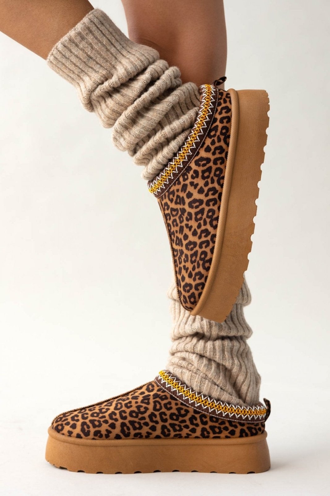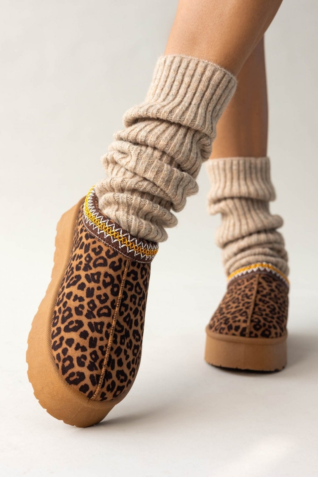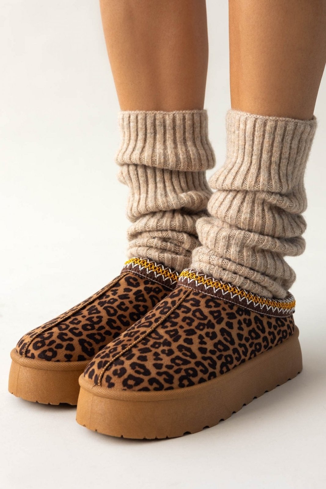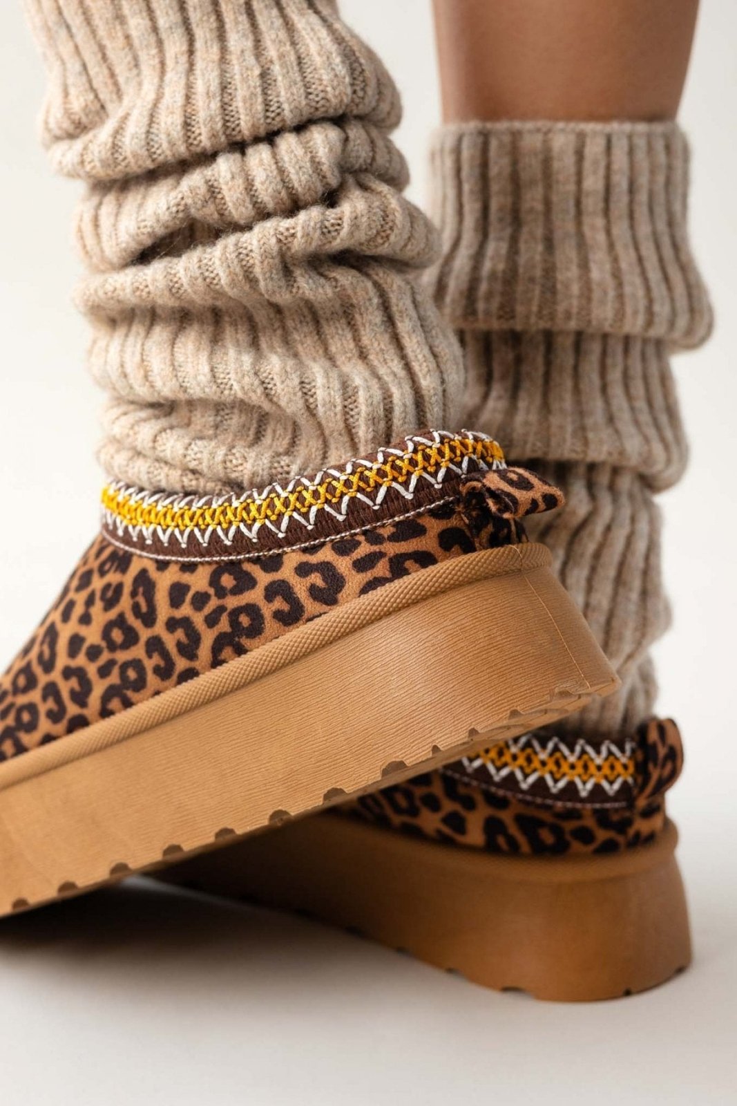 Παντόφλες suede με animal print ERYNN. Έχουν επένδυση από συνθετική γούνα. Platform ελαφριά σόλα. Τρέσα με boho σχέδιο στο περίγραμμα.