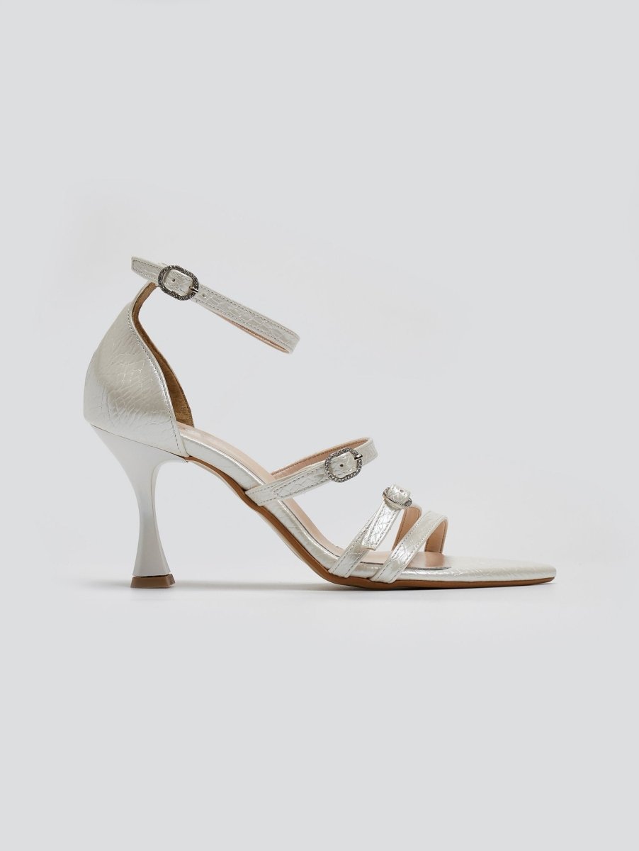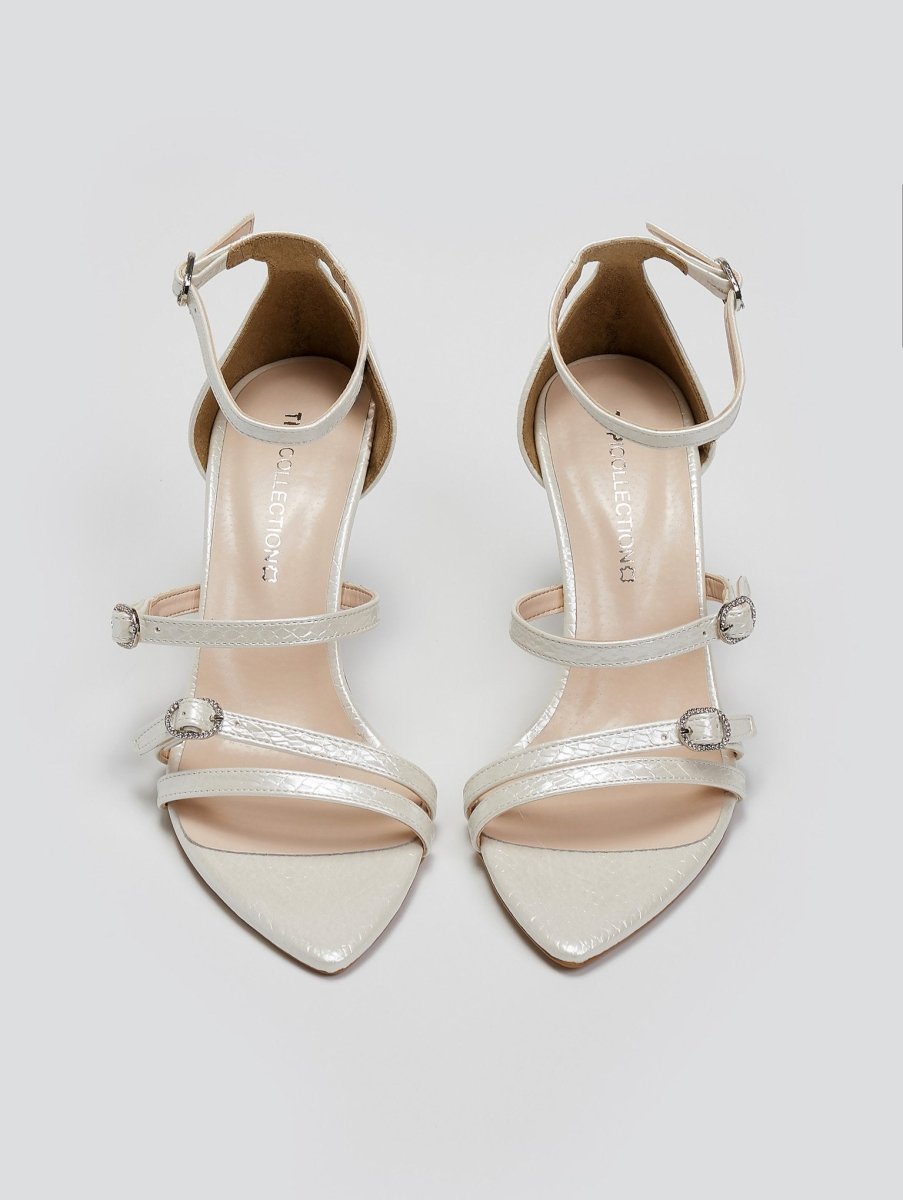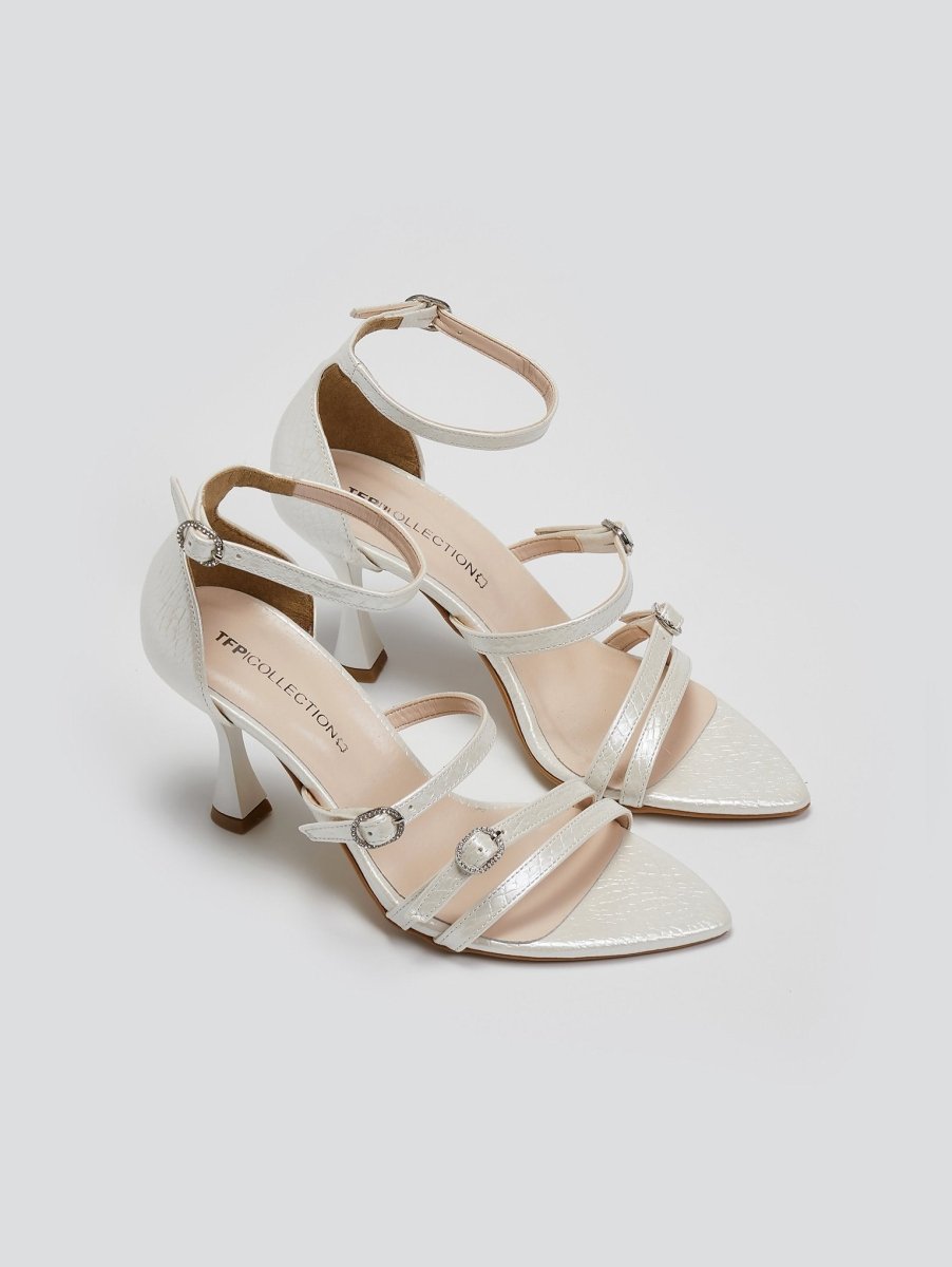 Πέδιλα με λεπτά λουράκια και διακριτικά στρας στο κούμπωμα Tfp. Ανάγλυφο print φίδι. Κλειστή φτέρνα με δέσιμο στο ύψος του αστραγάλου. Λεπτό τακούνι. Δερμάτινος πάτος. Ελληνικής κατασκευής.