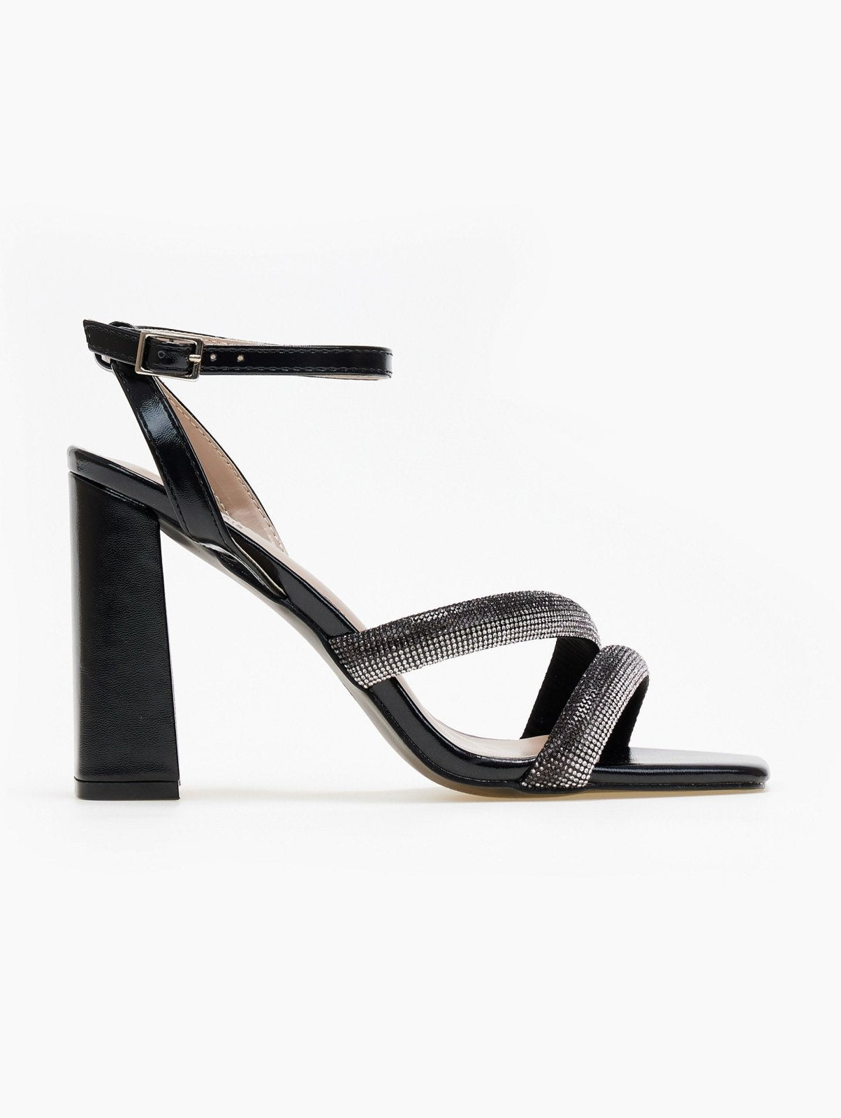 Πέδιλα με φαρδιές στρας φάσες στα δάκτυλα. Δένουν με μπαρέτα στο ύψος του στραγάλου. Ψηλό χοντρό τακούνι. Καρέ γραμμή.
