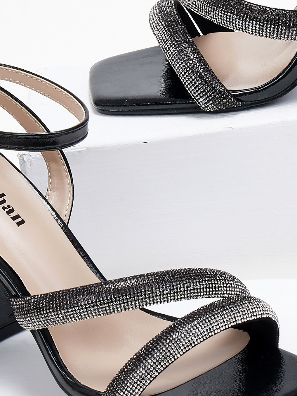 Πέδιλα με φαρδιές στρας φάσες - Μαύρο