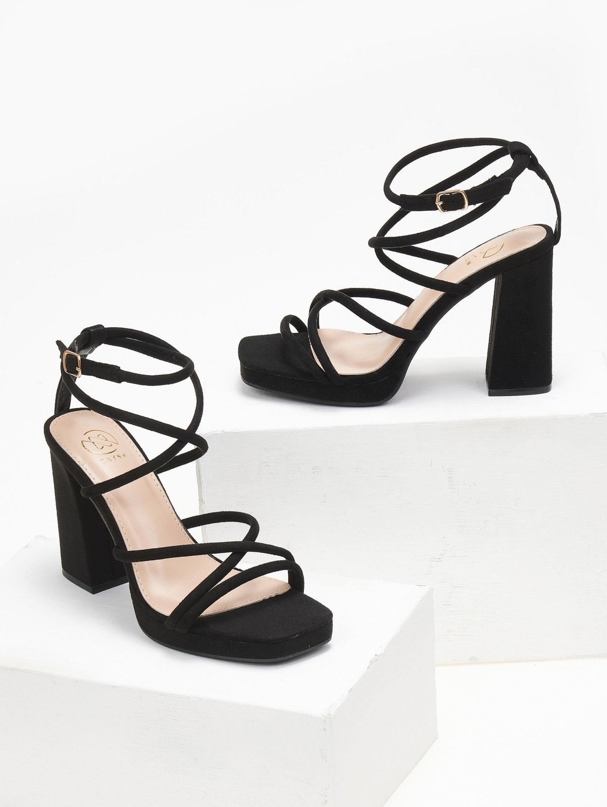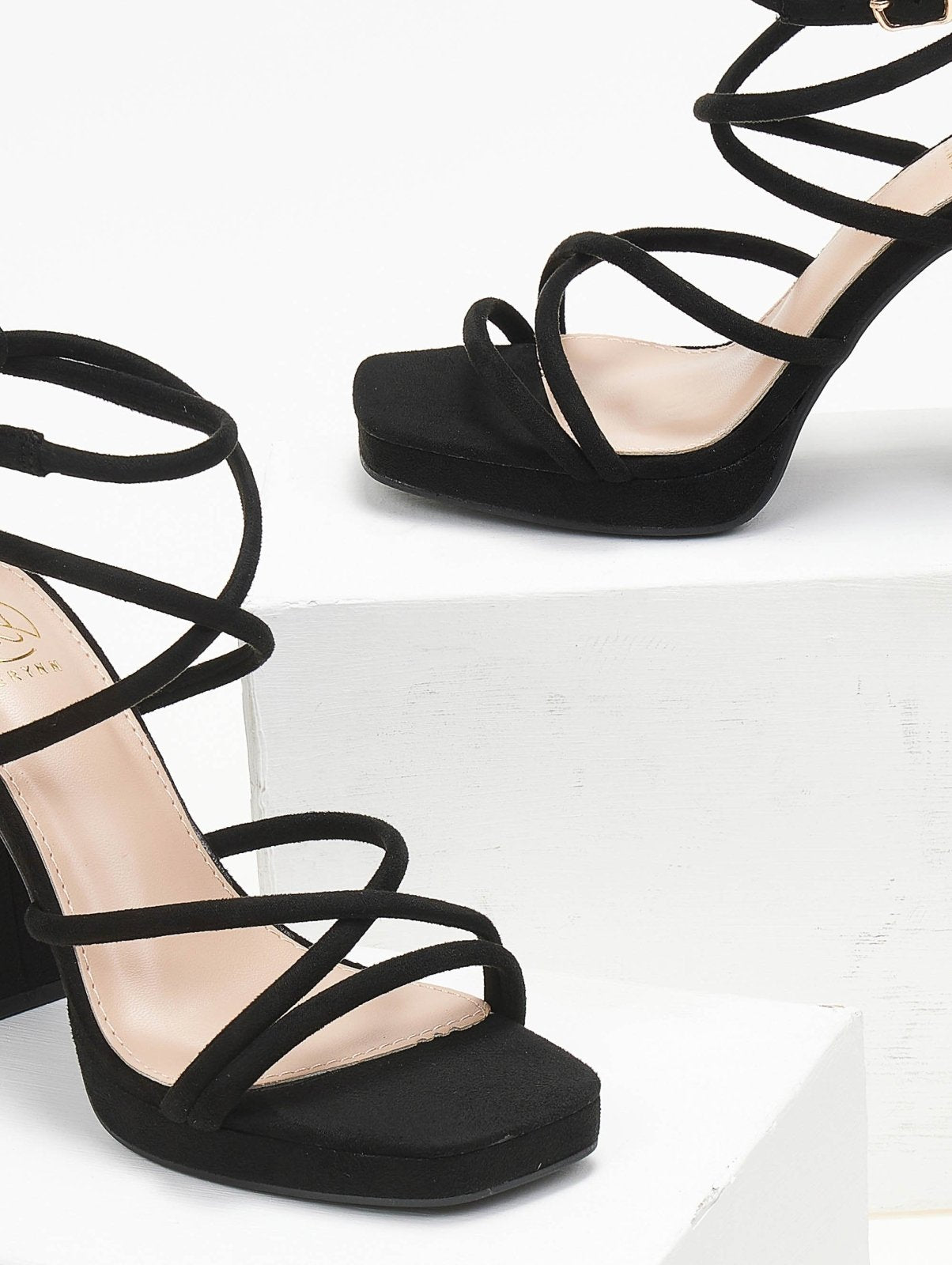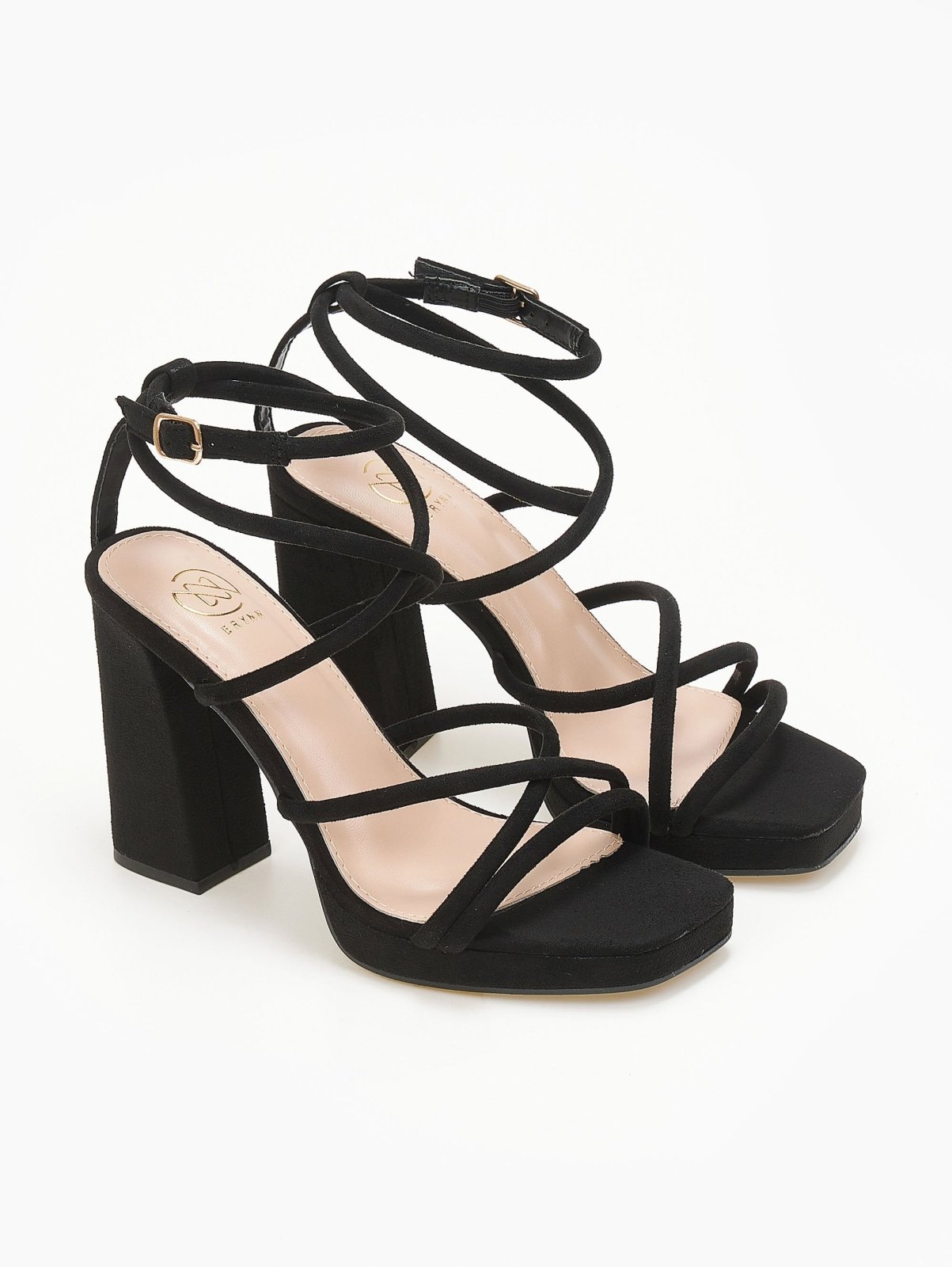 Πέδιλα suede με στρογγυλά λουράκια ERYNN. Έχουν φιάπα και ψηλό χοντρό τακούνι. Crossover σχέδιο στο κουτεπιέ. Δένουν με μπαρέτα στο ύψος του αστραγάλου. Καρέ γραμμή.