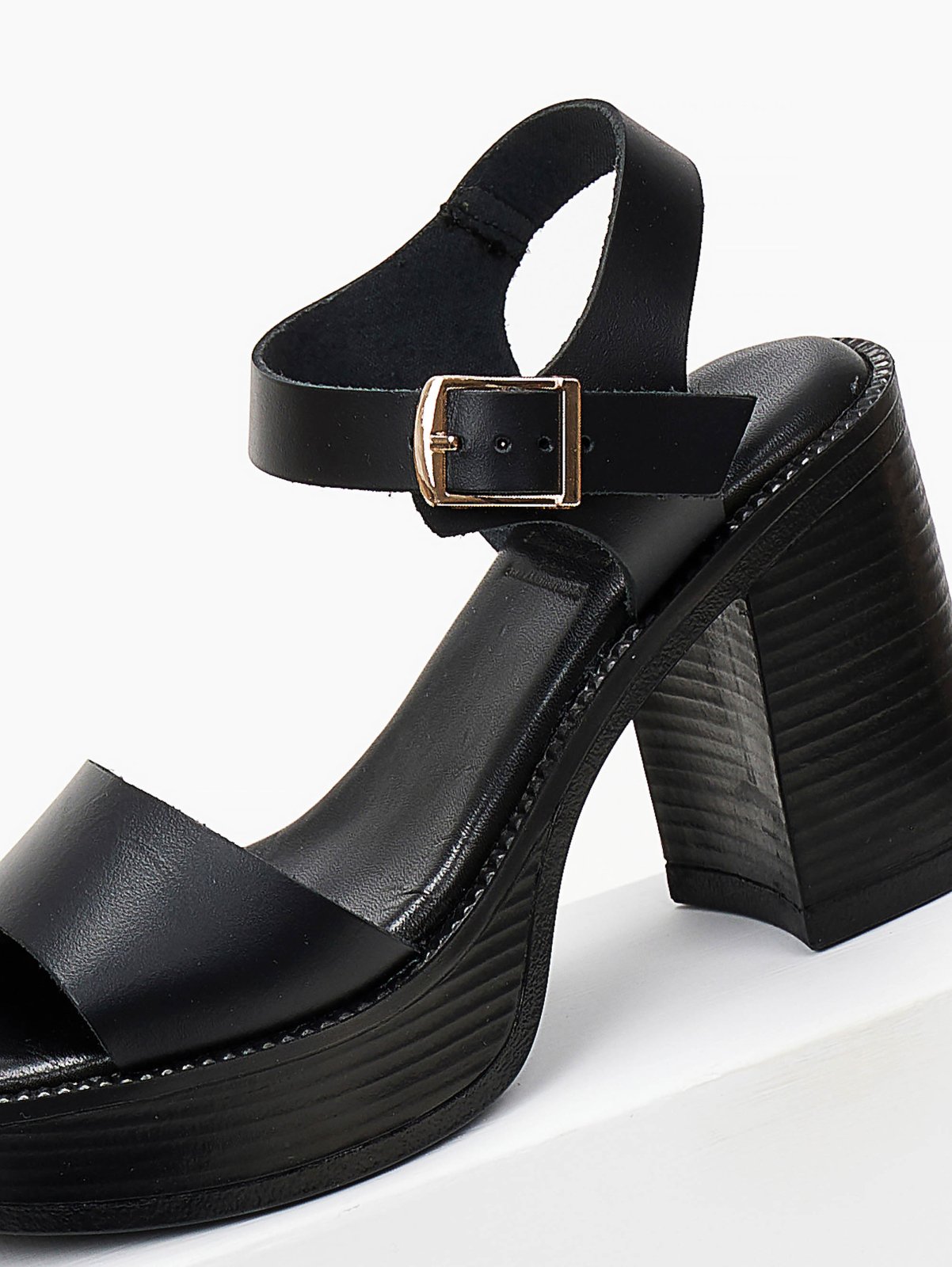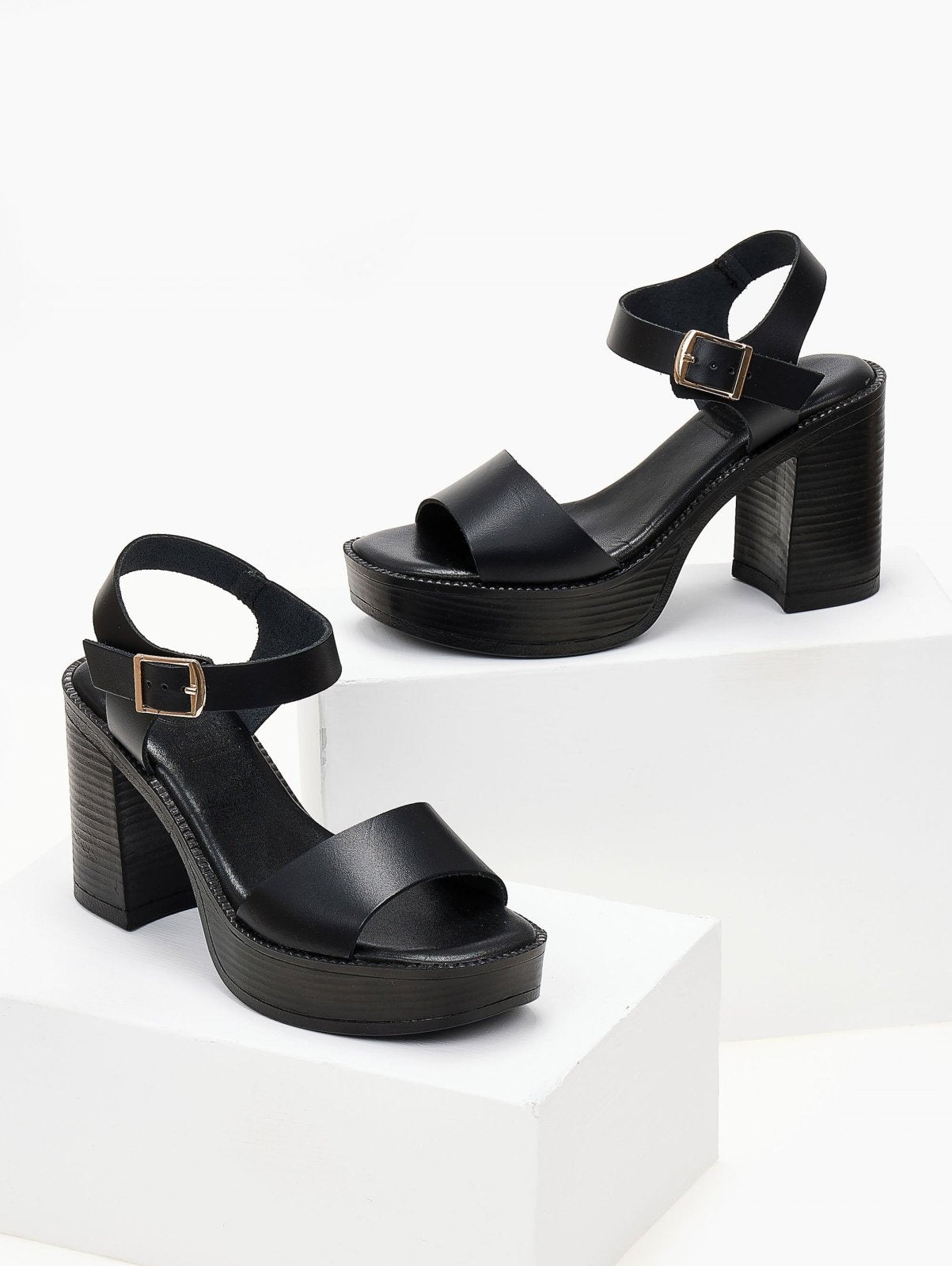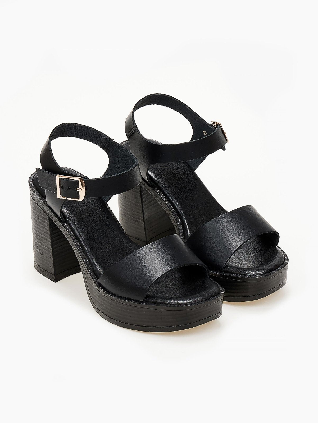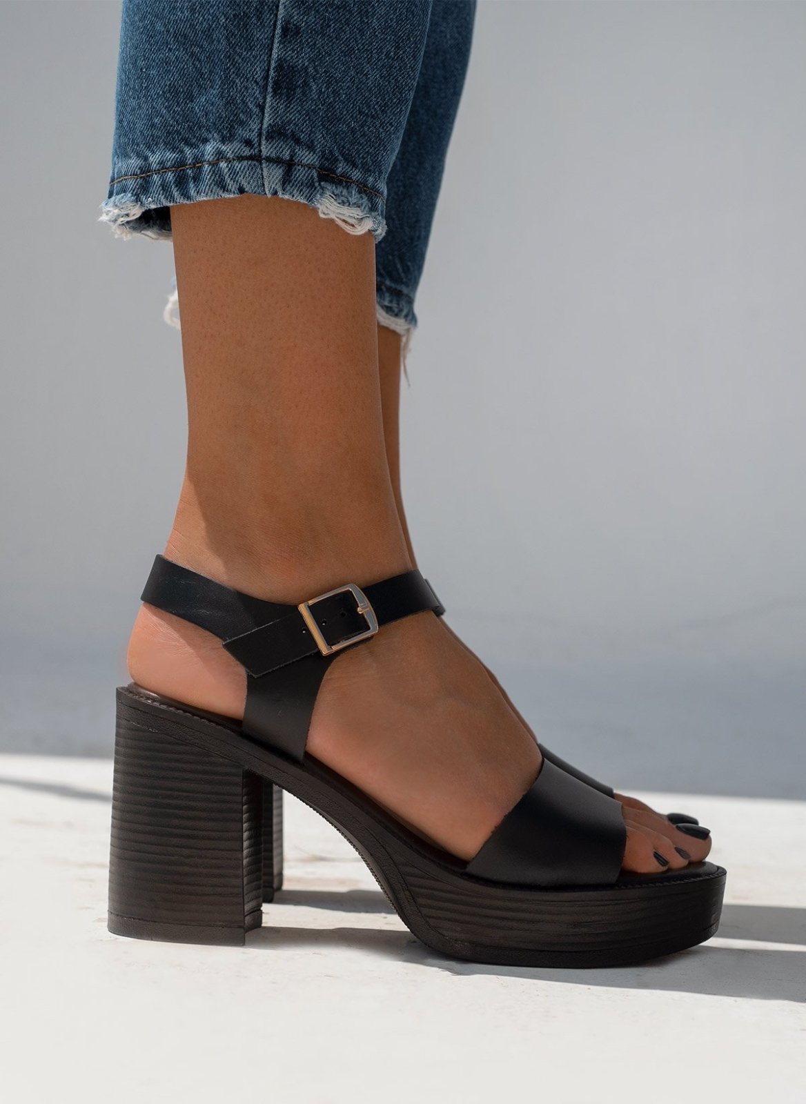 Δερμάτινα πέδιλα tfp με ψηλή φιάπα και χοντρό τακούνι. Έχουν φαρδιά φάσα. Δένουν στο πλάι με λουράκι. Ο πάτος έχει ενίσχυση. Ελληνικής κατασκευής.