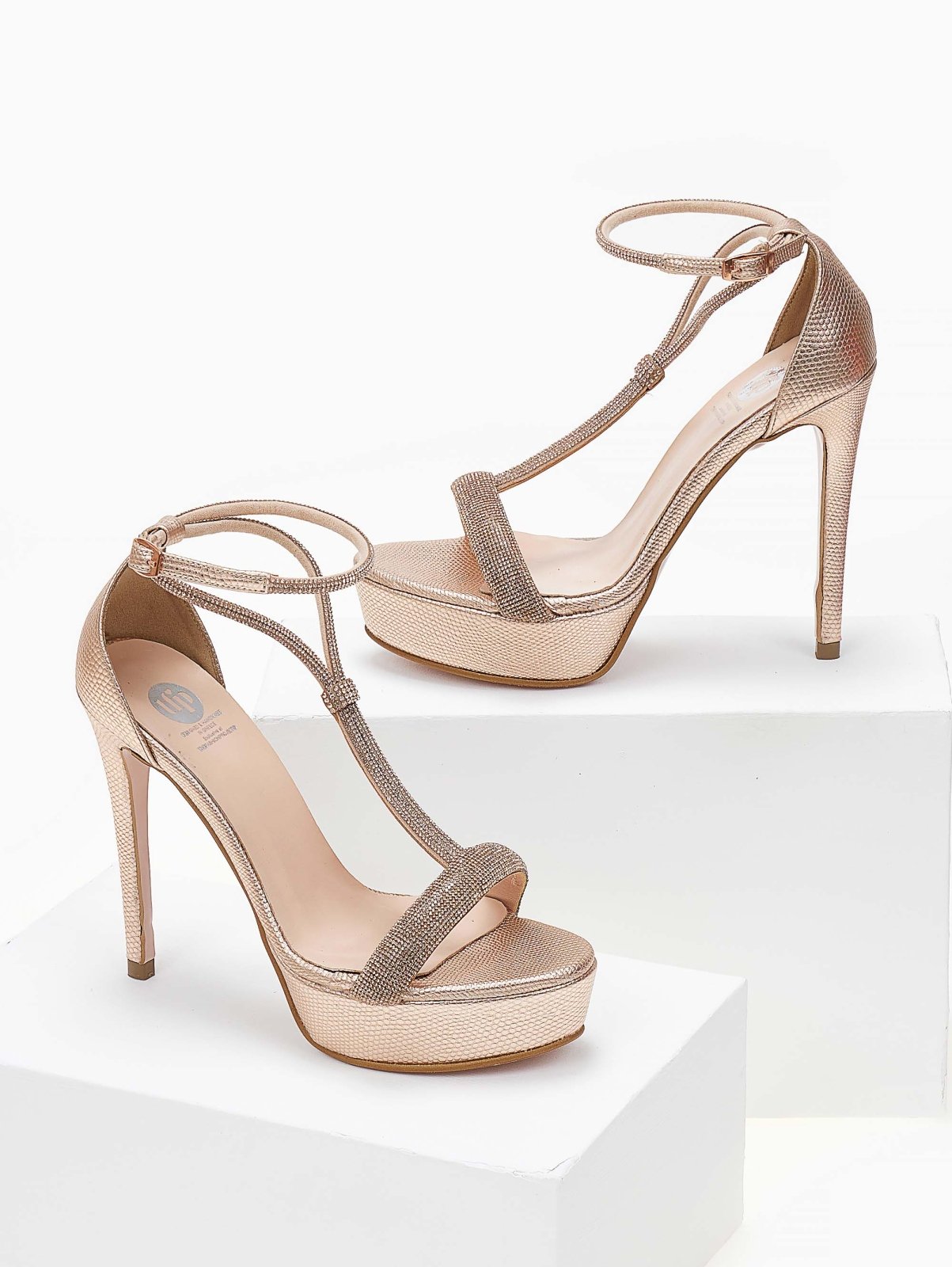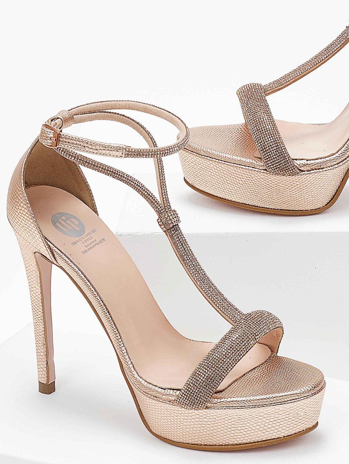 Πέδιλα tfp με φιάπα και ψηλό λεπτό τακούνι. Έχουν λουράκια από strass. Κλειστή φτέρνα. Δένουν με μπαρέτα στο ύψος του αστραγάλου. Ελληνικής κατασκευής.