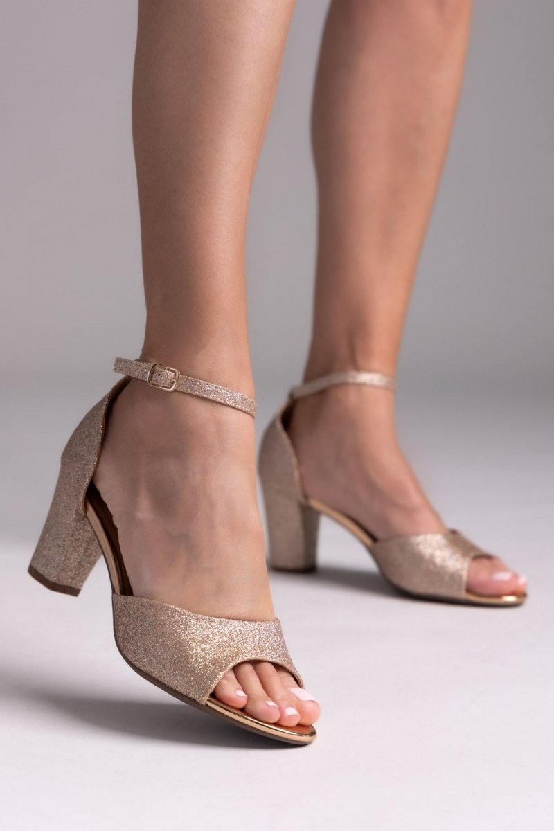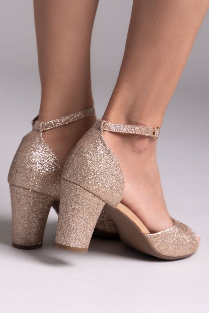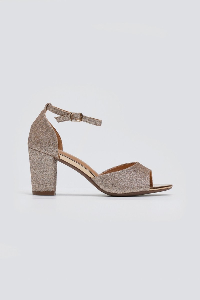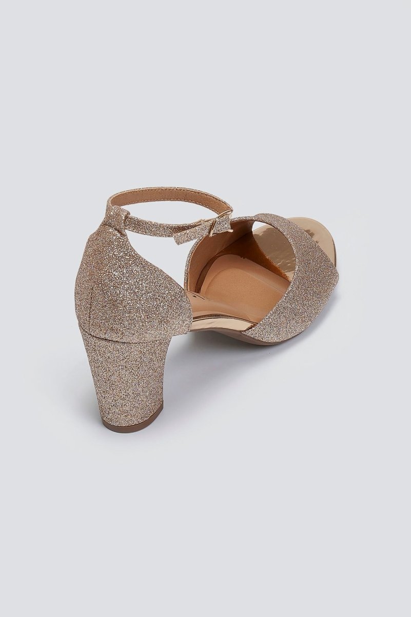 Πέδιλα γκλίτερ με χαμηλό τακούνι. Φαρδιά φάσα στα δάκτυλα. Κλειστή φτέρνα. Δένουν με μπαρέτα στο ύψος του αστραγάλου.