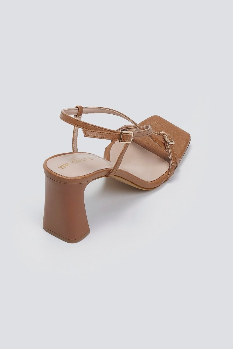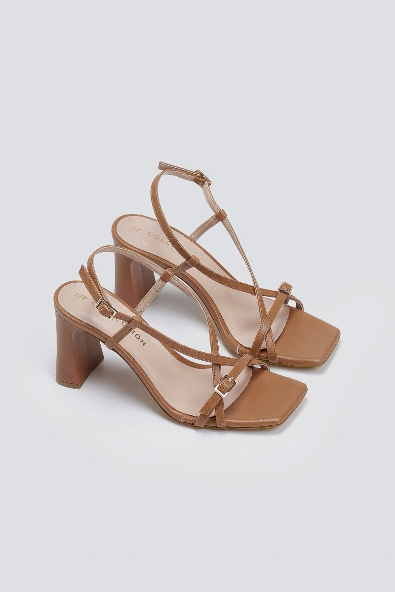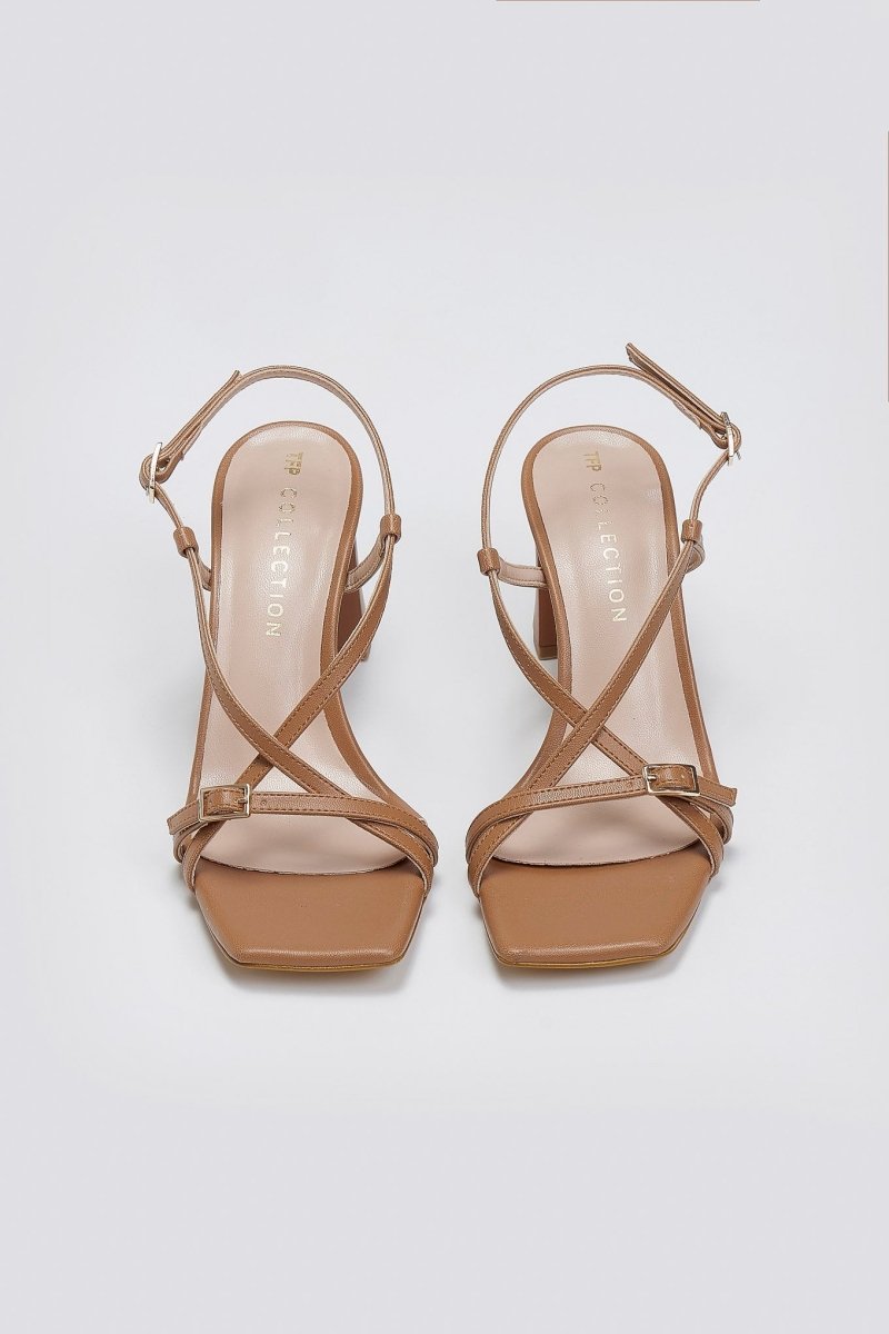 Πέδιλα με λεπτά λουράκια και crossover σχέδιο TFP. Δένουν στο πλάι με μικρό τοκά. Τετράγωνη γραμμή. Ελληνικής κατασκευής.