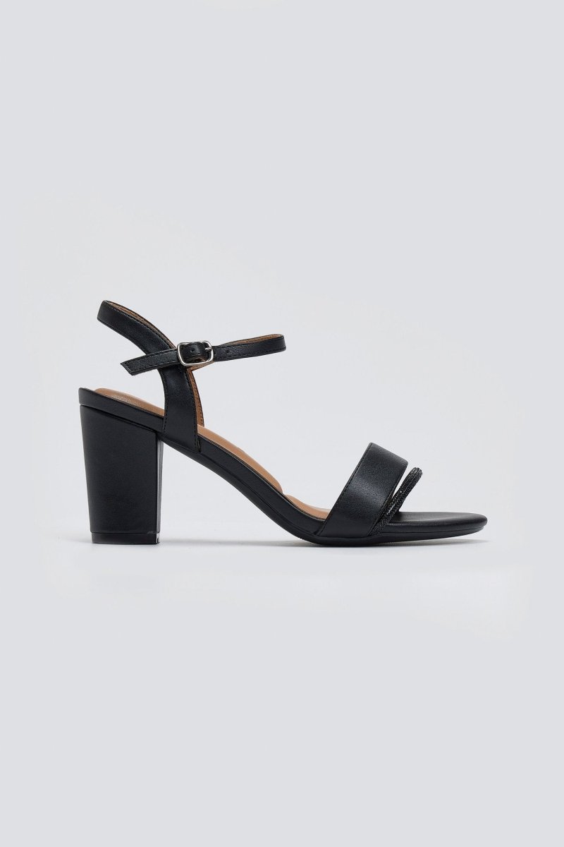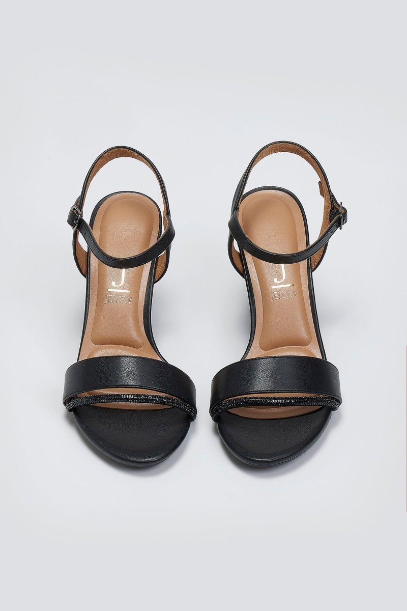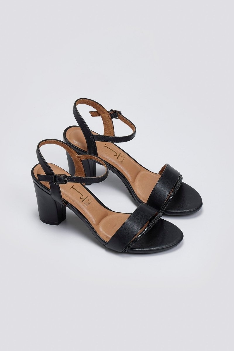 Πέδιλα με φάσα και στρας λουράκι στα δάκτυλα. Δένουν με μπαρέτα στο ύψος του αστραγάλου. Χαμηλό τακούνι.