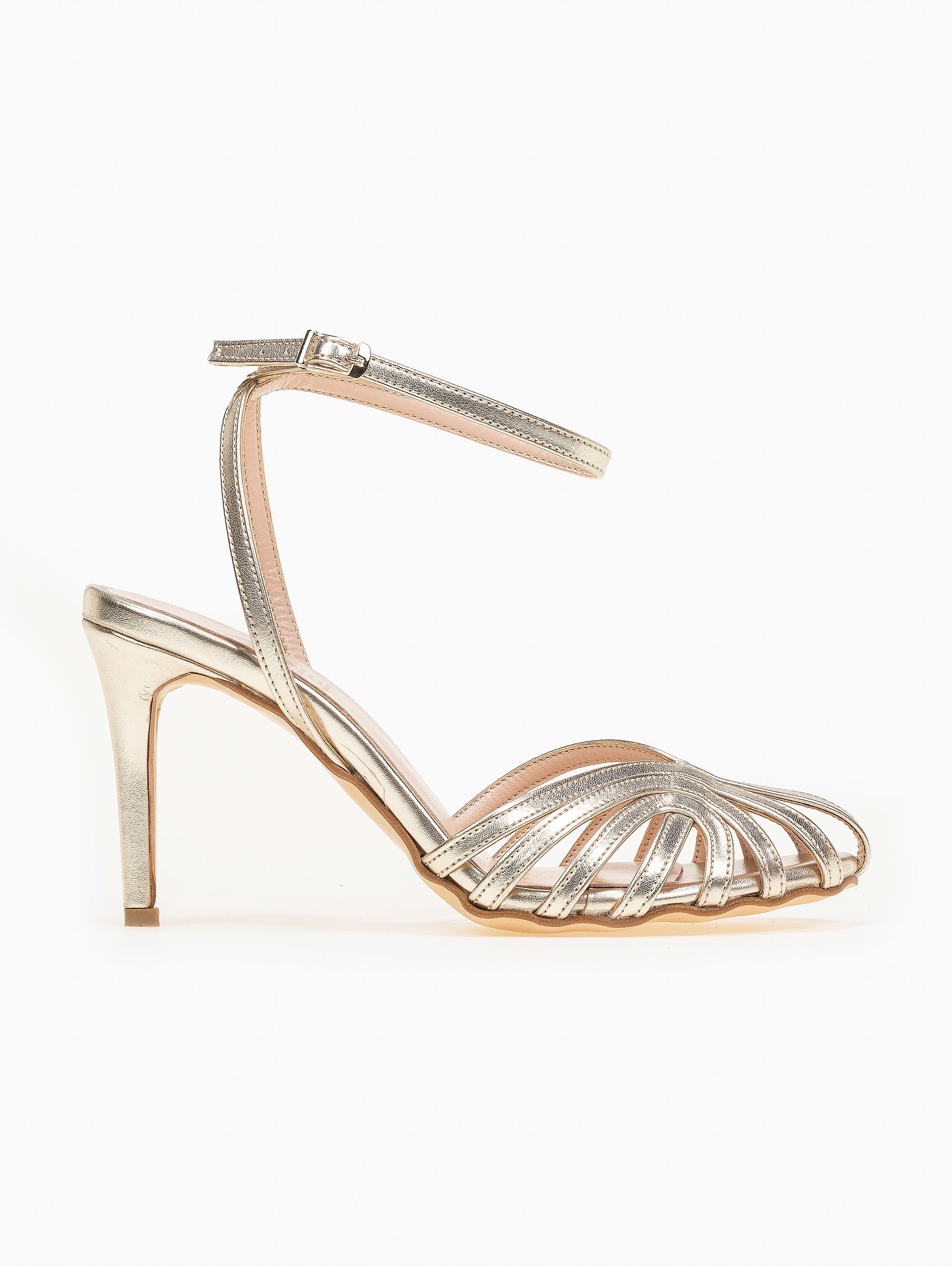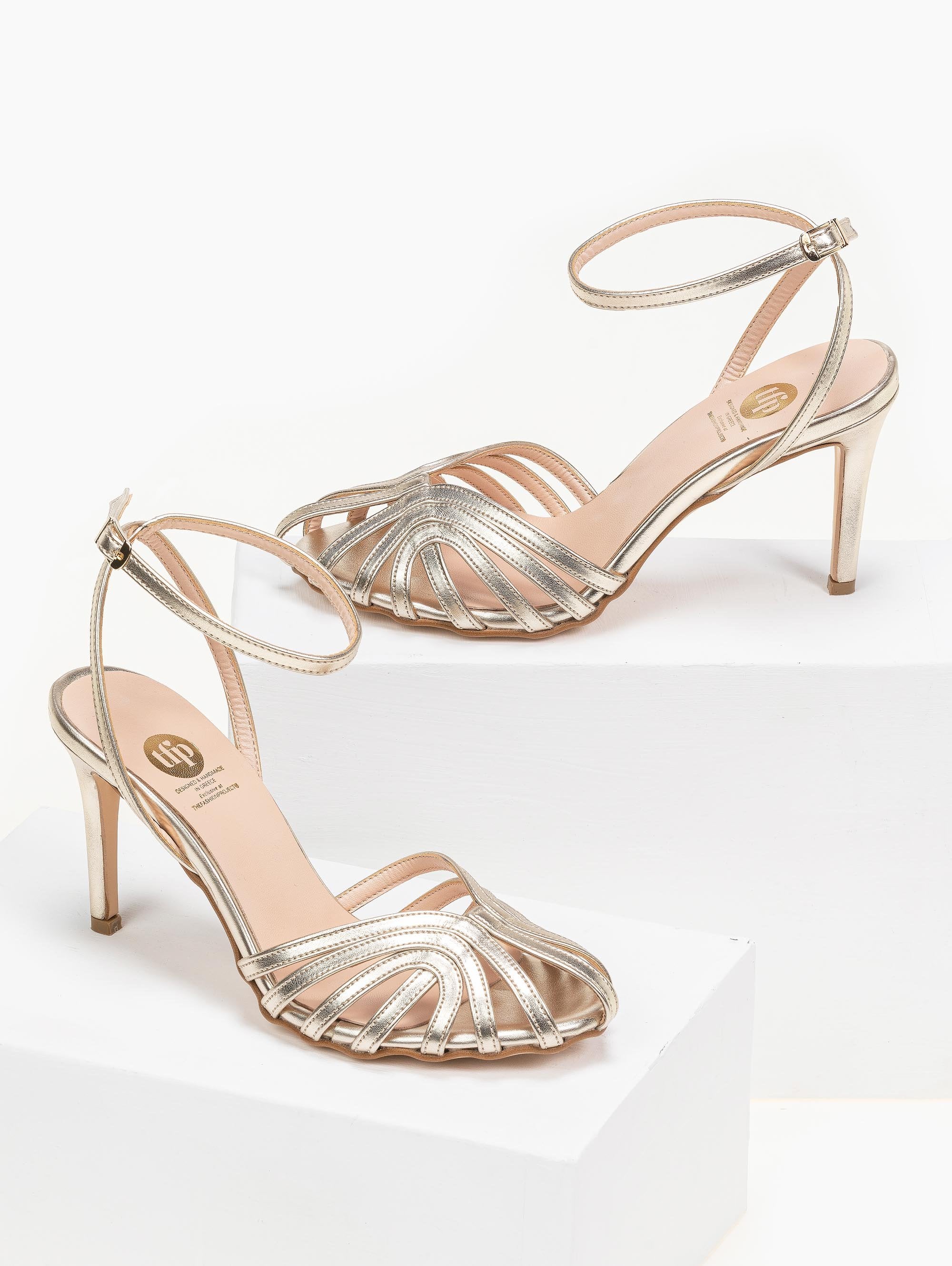 Ρετρό TFP πέδιλα σε μεταλλικές αποχρώσεις. Δένουν με χιαστί λουράκια στο ύψος του αστραγάλου. Ελληνικής κατασκευής.