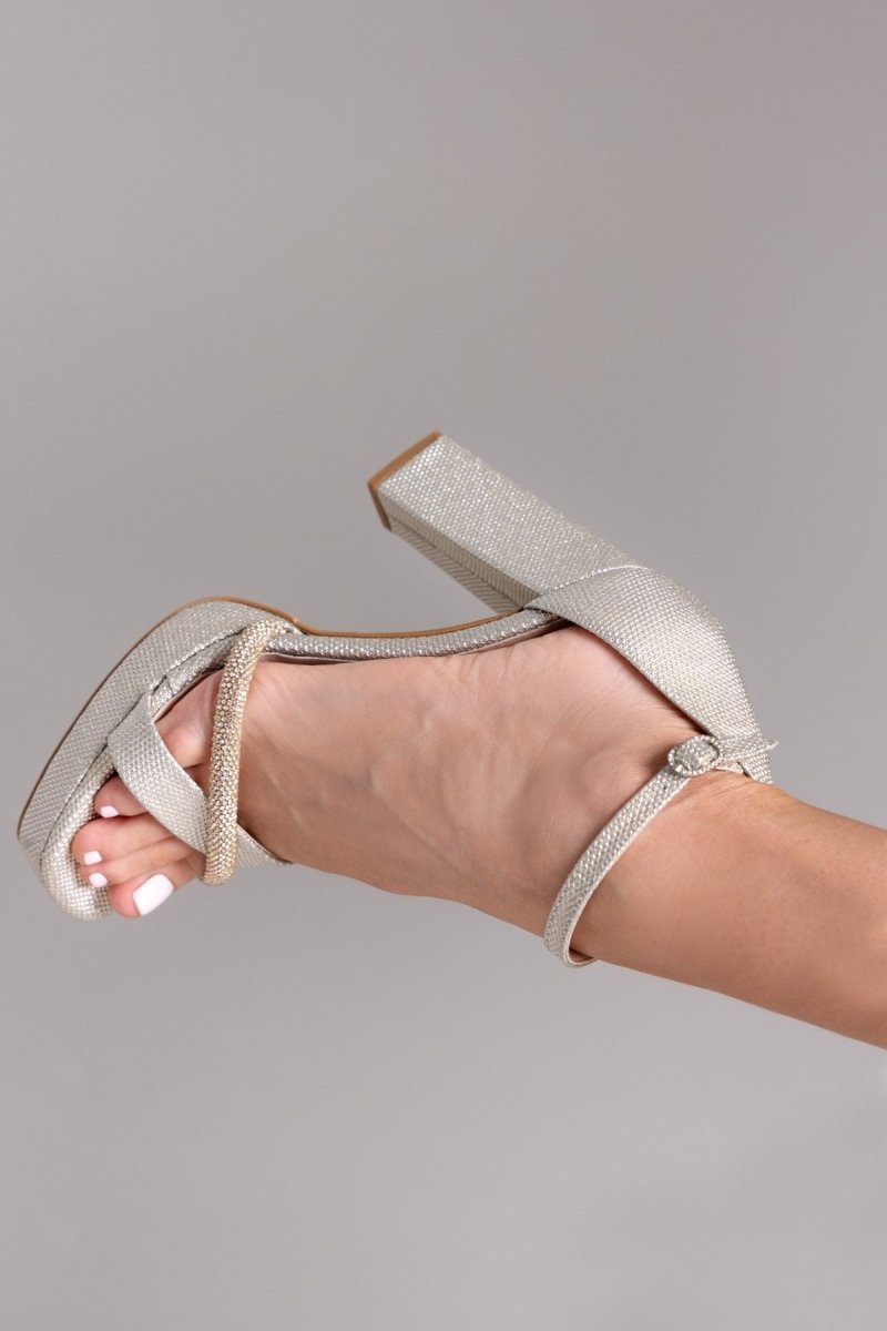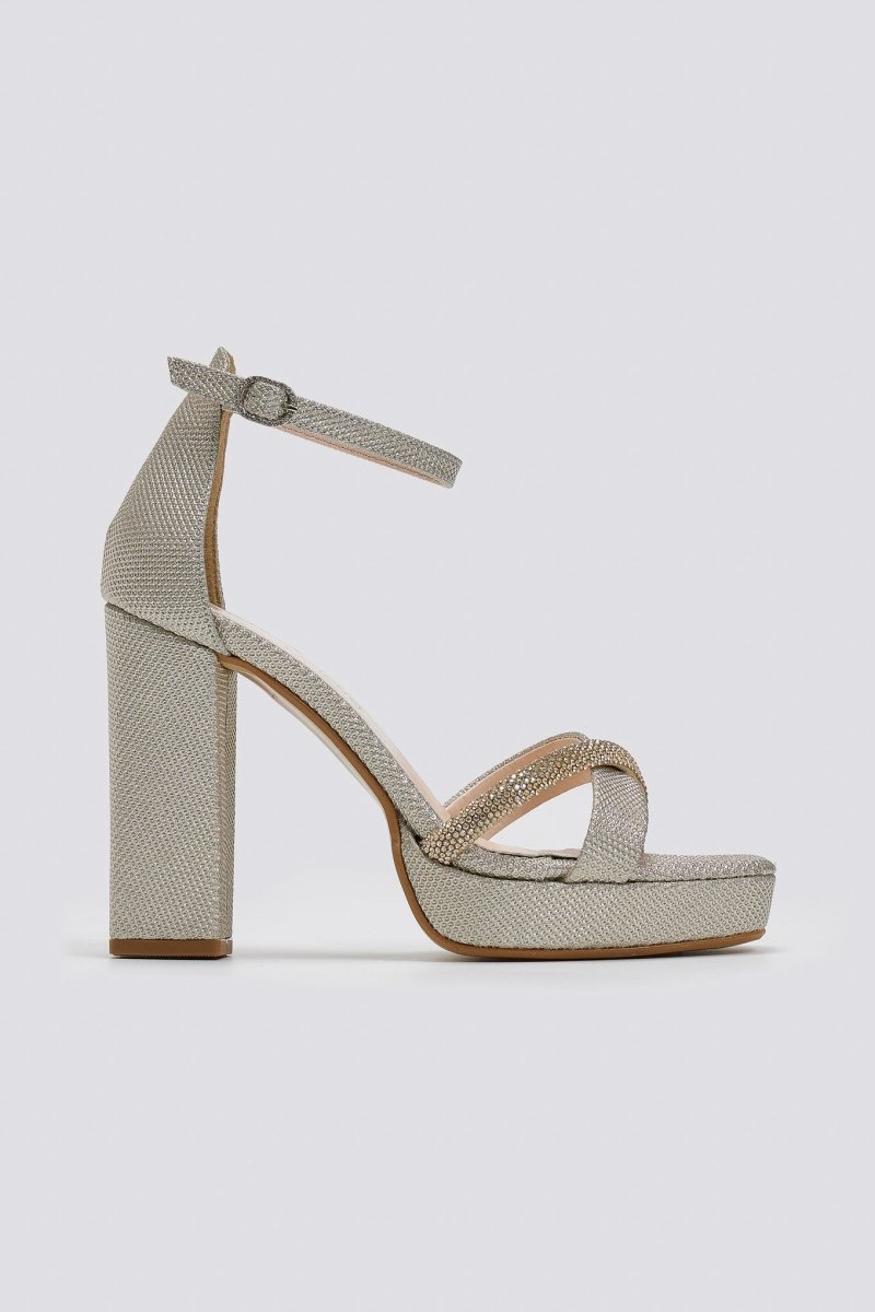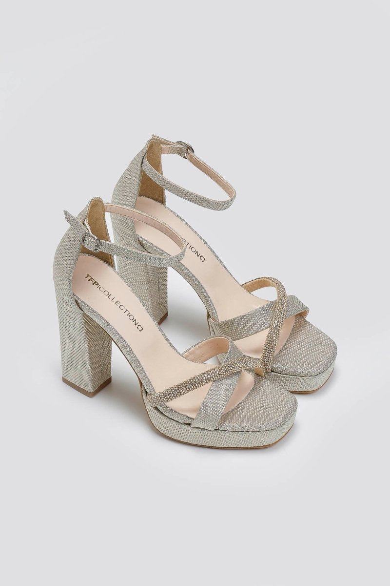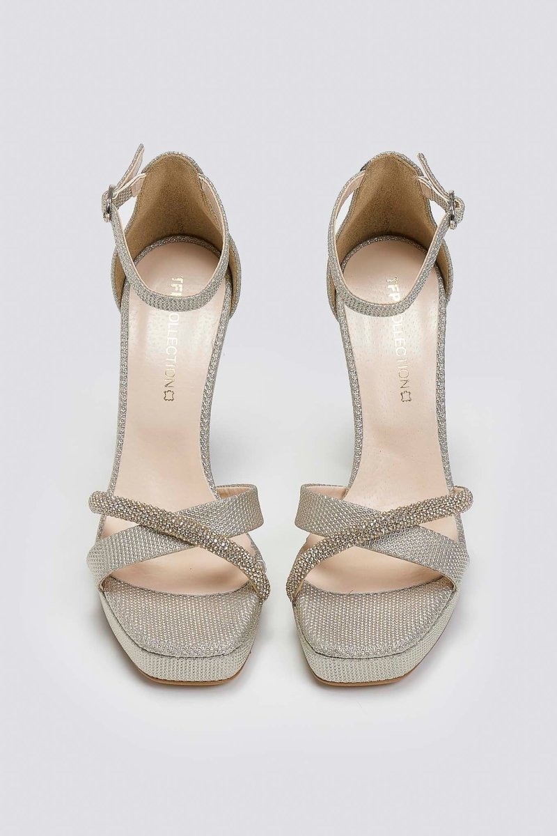 Πέδιλα από ιδιαίτερο ύφασμα TFP. Crossover λουράκια με στρας σειρά στα δάκτυλα. Κλειστή φτέρνα. Δένουν με μπαρέτα στο ύψος του αστραγάλου. Δερμάτινος πάτος. Ελληνικής κατασκευής.