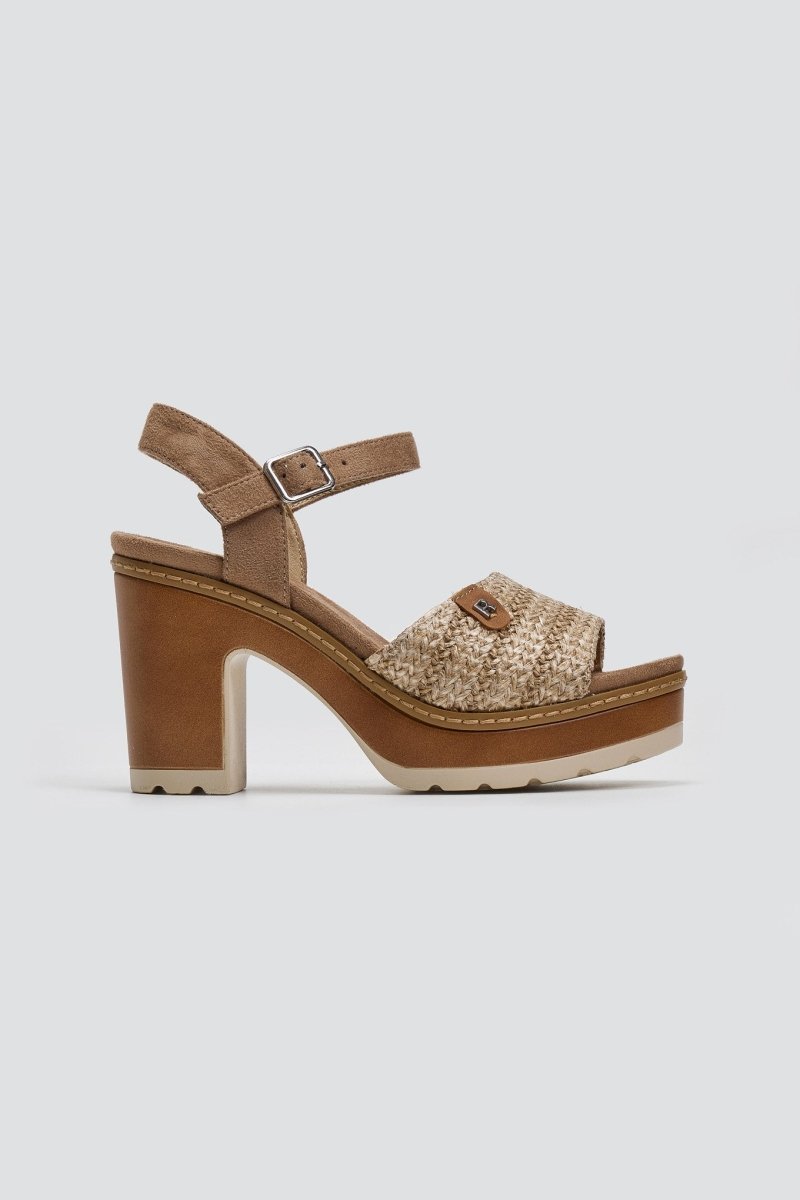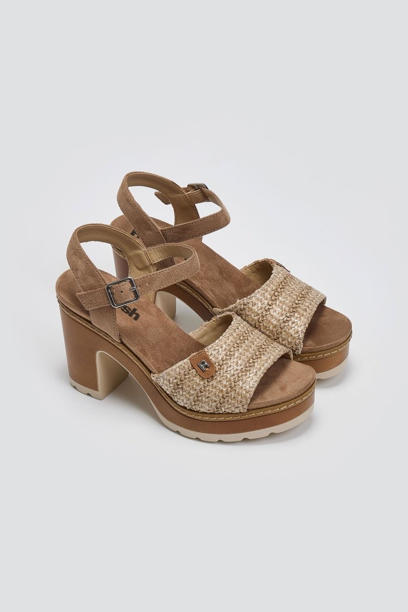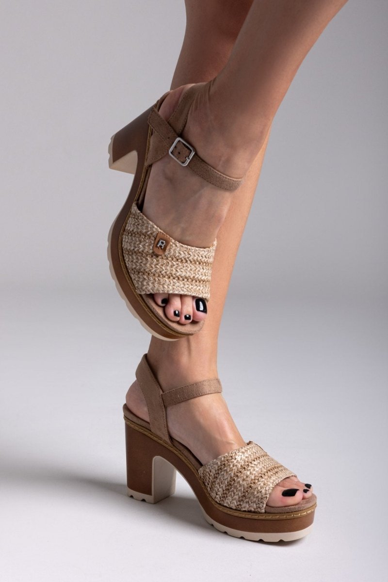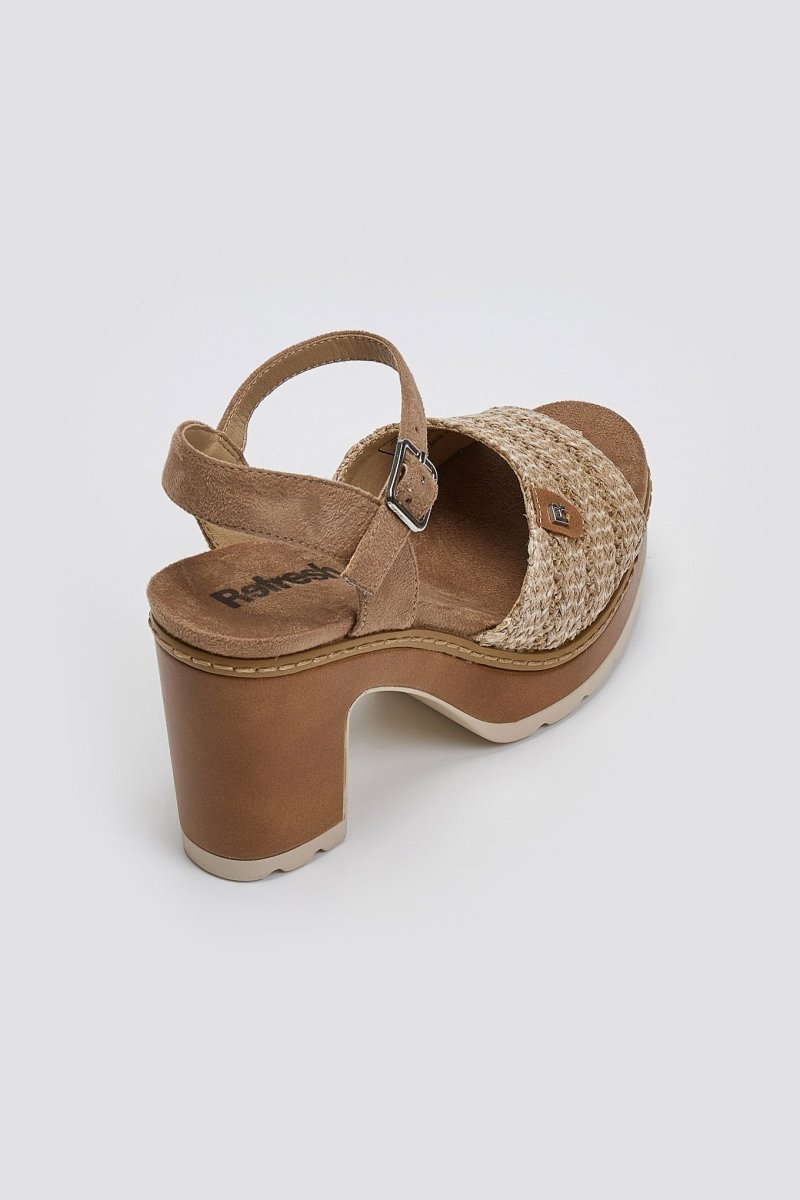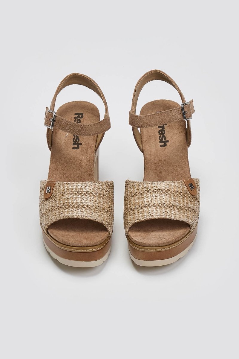 Πέδιλα με φαρδιά ψάθινη φάσα Refresh. Δένουν με μπαρέτα στο ύψος του αστραγάλου. Ελαφριά σόλα με χοντρό τακούνι και φιάπα. Comfort biotech μαλακός πάτος με memory foam. Peta Vegan approved.