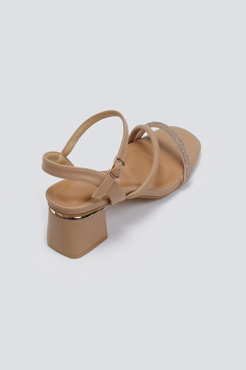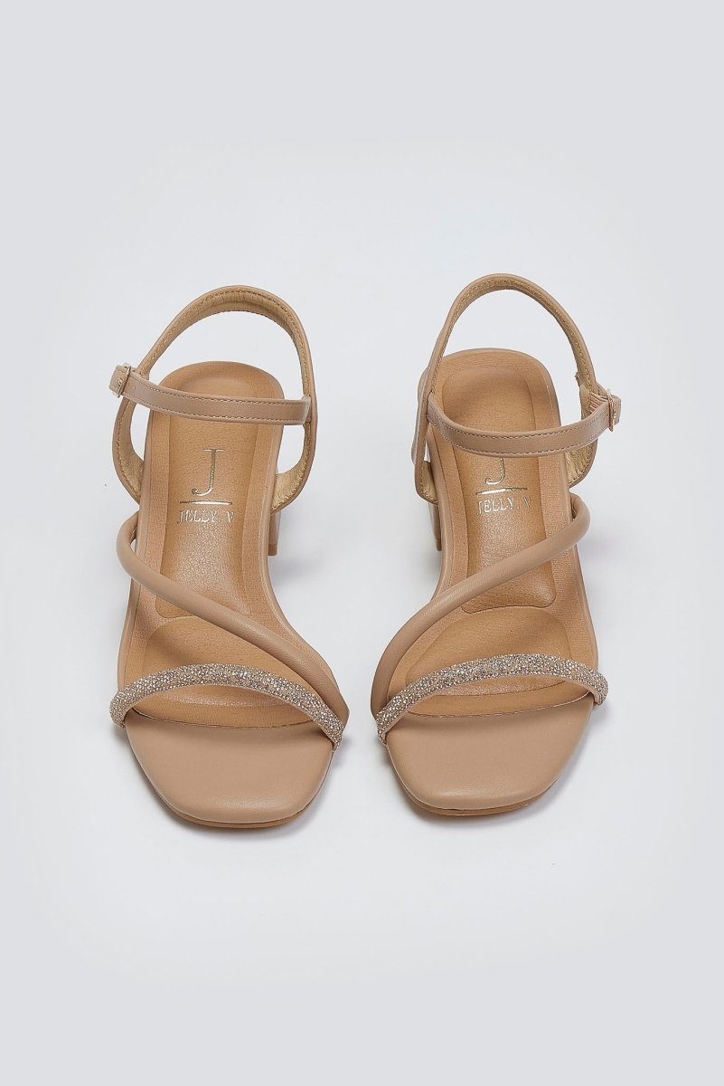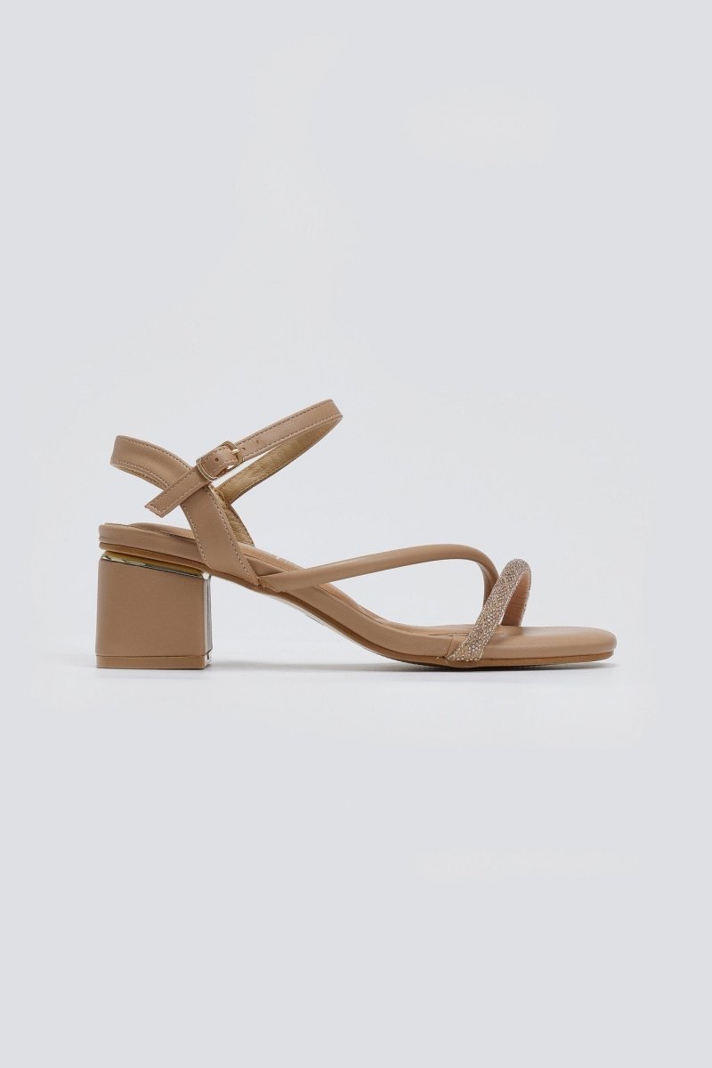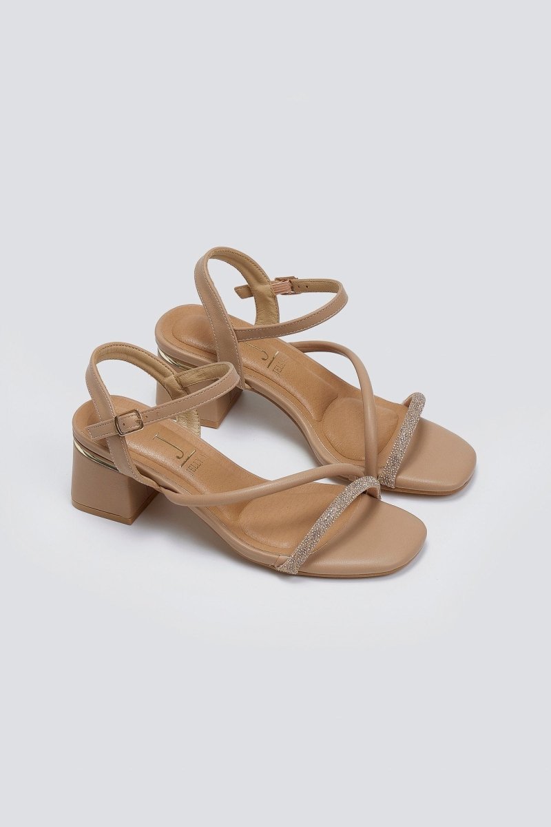 Πέδιλα χαμηλά με μεταλλική λεπτομέρεια στο τακούνι. Λεπτό στρας λουράκι στα δάκτυλα. Δένουν με μπαρέτα στο ύψος του αστραγάλου. Μαλακός πάτος με ενίσχυση.