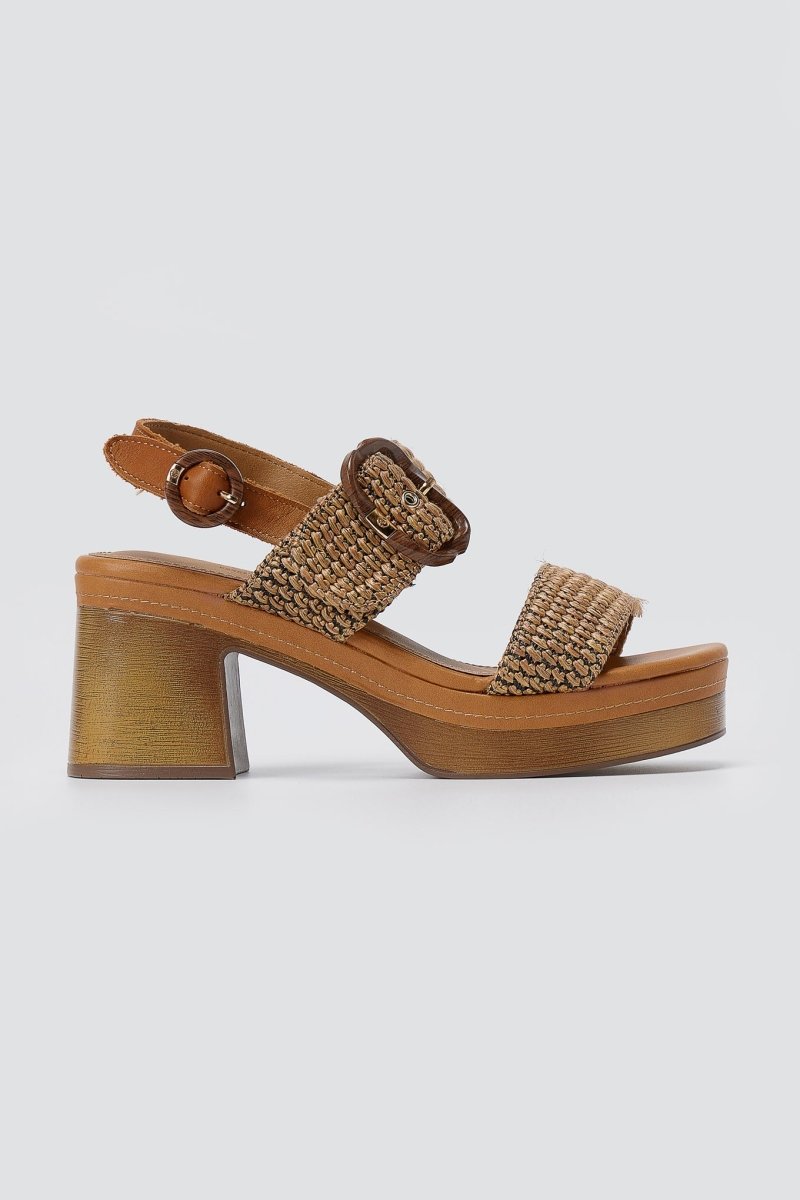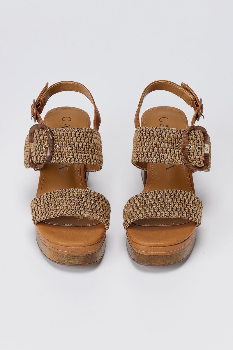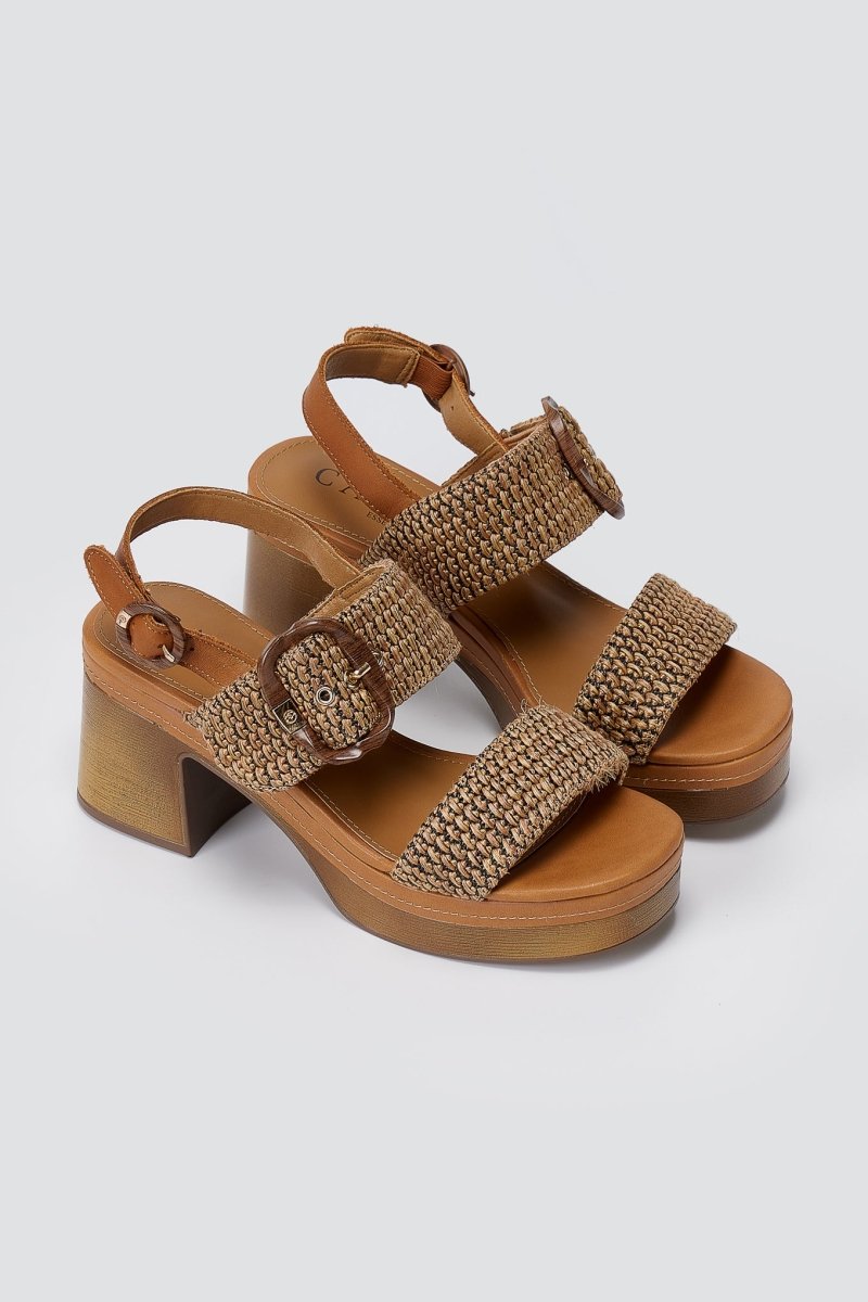 The CARMELA Platform Block Heel Sandals in Camel are the ultimate statement piece for bold summer styling. Featuring a striking high block heel and woven raffia straps, these sandals combine contemporary design with practical comfort. The secure side strap fastening and eye-catching statement buckle detail ensure both style and stability, making them an essential addition to your warm-weather wardrobe.