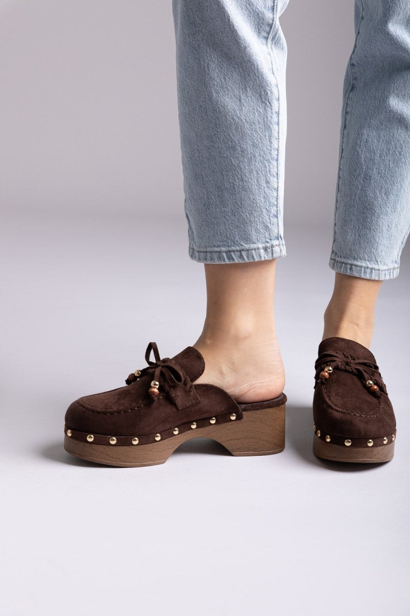 Suede platform clogs with fringe detailing and a wood-effect sole, finished with subtle metallic studs at the sides. Effortless lift and comfort crafted for modern women.