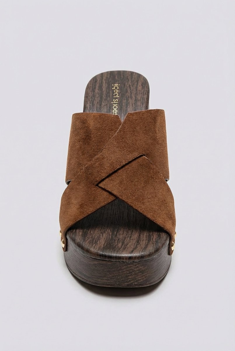 Platform mules with wide slip-on straps and side stud accents. Wood-effect sole adds polish, while cushioned comfort makes them perfect for modern women day to night.