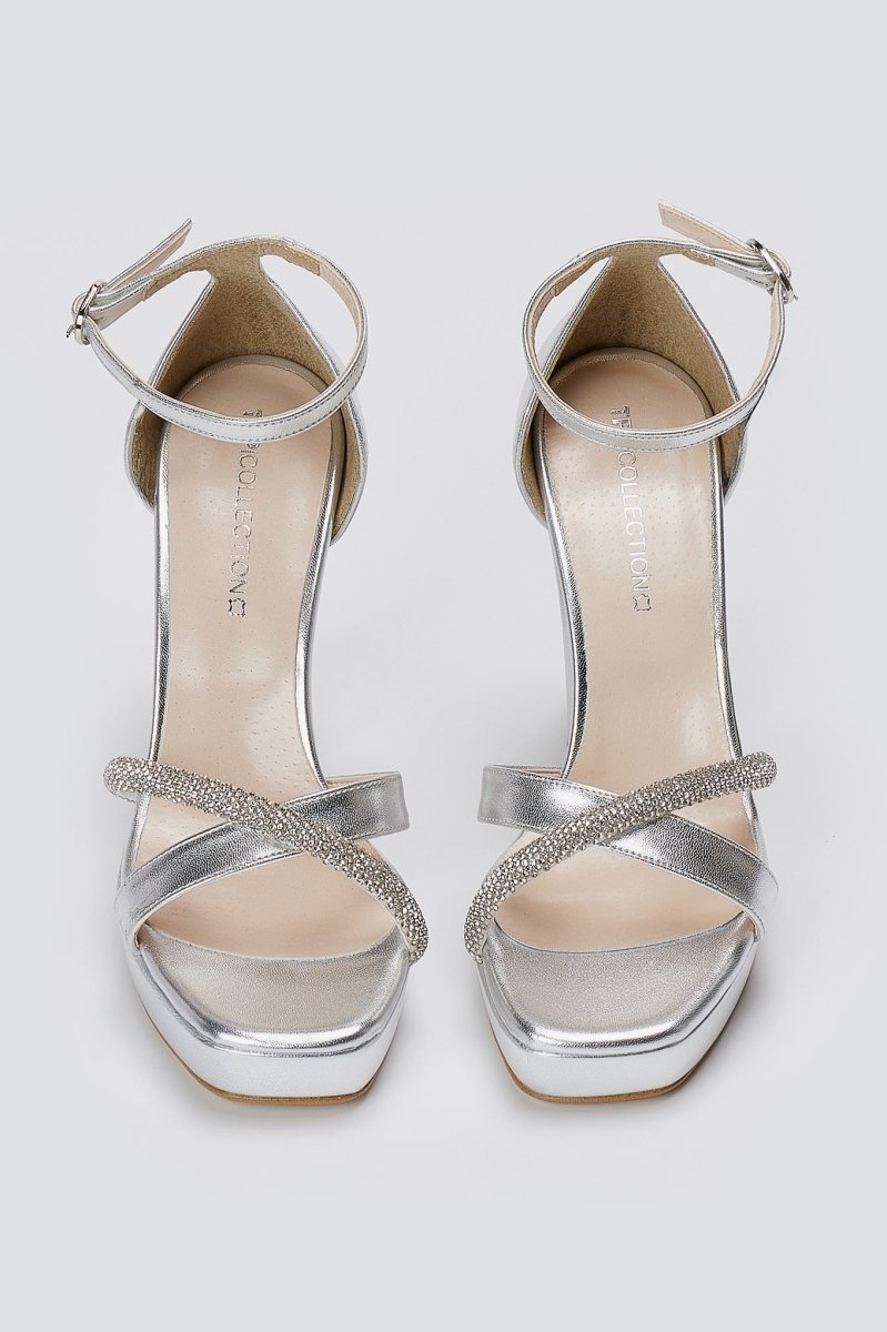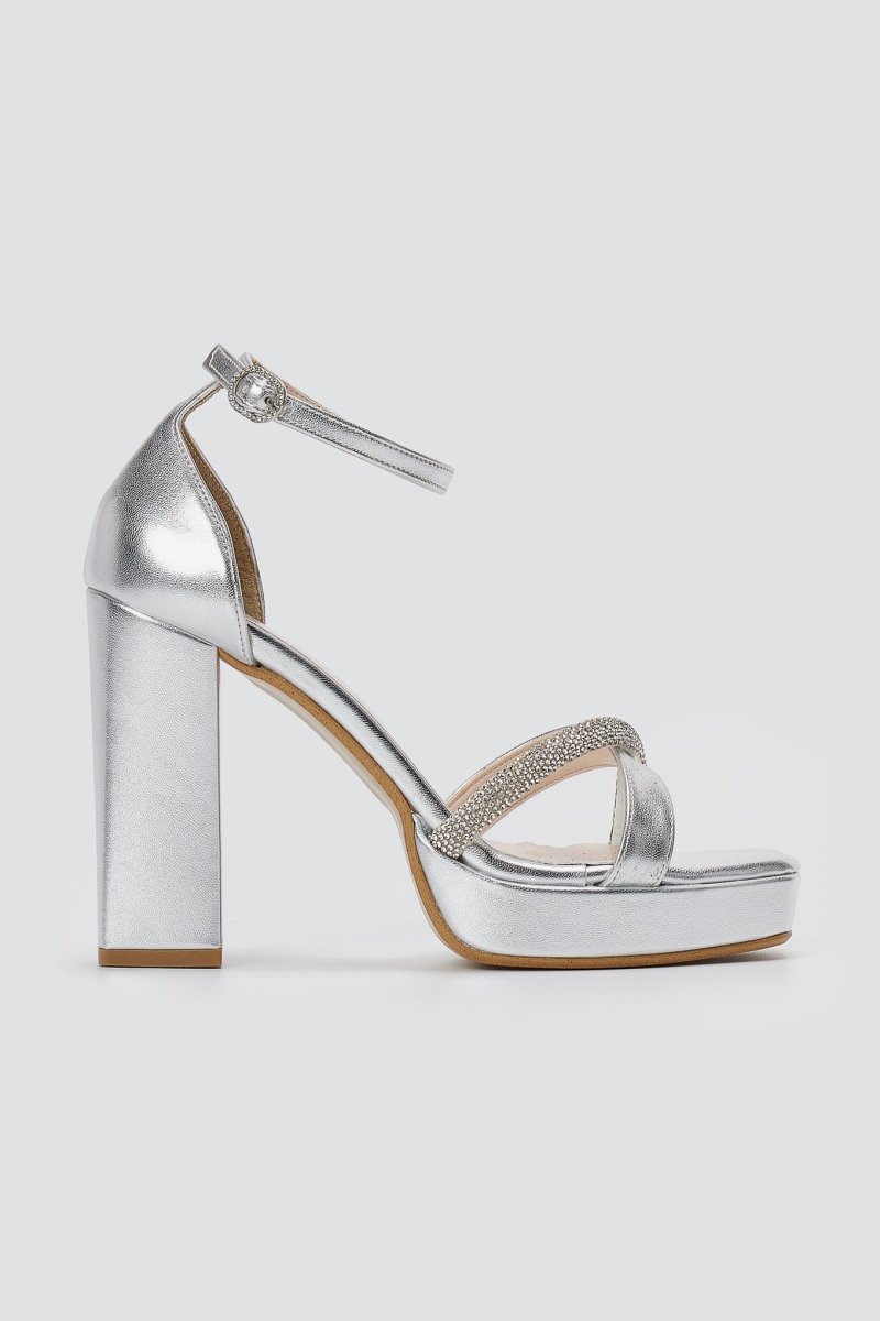 Platform sandals with a stable block heel, closed heel and ankle strap. Crossover rhinestone toe straps add refined shine with a secure, comfortable fit for modern women.
