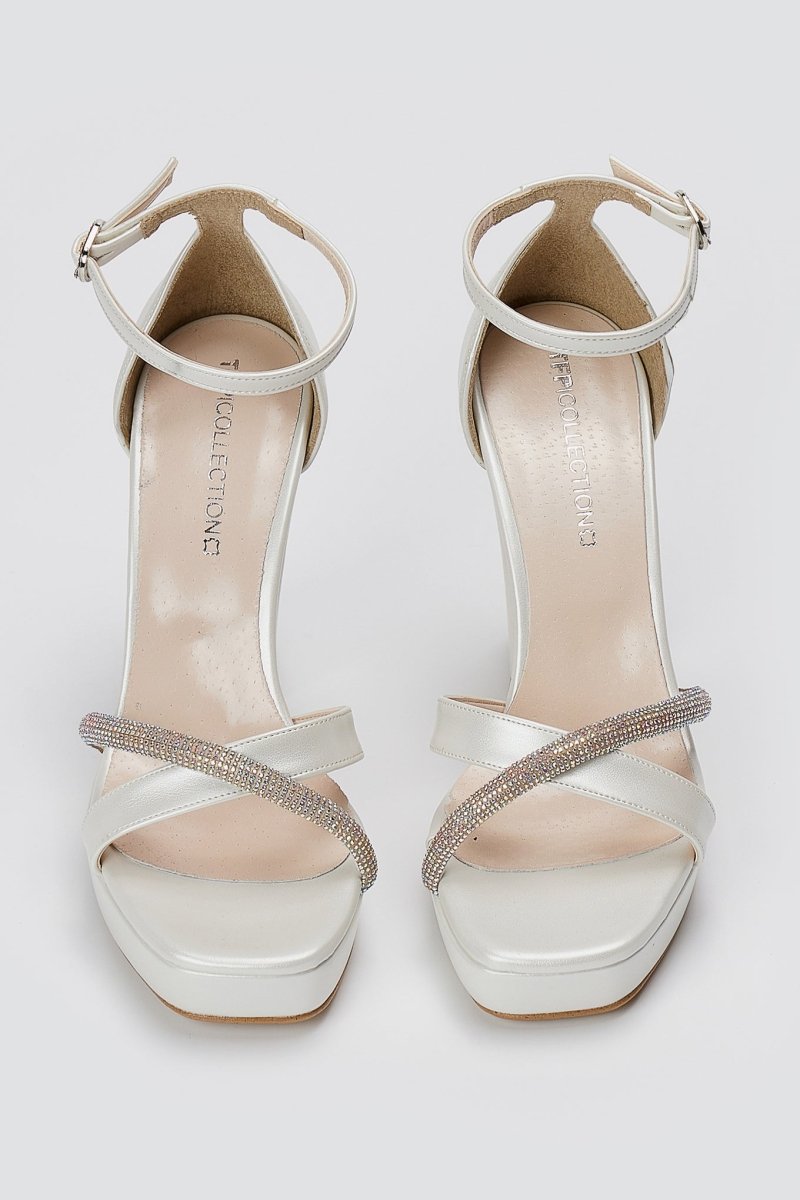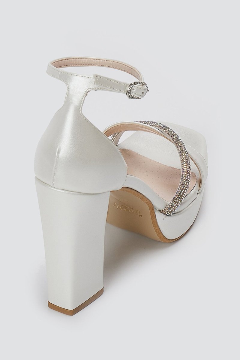 Platform sandals with a stable block heel, closed heel and ankle strap. Crossover rhinestone toe straps add refined shine with a secure, comfortable fit for modern women.