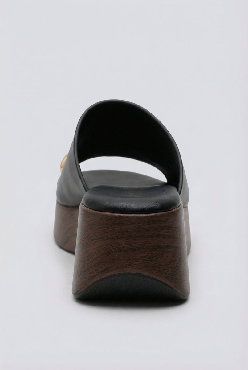 Platform sandals with a wide woven strap and toe ring, finished with a metallic accent and wood-effect sole. Soft cushioned footbed adds comfort, crafted for modern women.