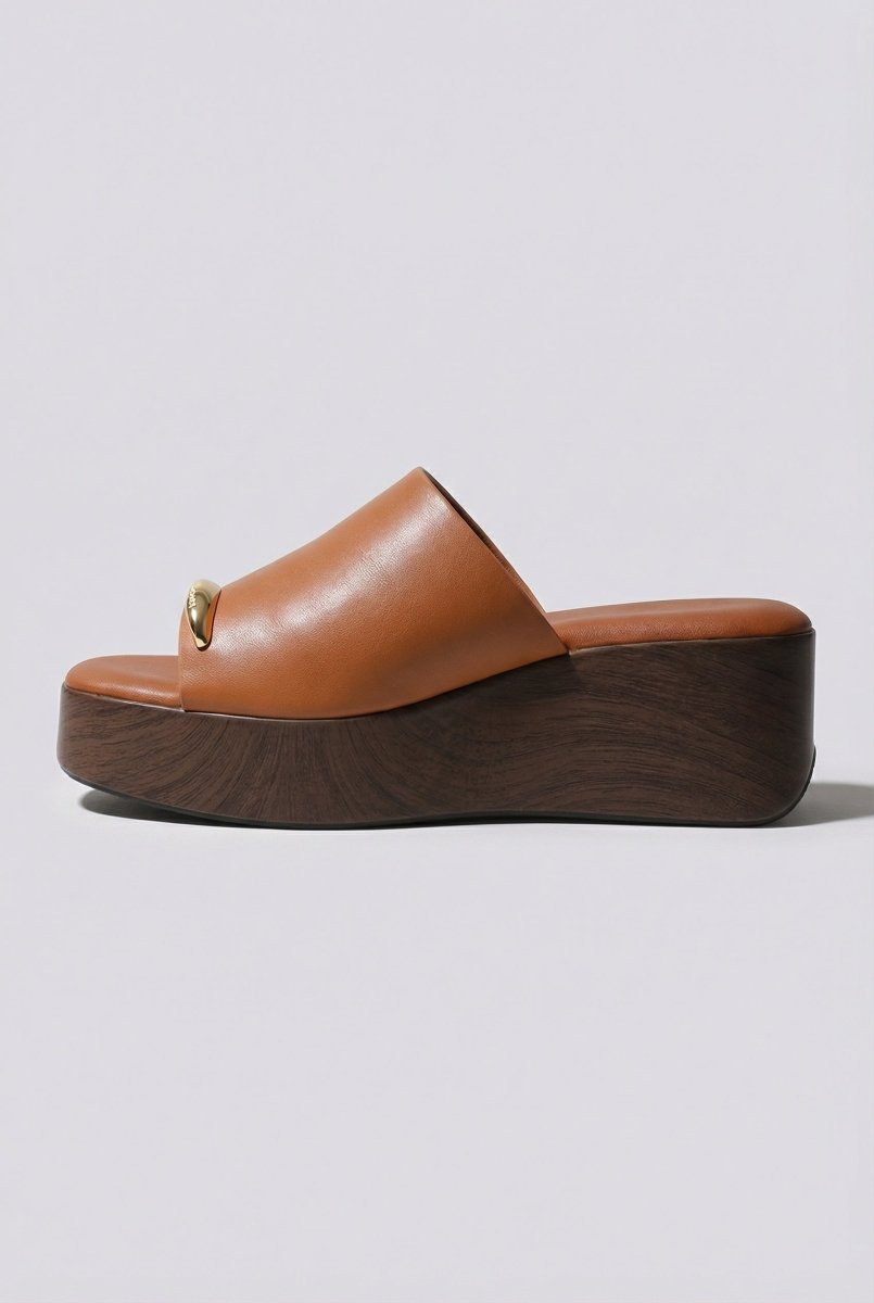 Platform sandals with a wide woven strap and toe ring, finished with a metallic accent and wood-effect sole. Soft cushioned footbed adds comfort, crafted for modern women.
