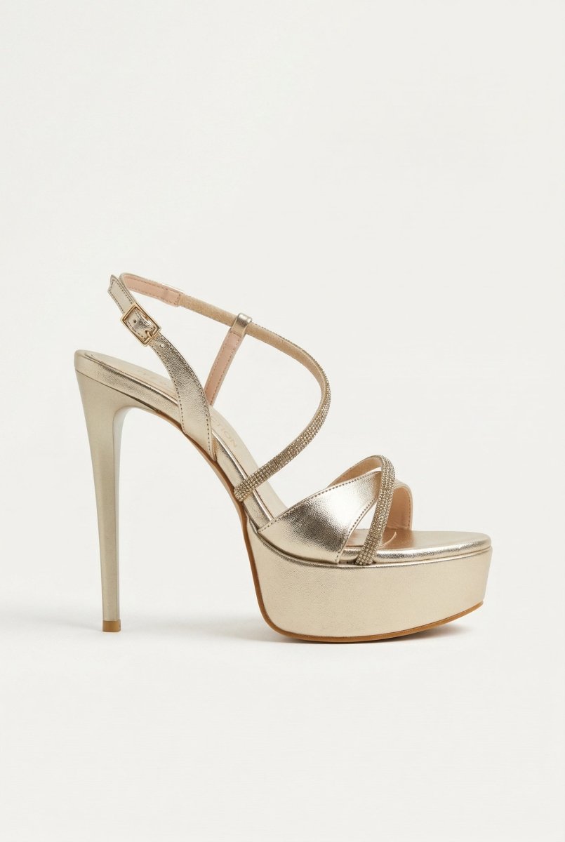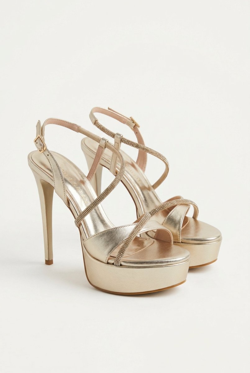 Elevate your evening wear with TFP's Platform Stiletto Sandals in luxurious gold. These sophisticated heels feature crystal-embellished straps and a secure side buckle, delivering both glamour and stability. Designed for the modern woman who refuses to compromise between style and comfort, these platform stilettos offer a refined lift with a sleek silhouette that complements any formal or semi-formal occasion.