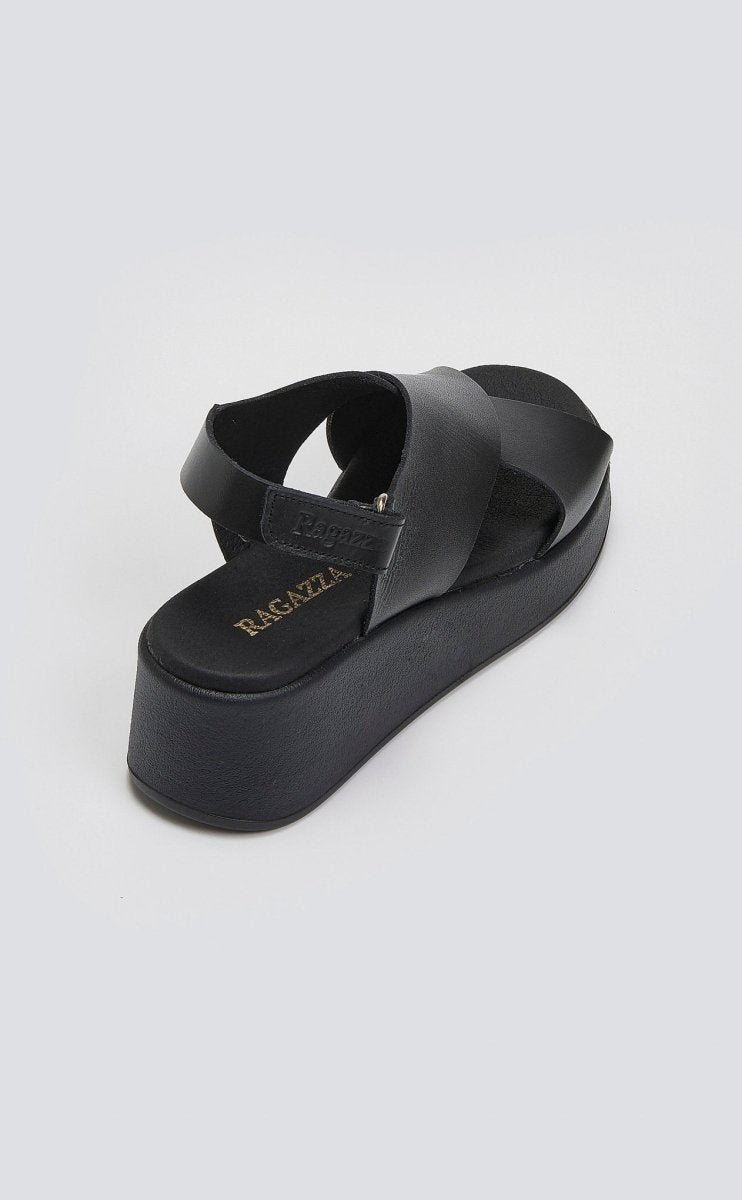 Πλατφόρμες δερμάτινες Ragazza. Crossover φαρδιές φάσες με velcro δέσιμο στο πλάι. Η Ελληνική εταιρία Ragazza ειδικεύεται στα ανατομικά (comfort) παπούτσια τα οποία διαθέτουν την κορυφαία τεχνολογία Dryflex στο εσωτερικό τους, που προσφέρει απόλυτη διαπνοή, απορρόφηση κραδασμών και προστασία από οσμές. Είναι η ιδανική επιλογή για ατελείωτες ώρες βαδίσματος και άνεσης.