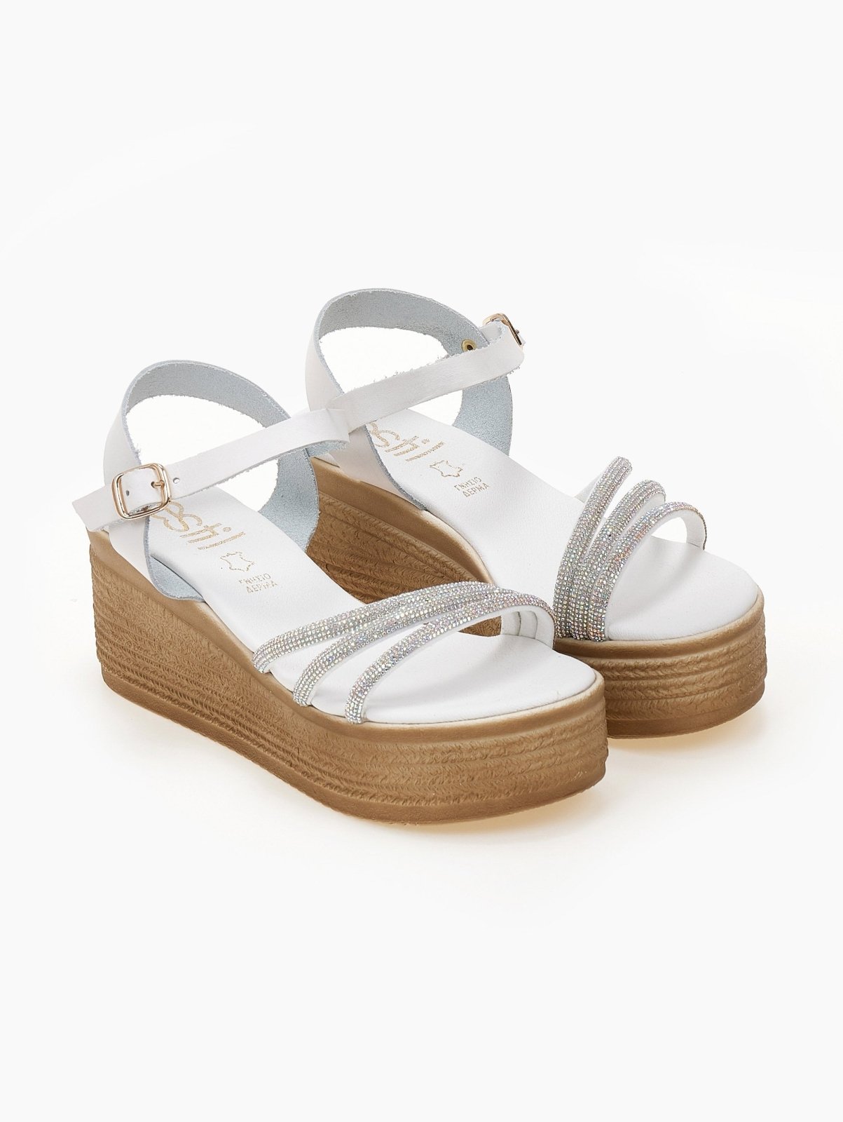 ESTIL δερμάτινες πλατφόρμες με strass λουράκια. Δένουν με λουράκι στο ύψος του κουτεπιέ. Δερμάτινος πάτος με ενίσχυση. Ελληνικής κατασκευής.
