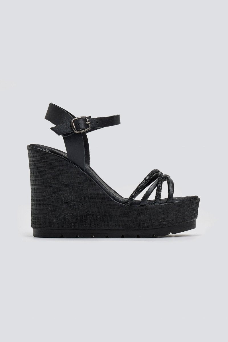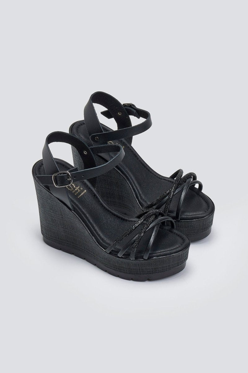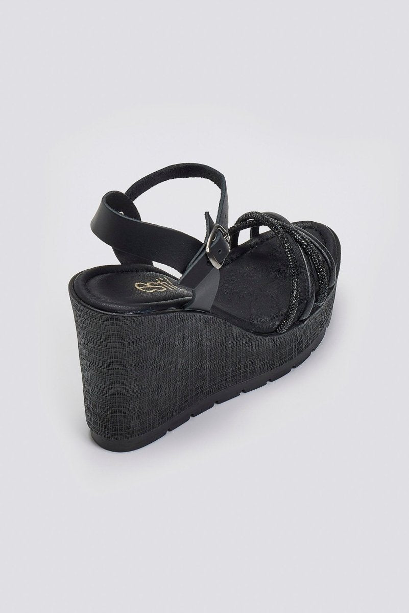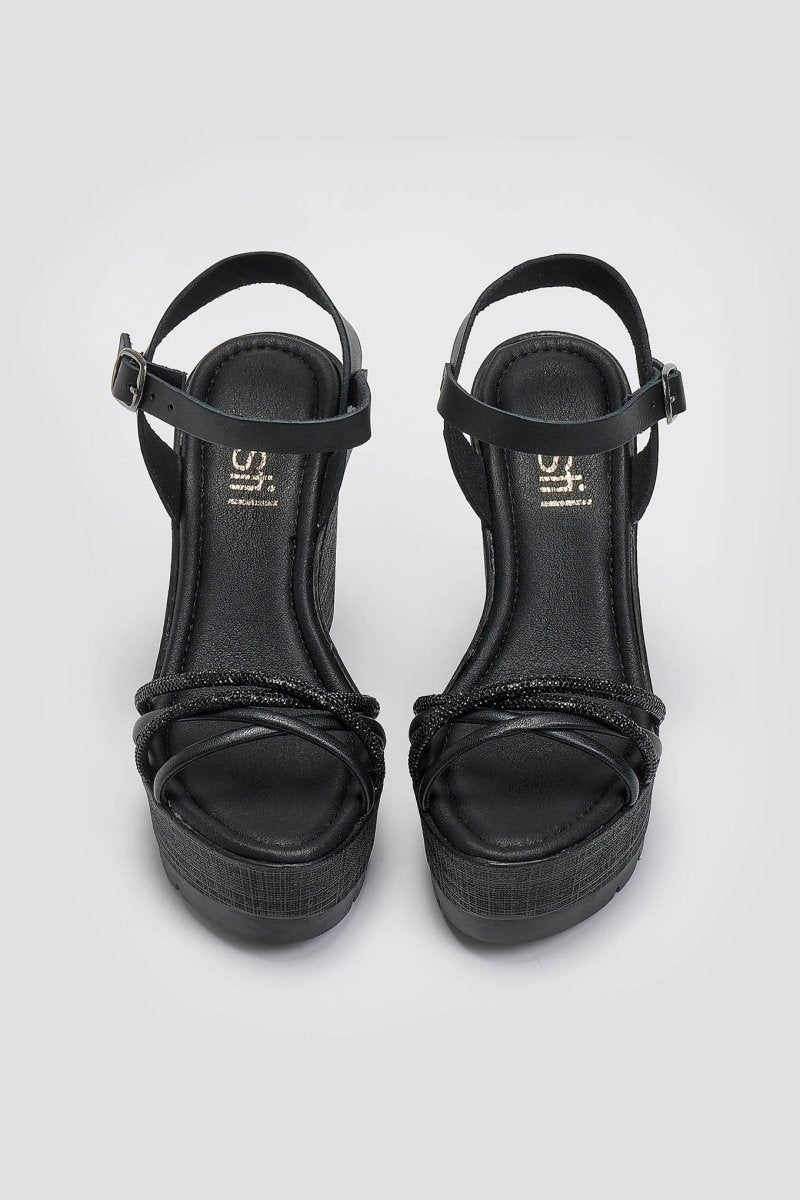 Πλατφόρμες με crossover λουράκια και στρας Estil. Δένουν με μπαρέτα στο ύψος του κουτεπιέ. Μαλακός πάτος με ενίσχυση. Ελληνικής κατασκευής.