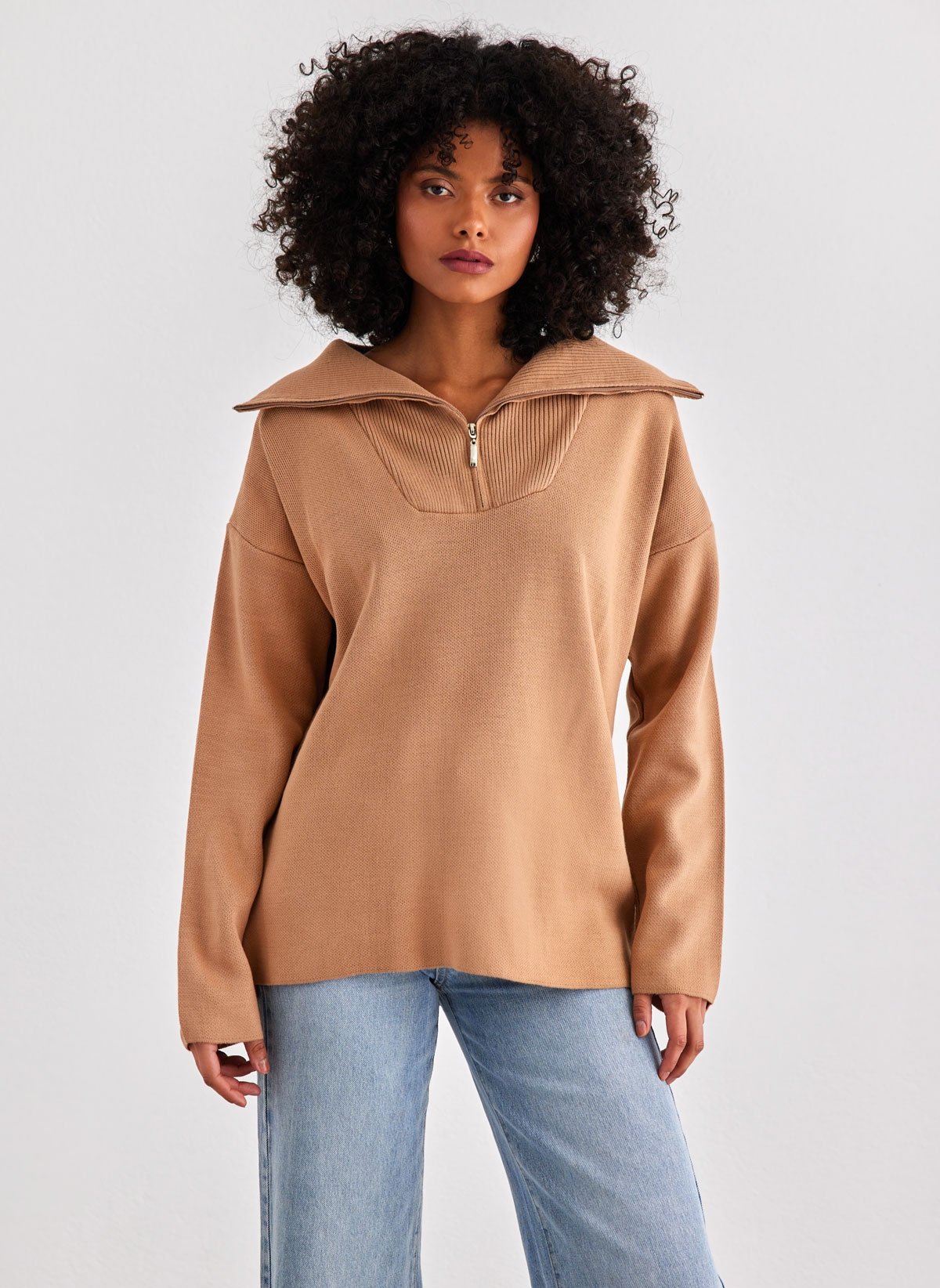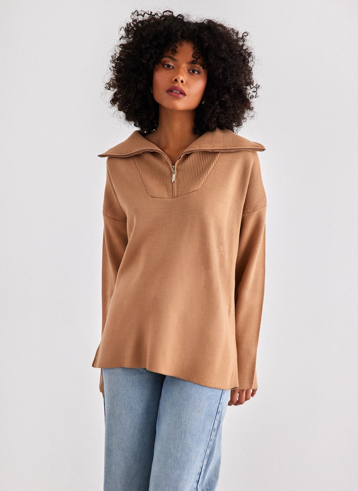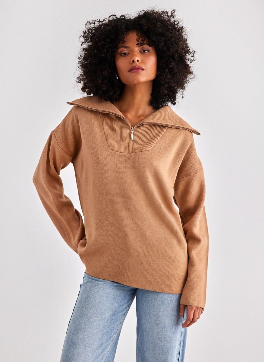 Πλεκτή μπλούζα με ψηλό γιακά με φερμουάρ BISOU - Caramel
