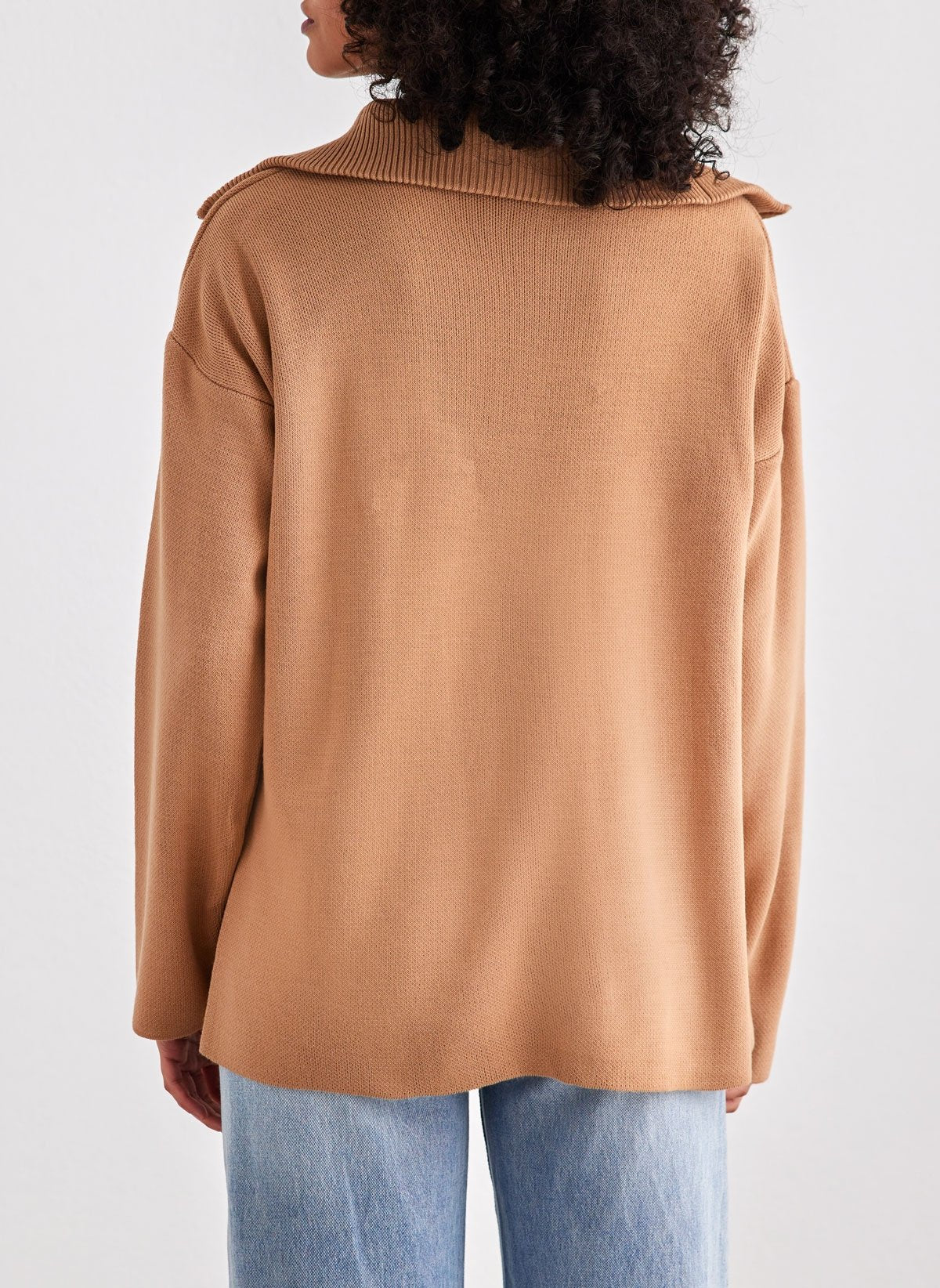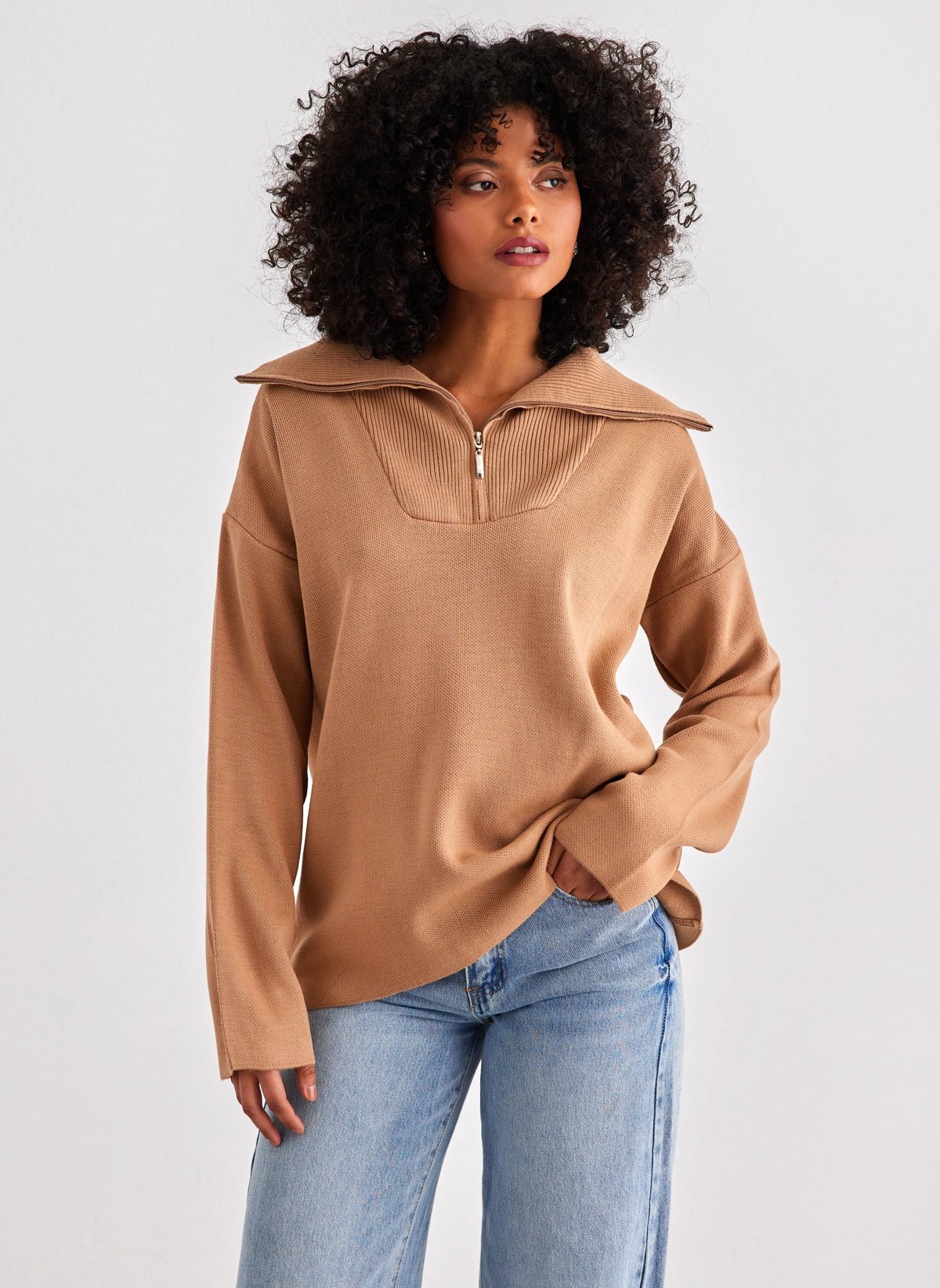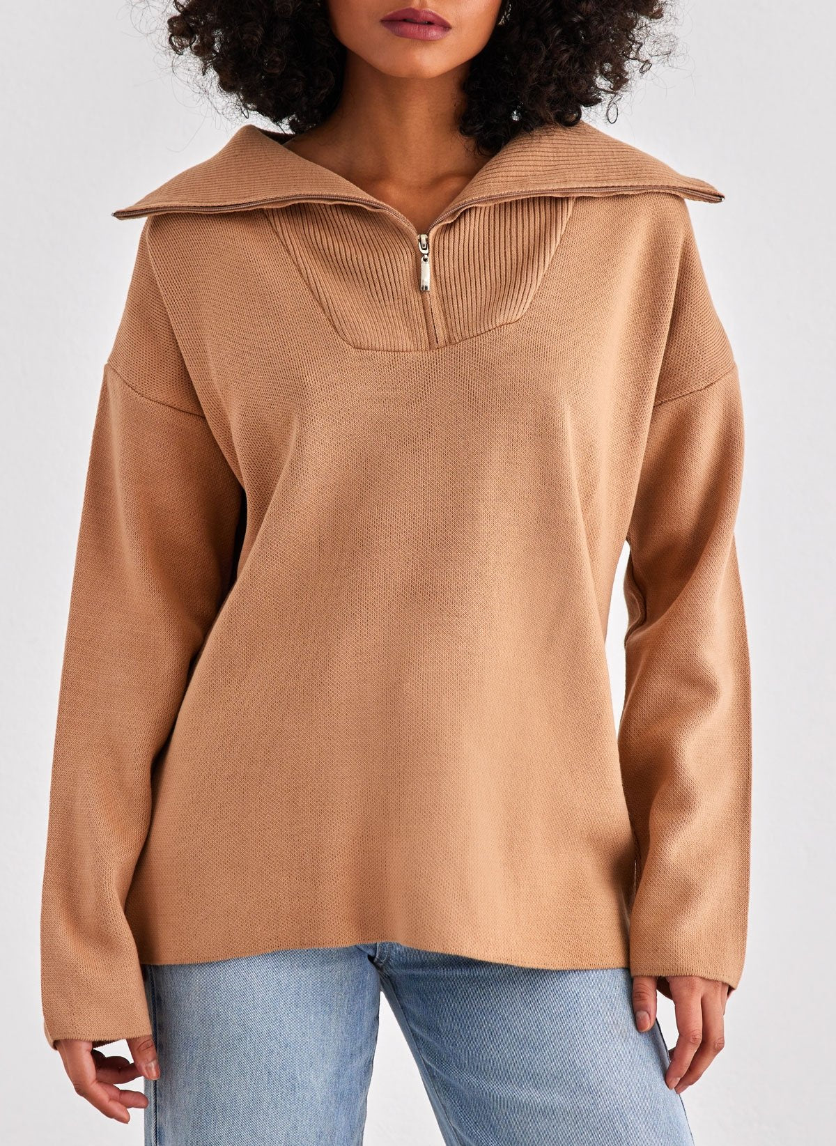 Πλεκτή μπλούζα με ψηλό γιακά με φερμουάρ BISOU - Caramel