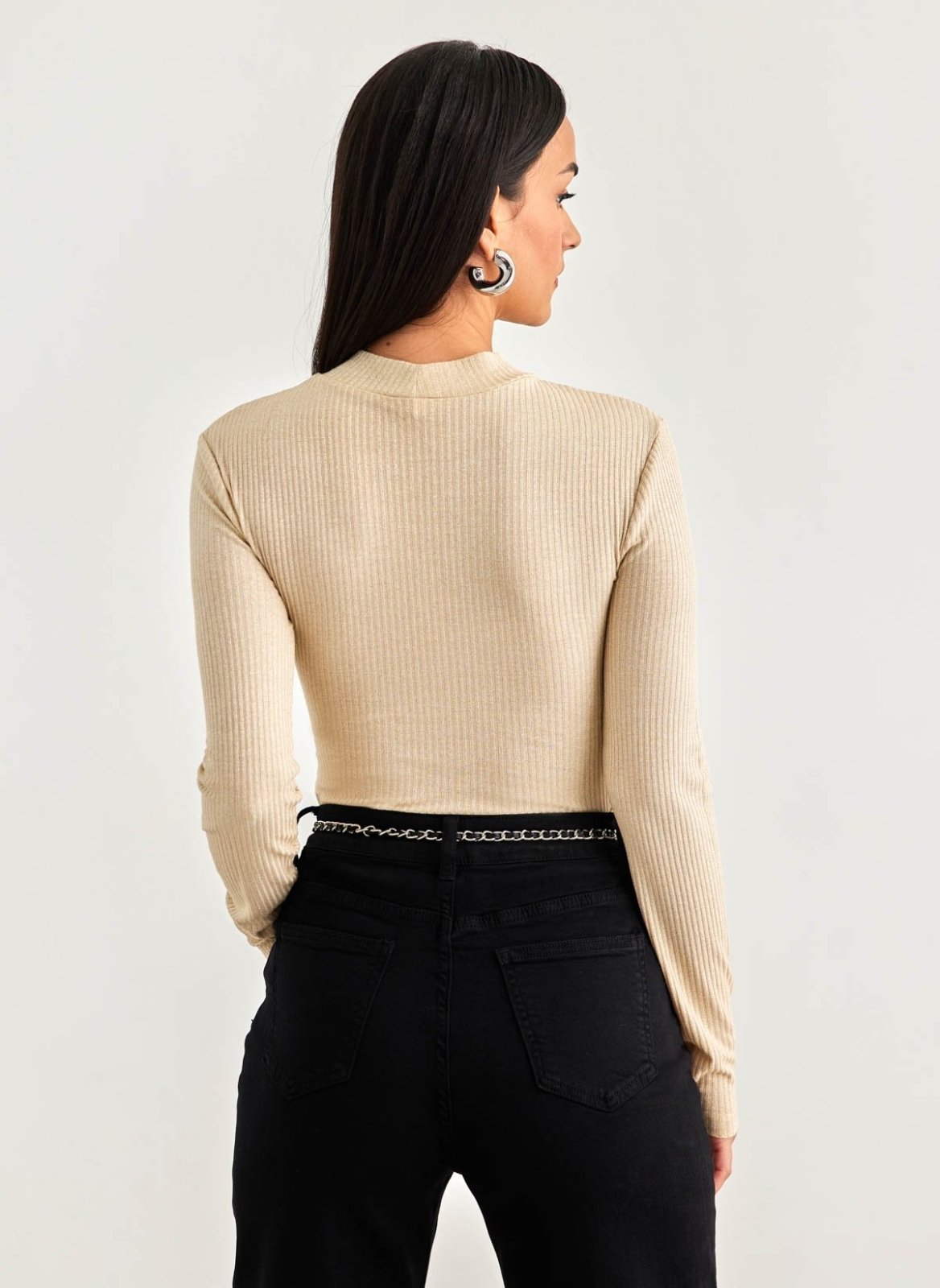 Λεπτό lurex πλεκτό ONLY. Έχει ψηλή λαιμόκοψη. Ριμπ πλέξη με μεταλλική κλωστή. Εφαρμοστή γραμμή.