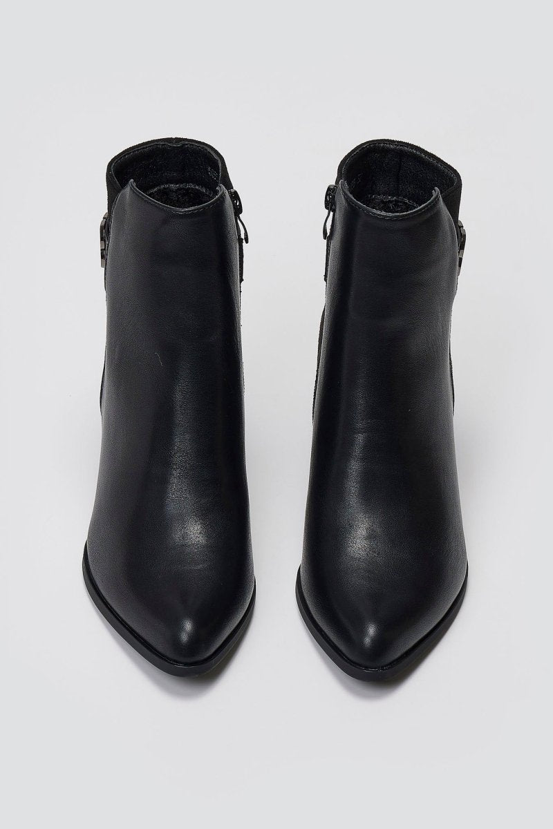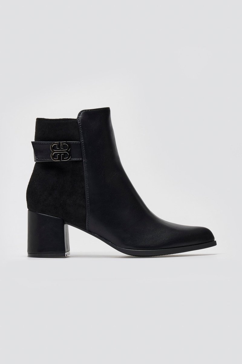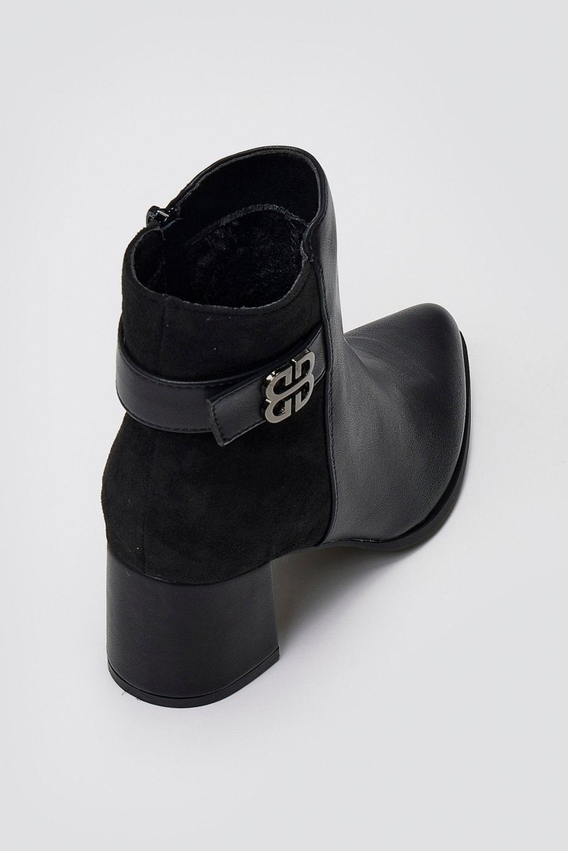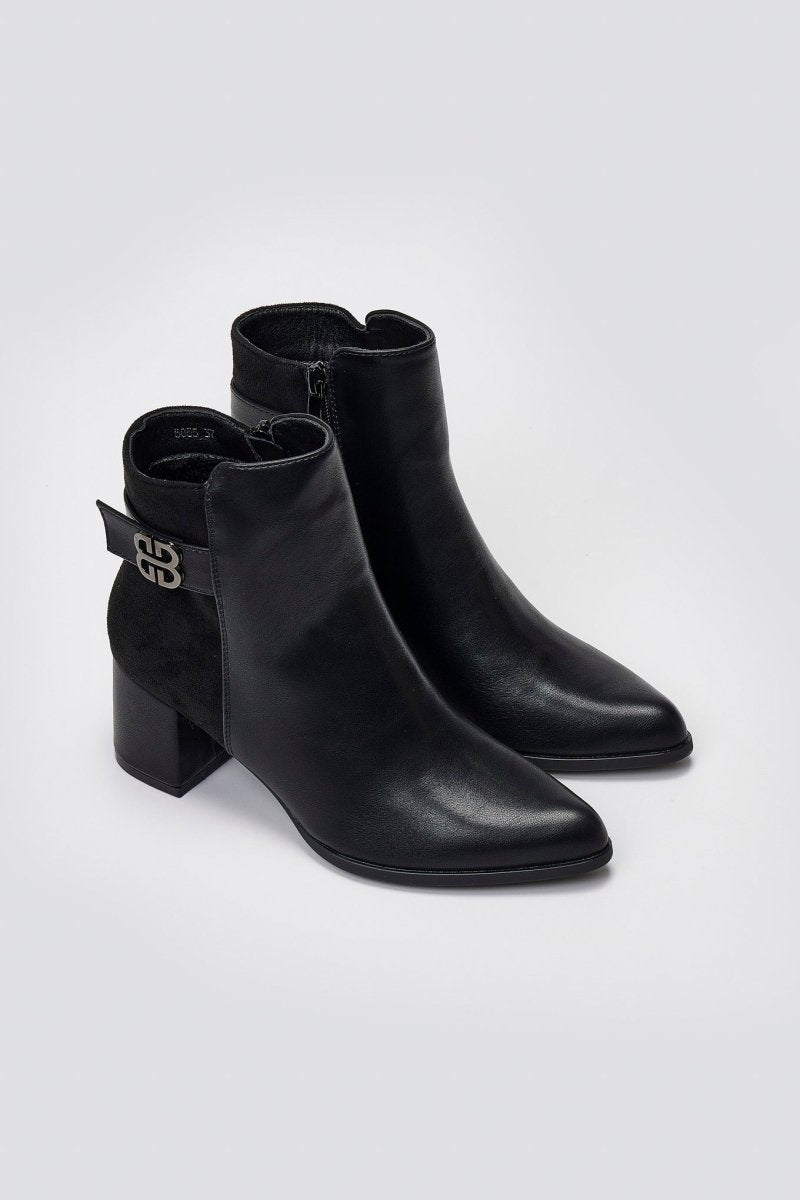 Pointed ankle boots combining suede and faux leather with low block heel, side zipper and metallic detail. Elegant everyday design.