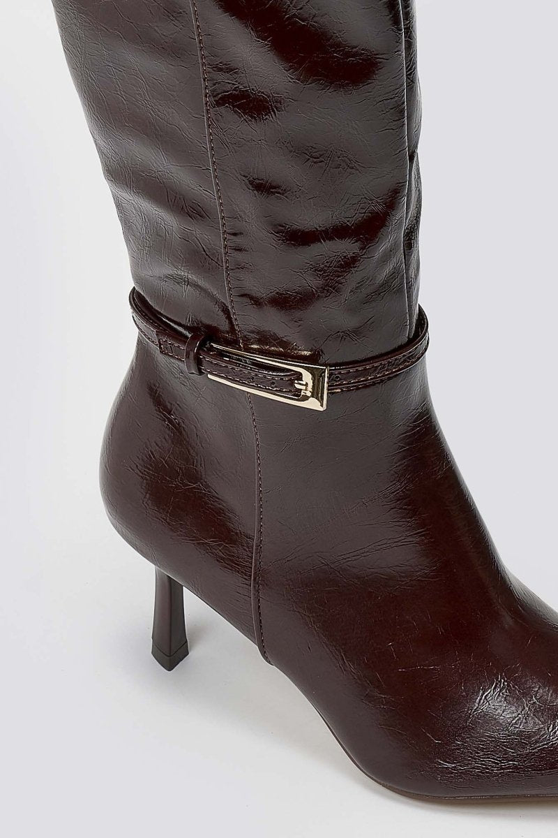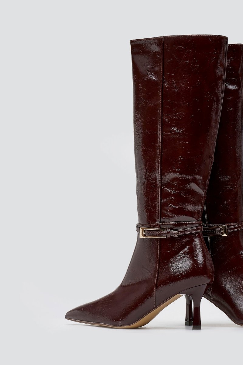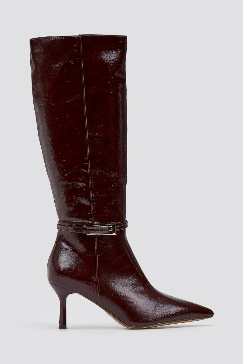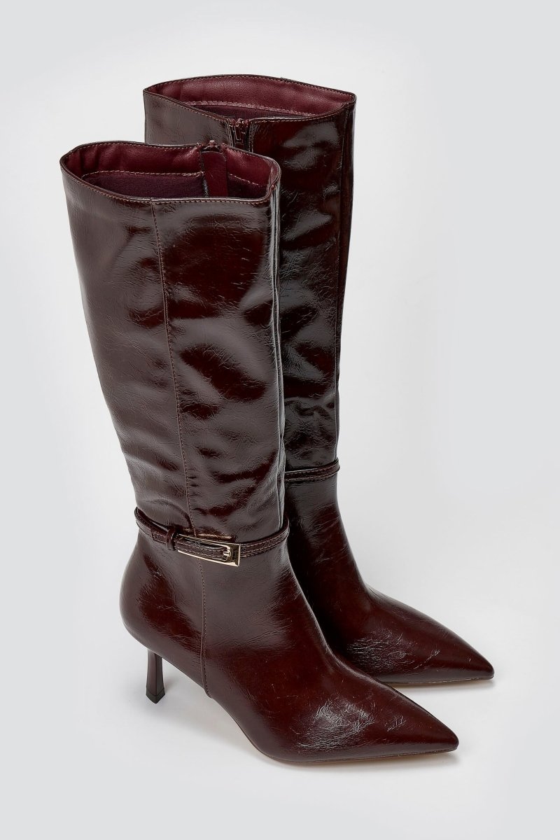 Pointed Boots with Buckle Strap - Burgundy Crinkled Patent