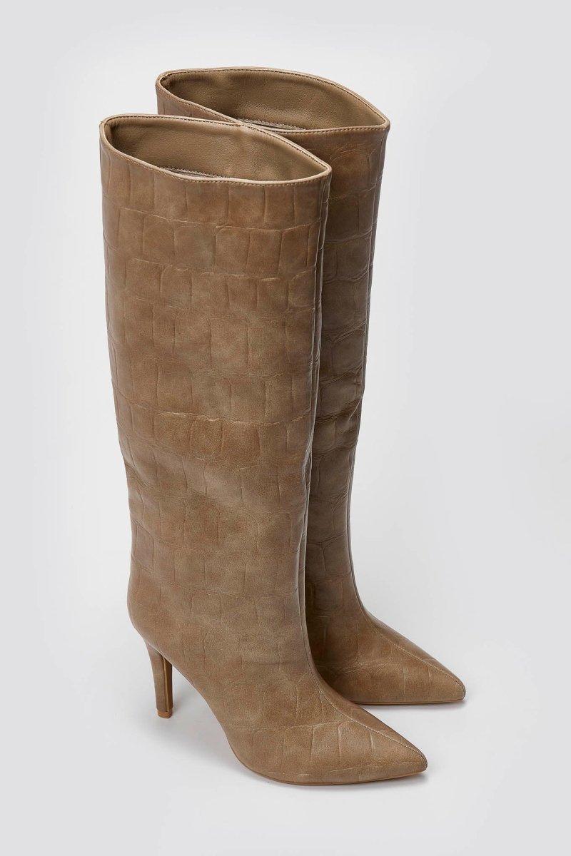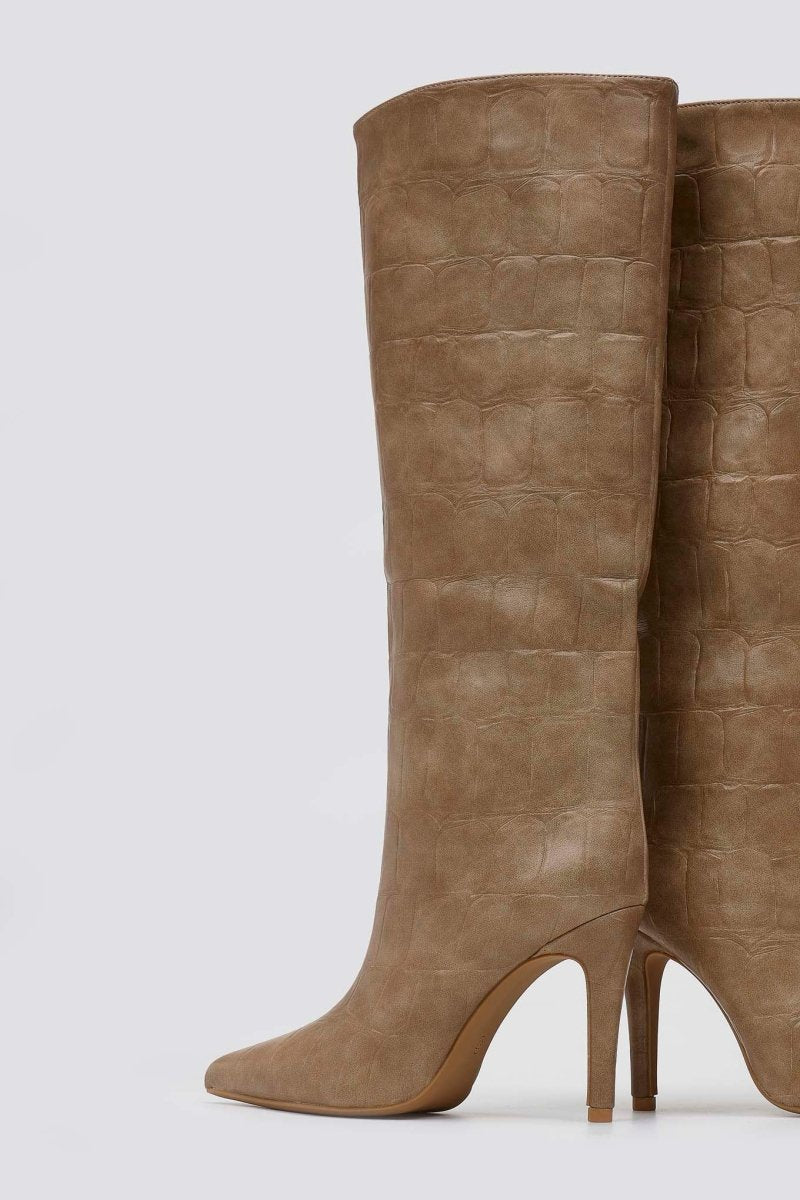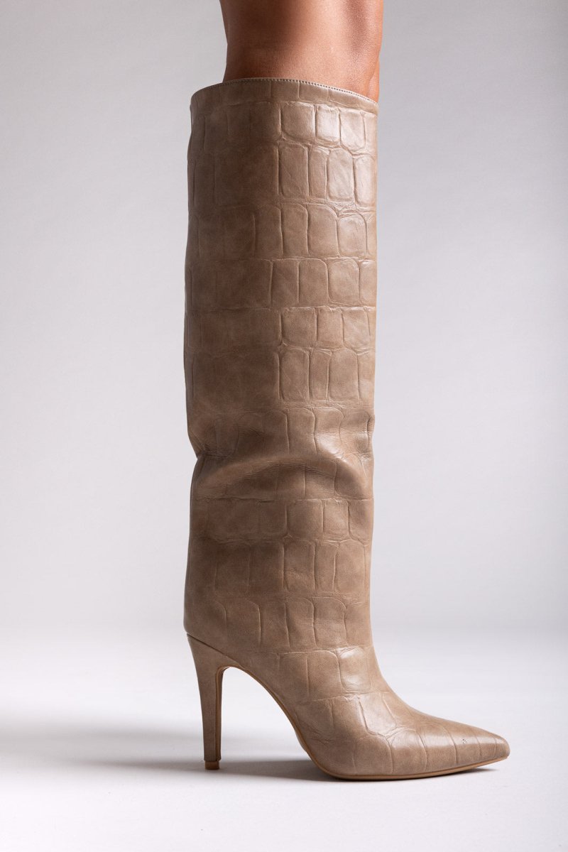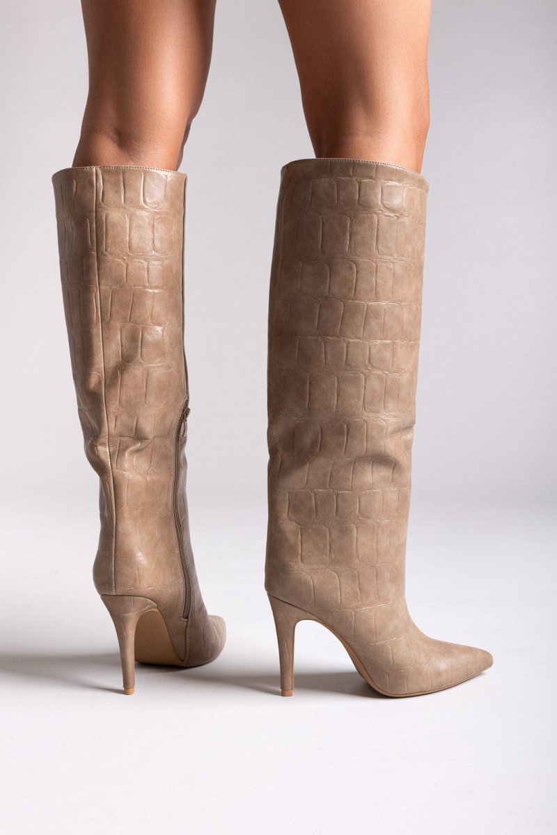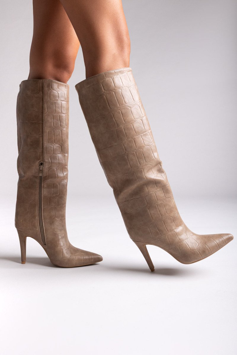 Pointed Croc-Effect Boots with Stiletto Heel - Taupe Croc